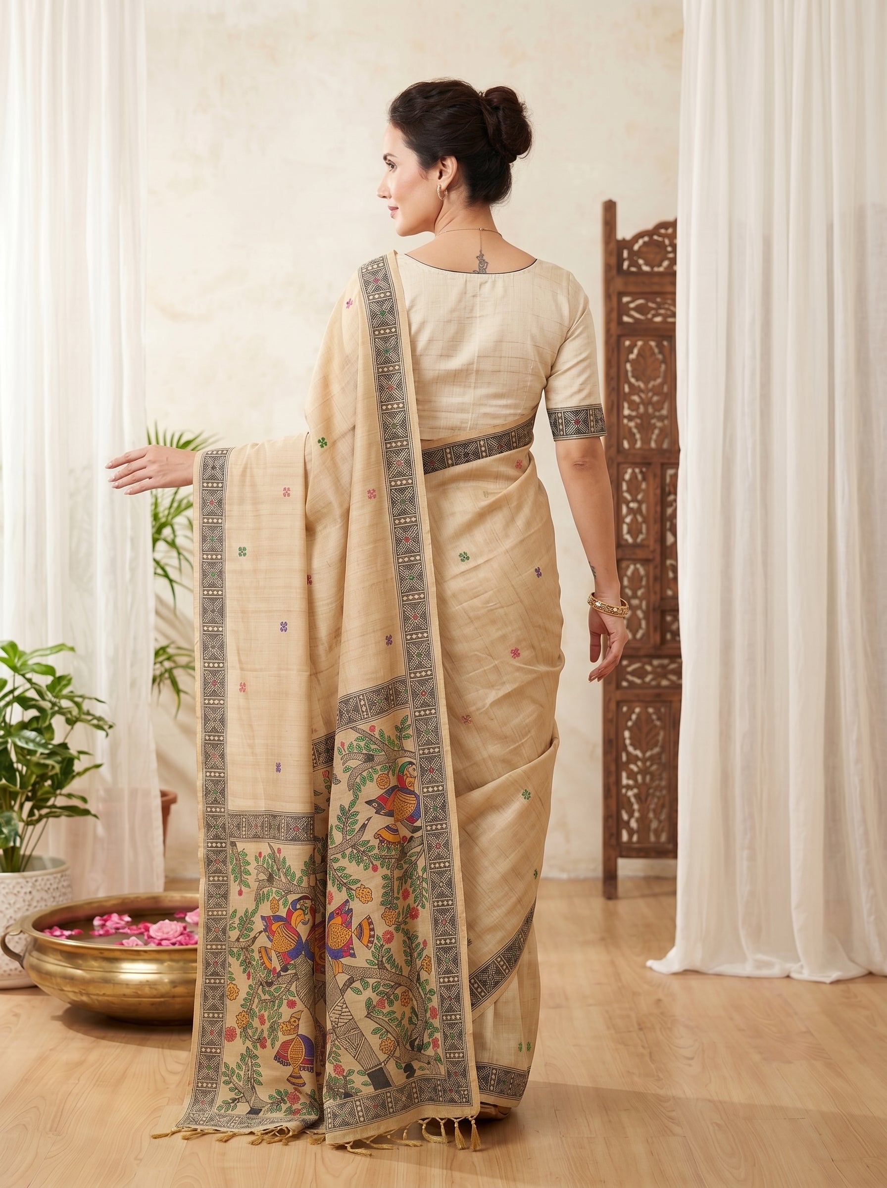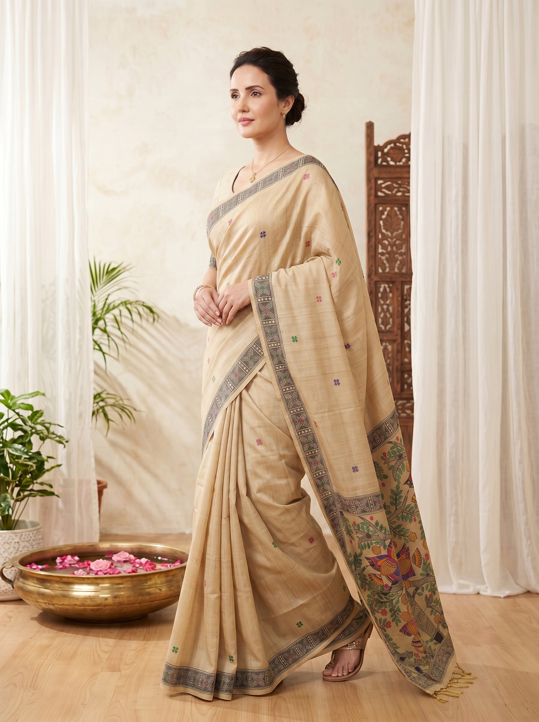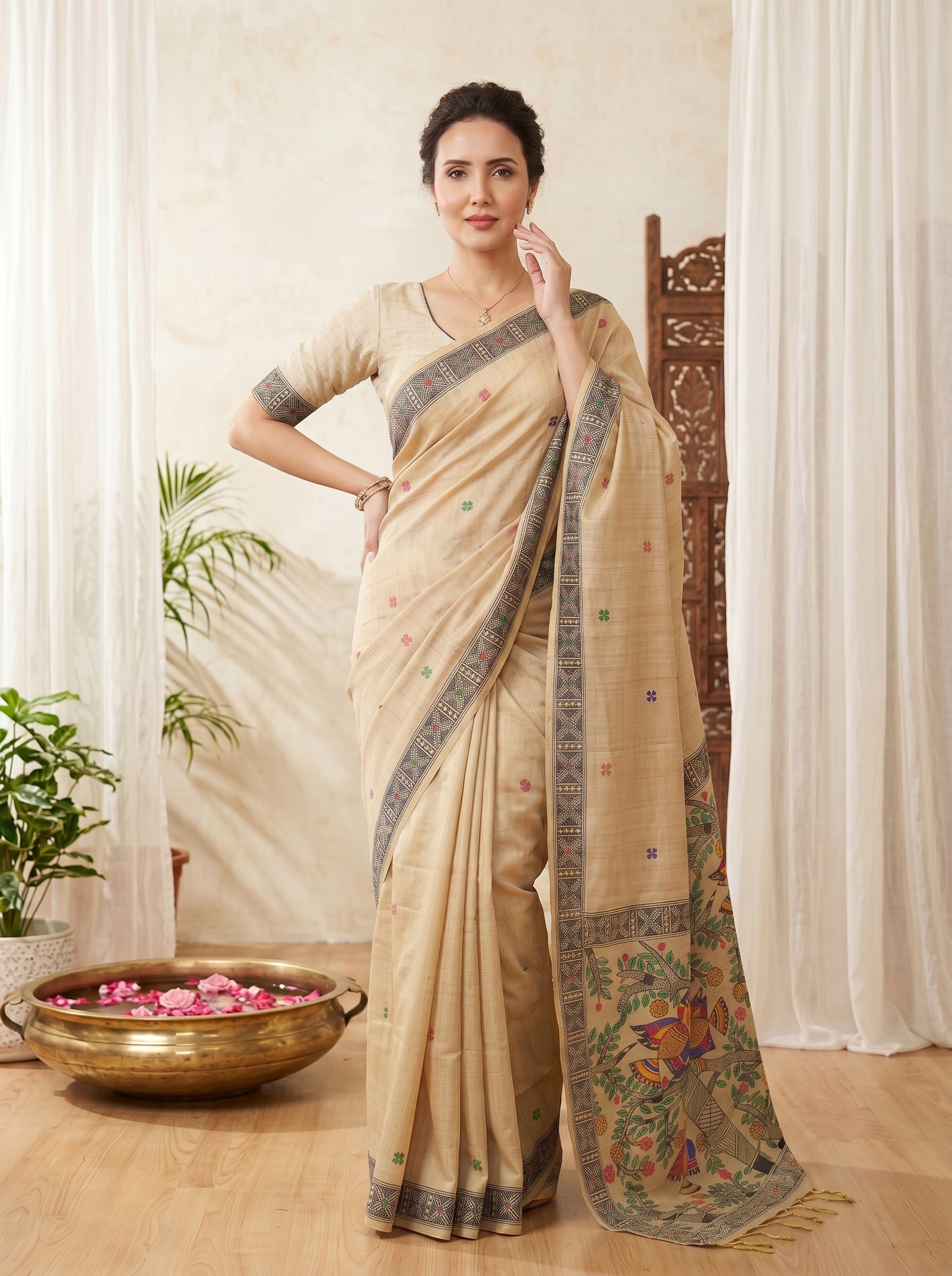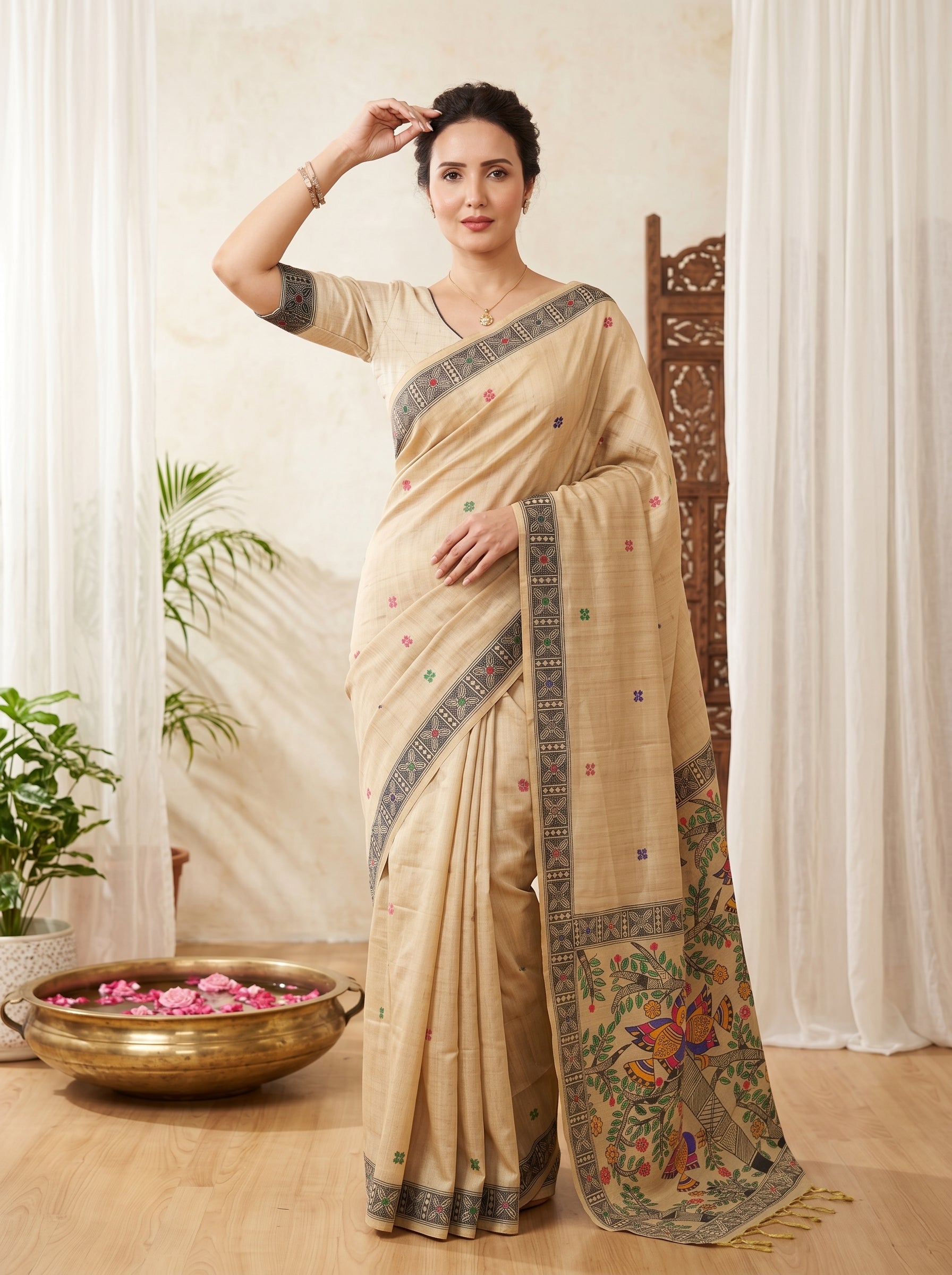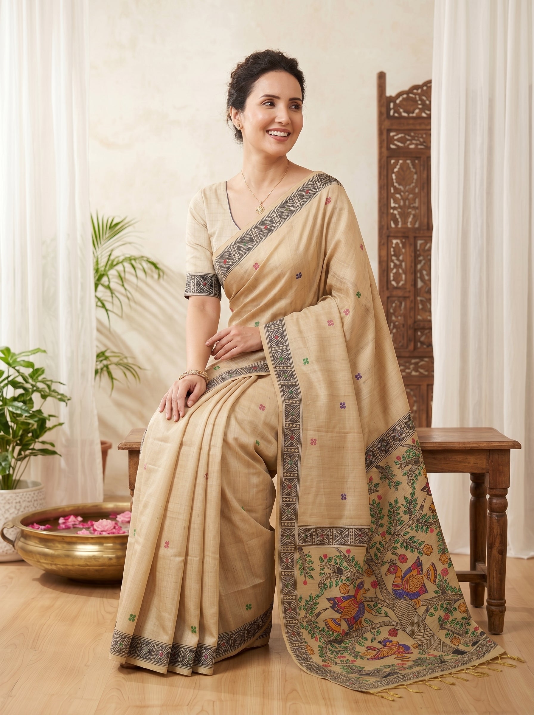 Cream Tussar Silk Madhubani Printed Saree with Zari Woven Border