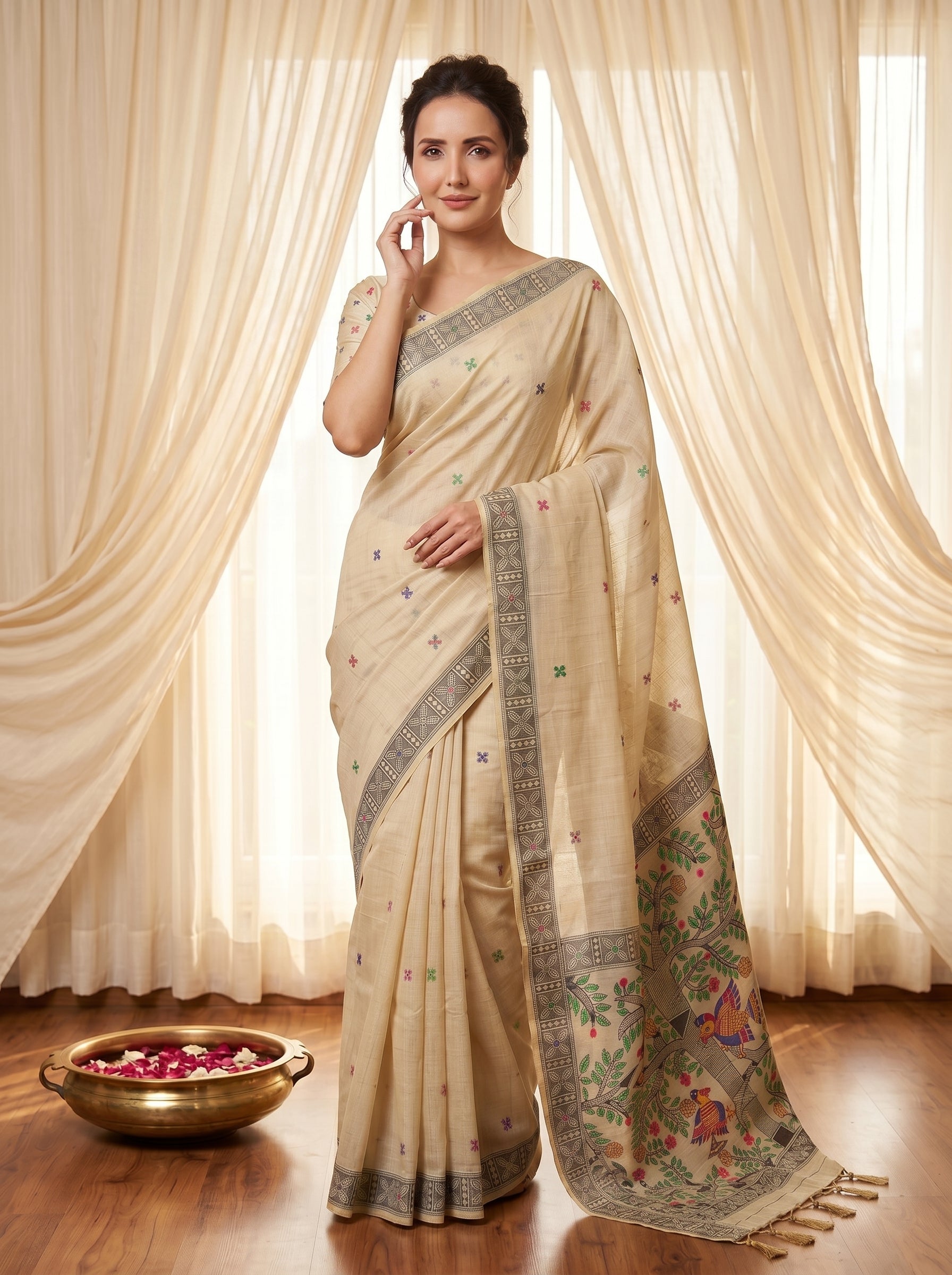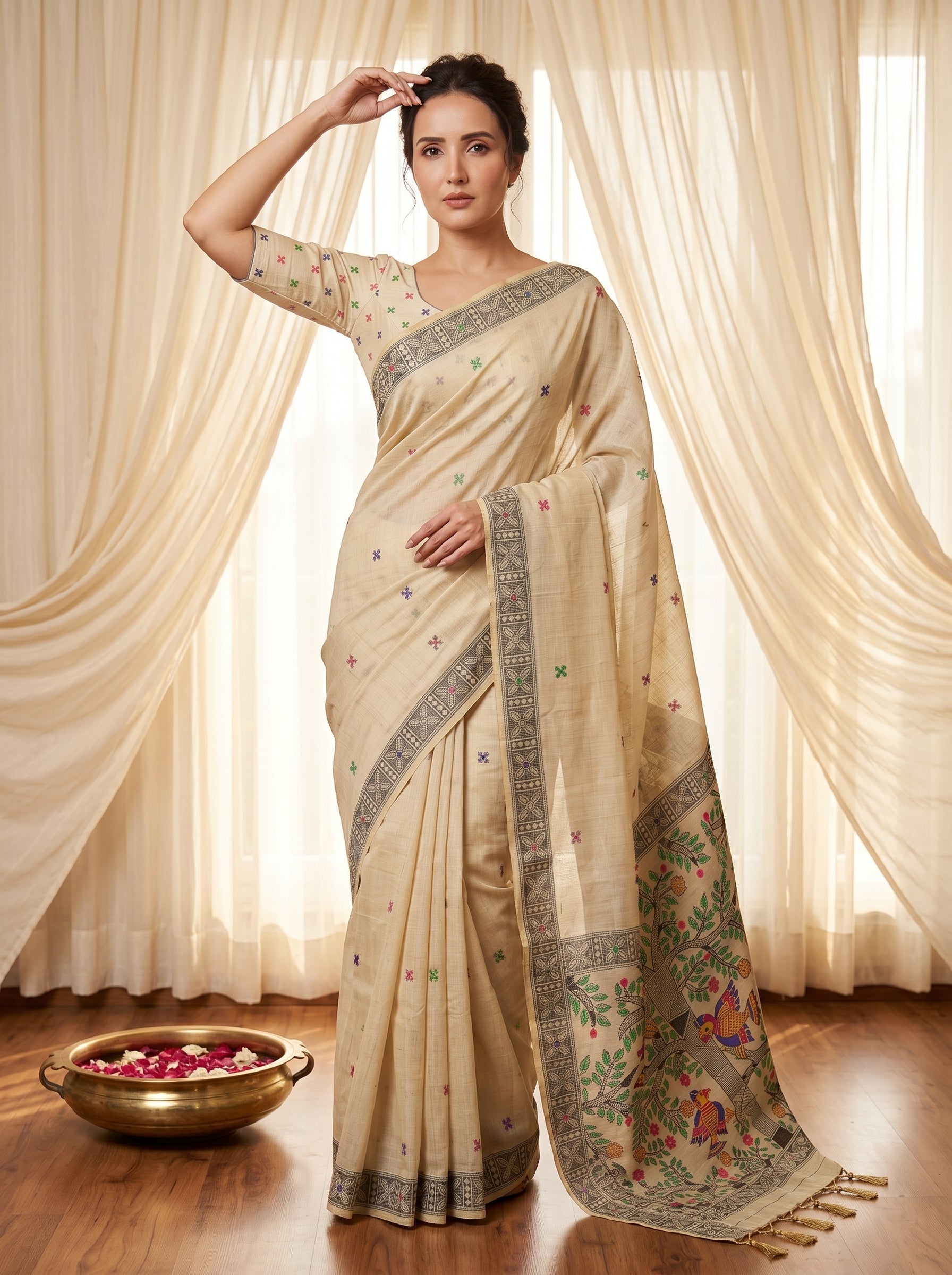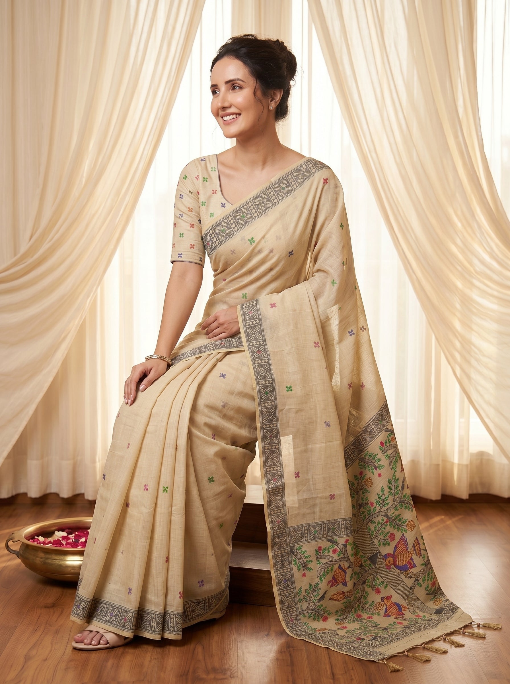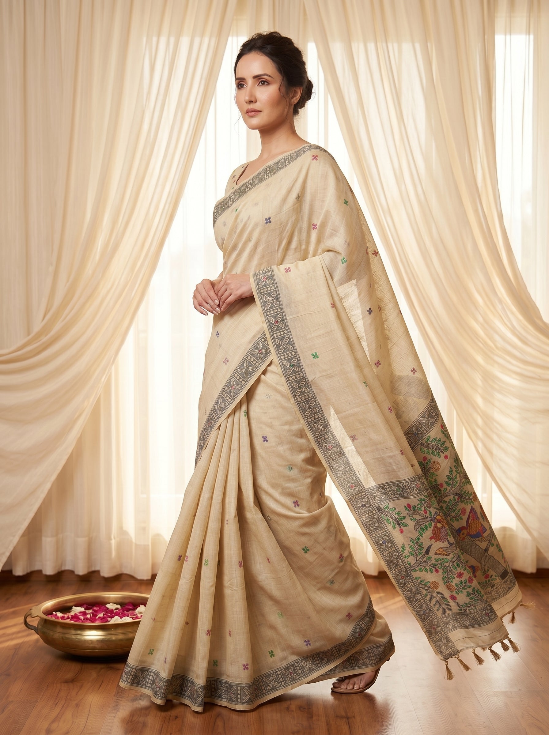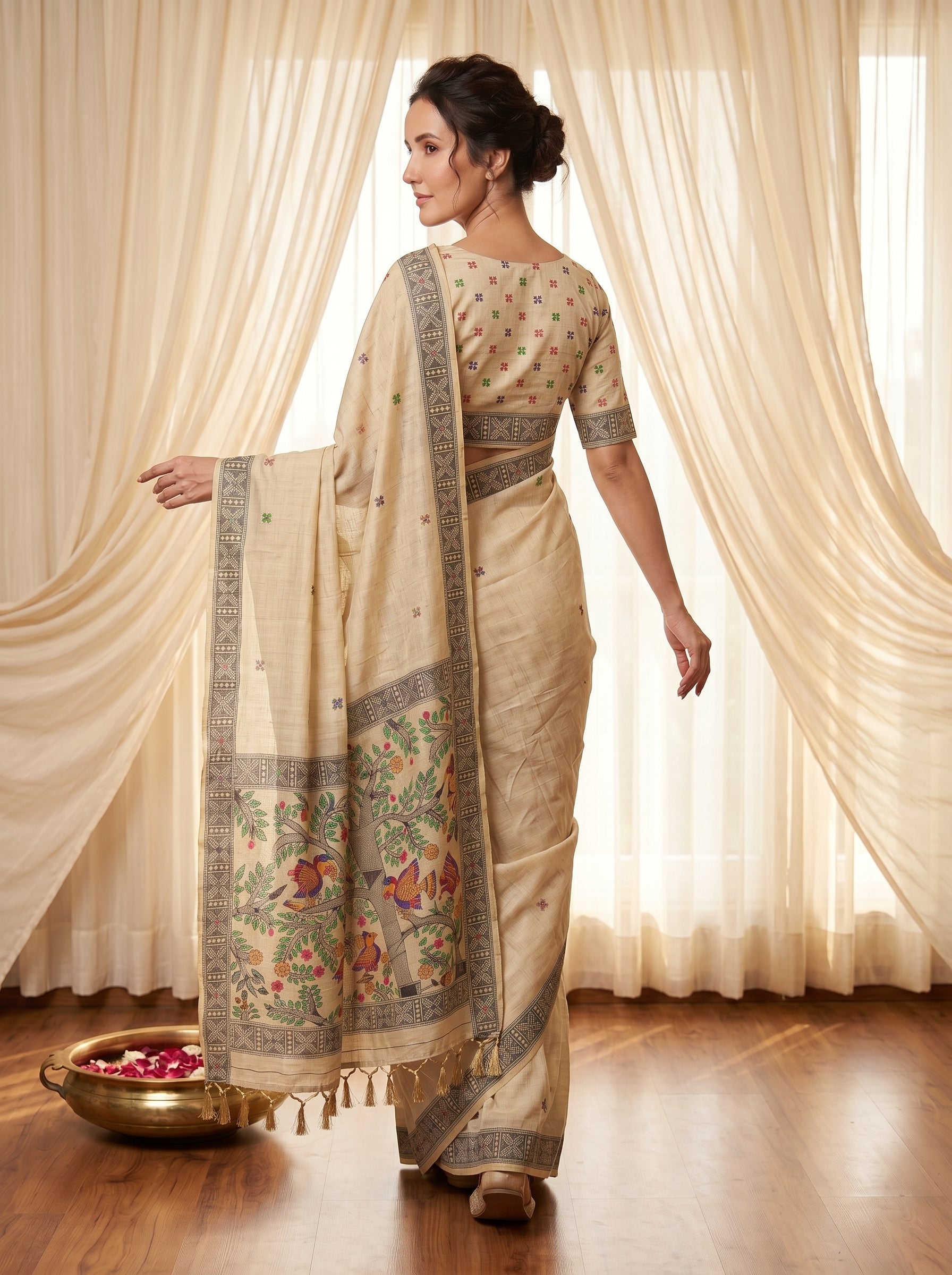 Cream Tussar Silk Madhubani Printed Saree with Zari Woven Border