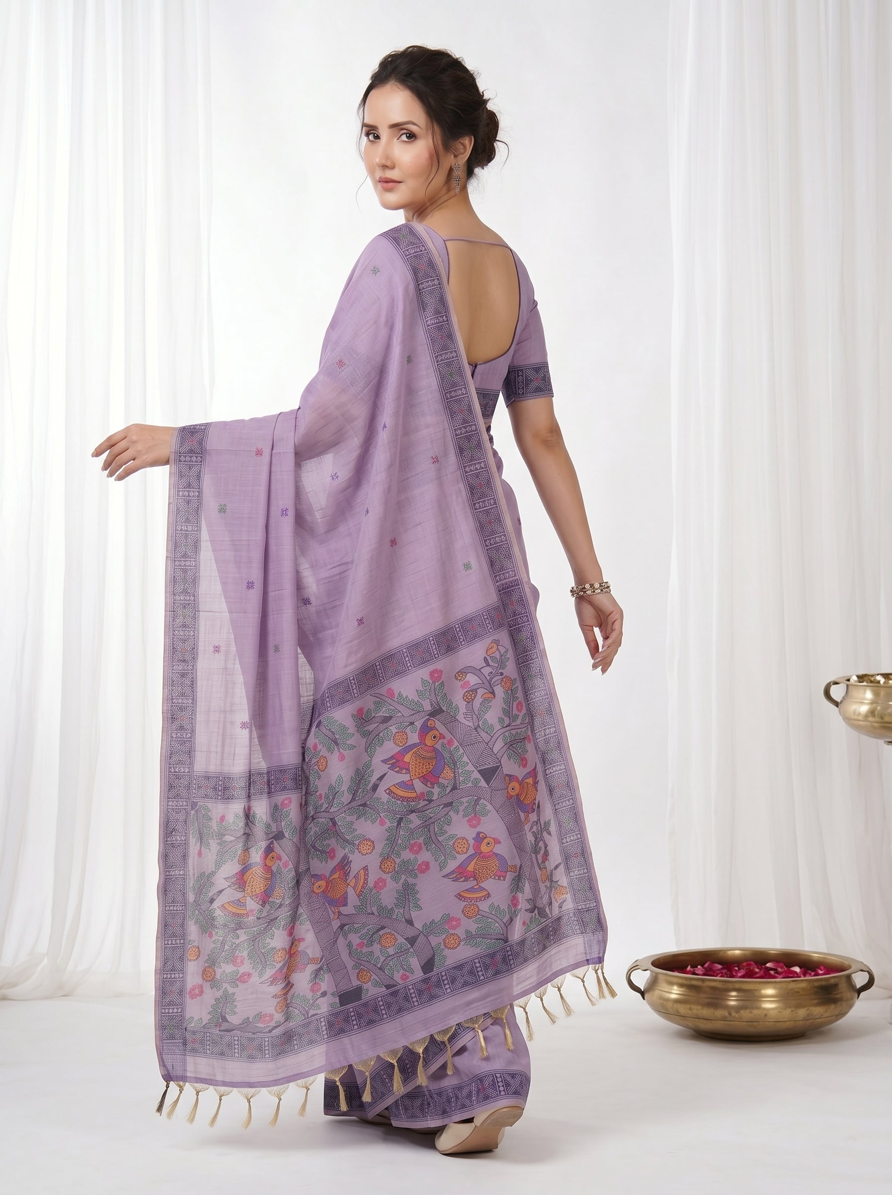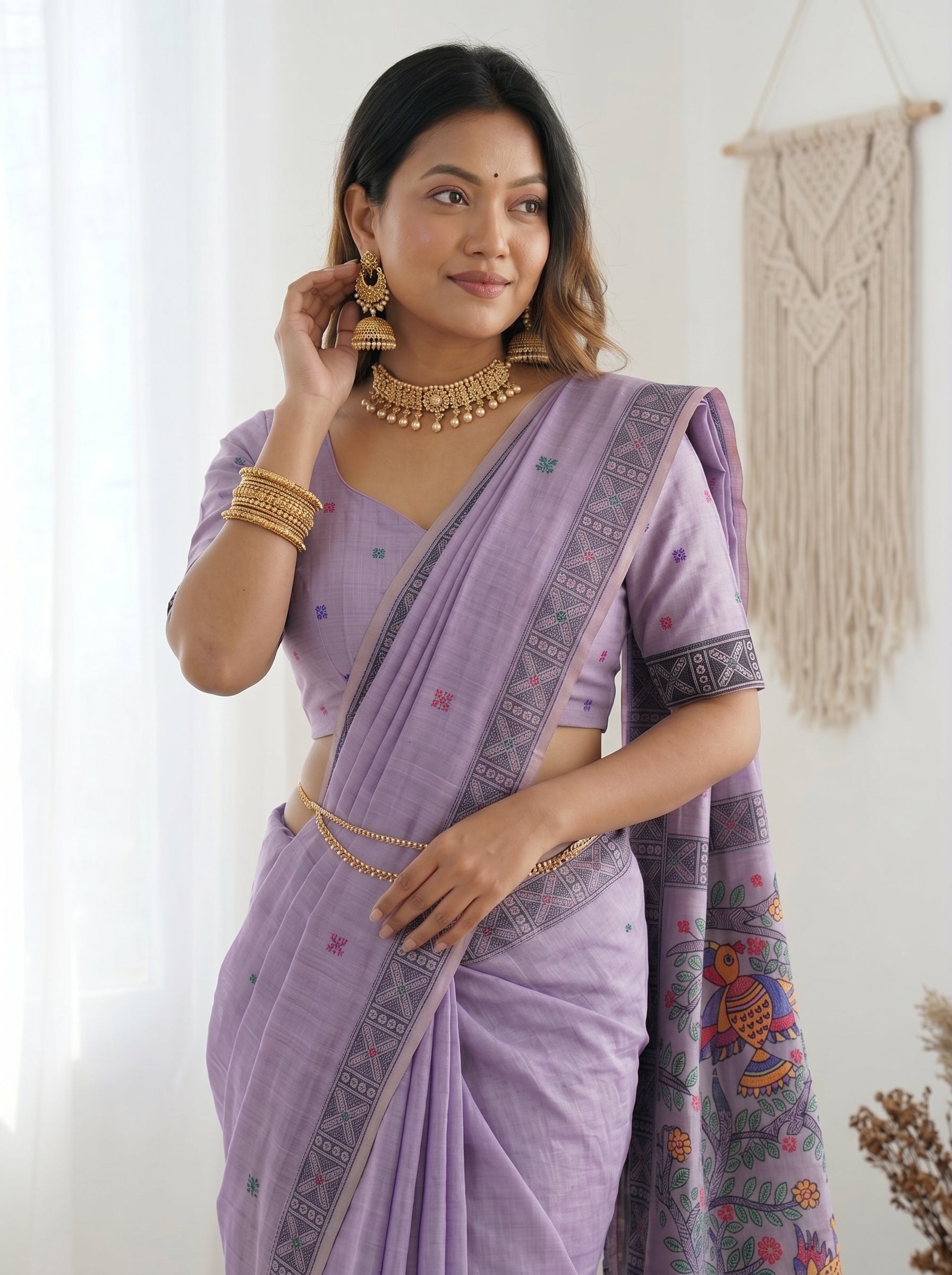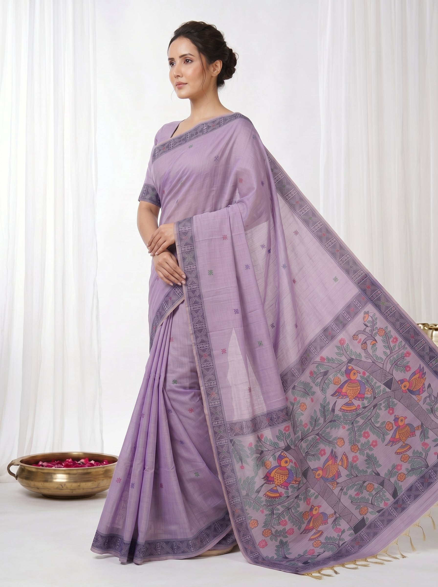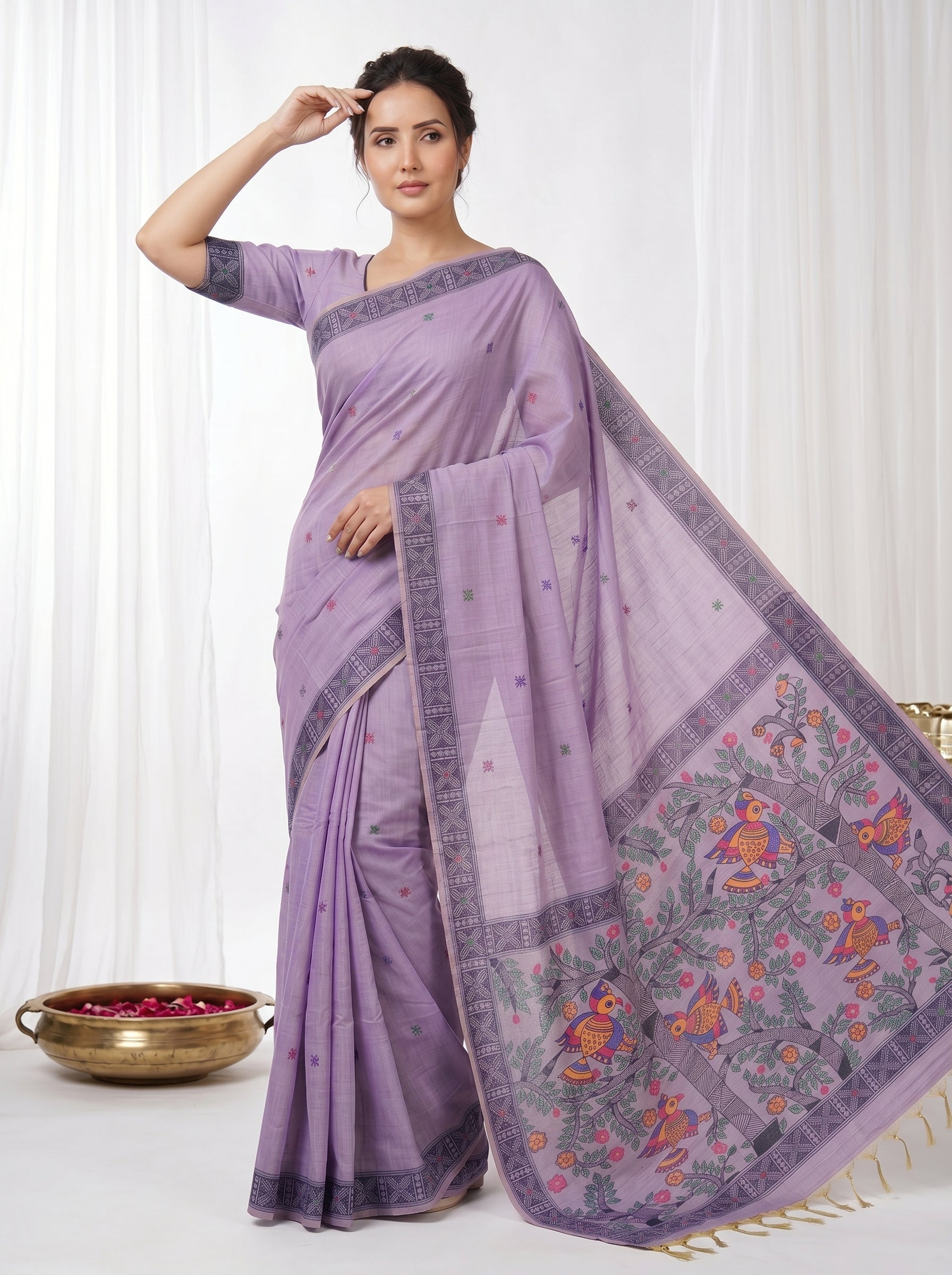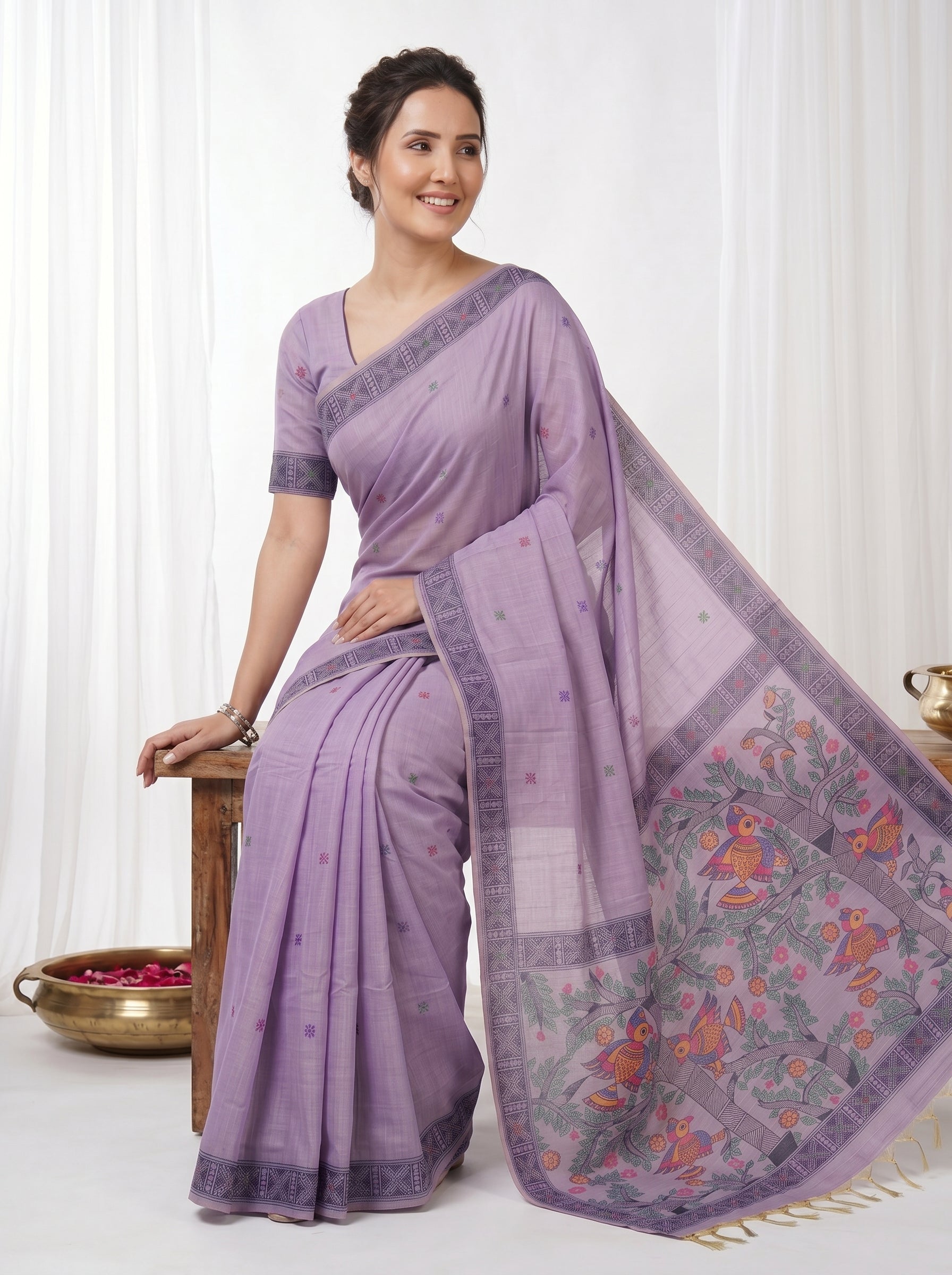 Lavender Muga Cotton Saree For Women Madhubani Print Resham Weaving Soft Cotton Saree Traditional Handloom Saree With Blouse