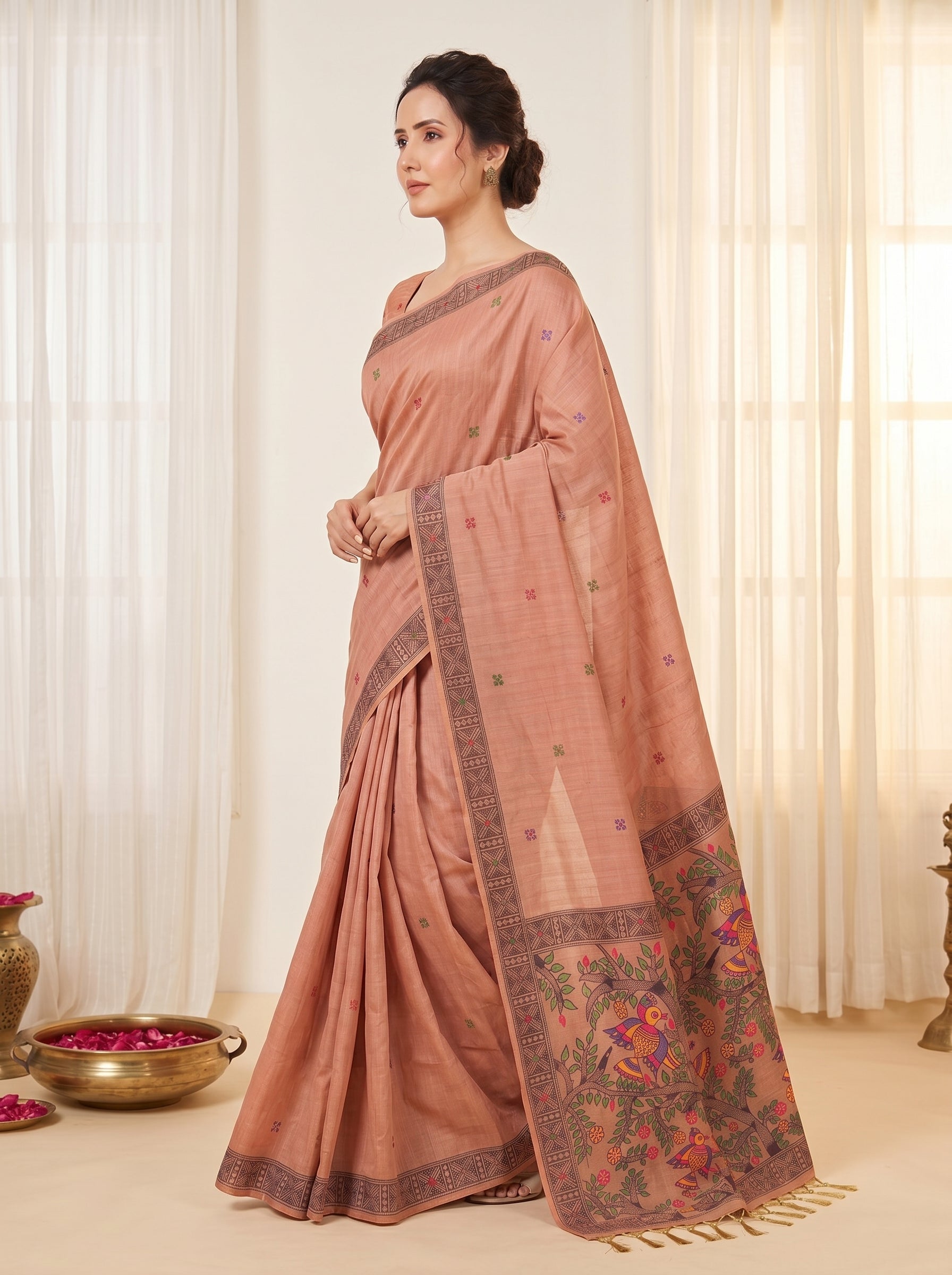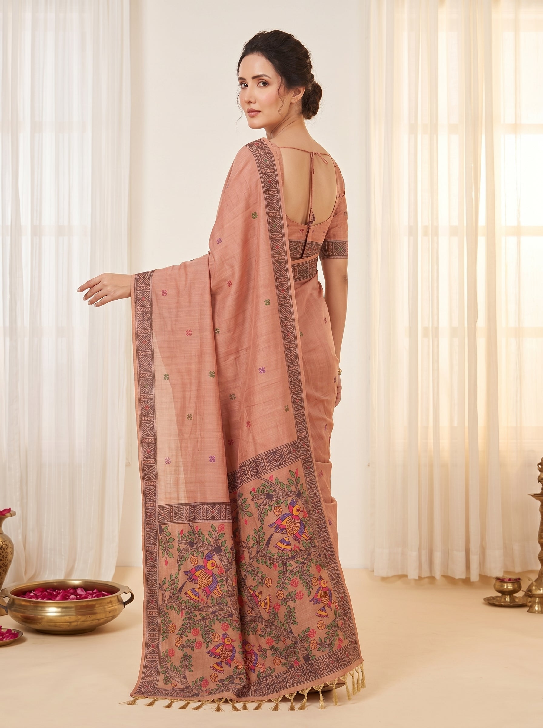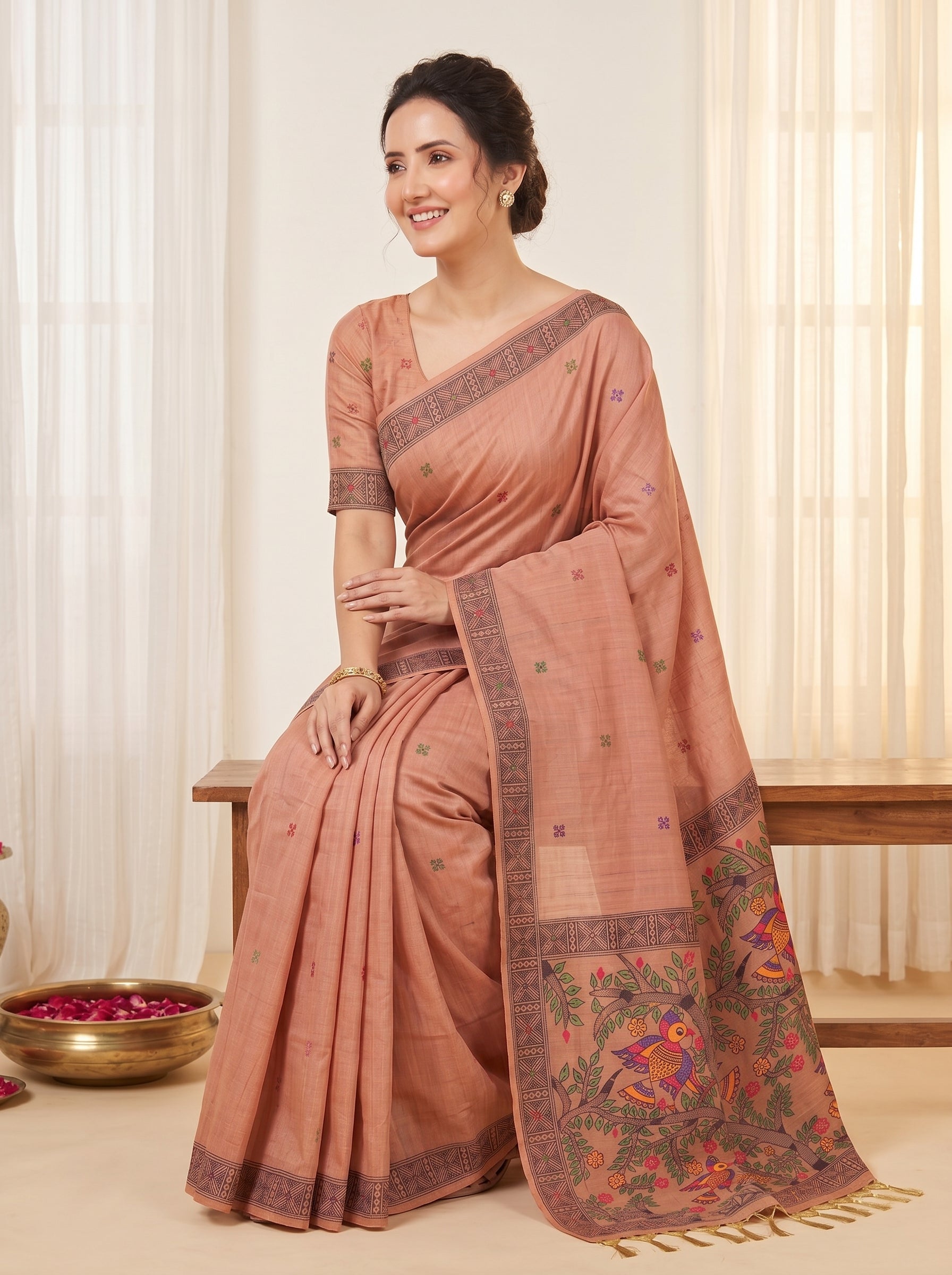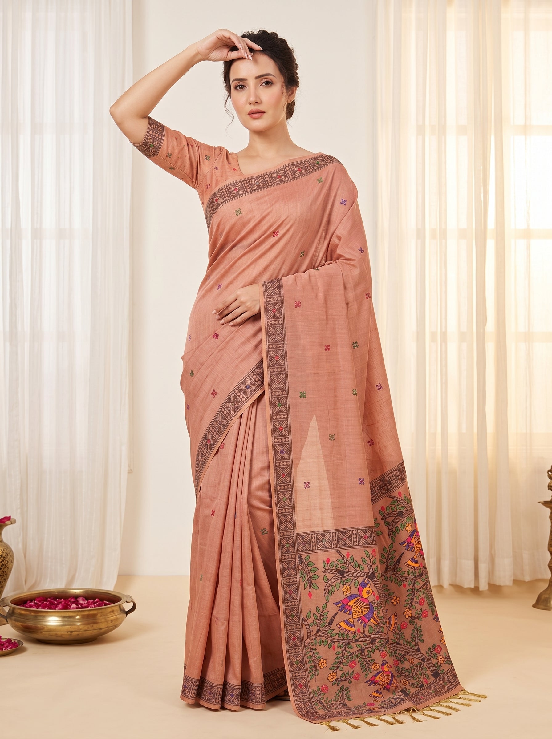 Peach Muga Cotton Saree For Women Madhubani Print Resham Weaving Soft Cotton Saree Traditional Handloom Saree With Blouse