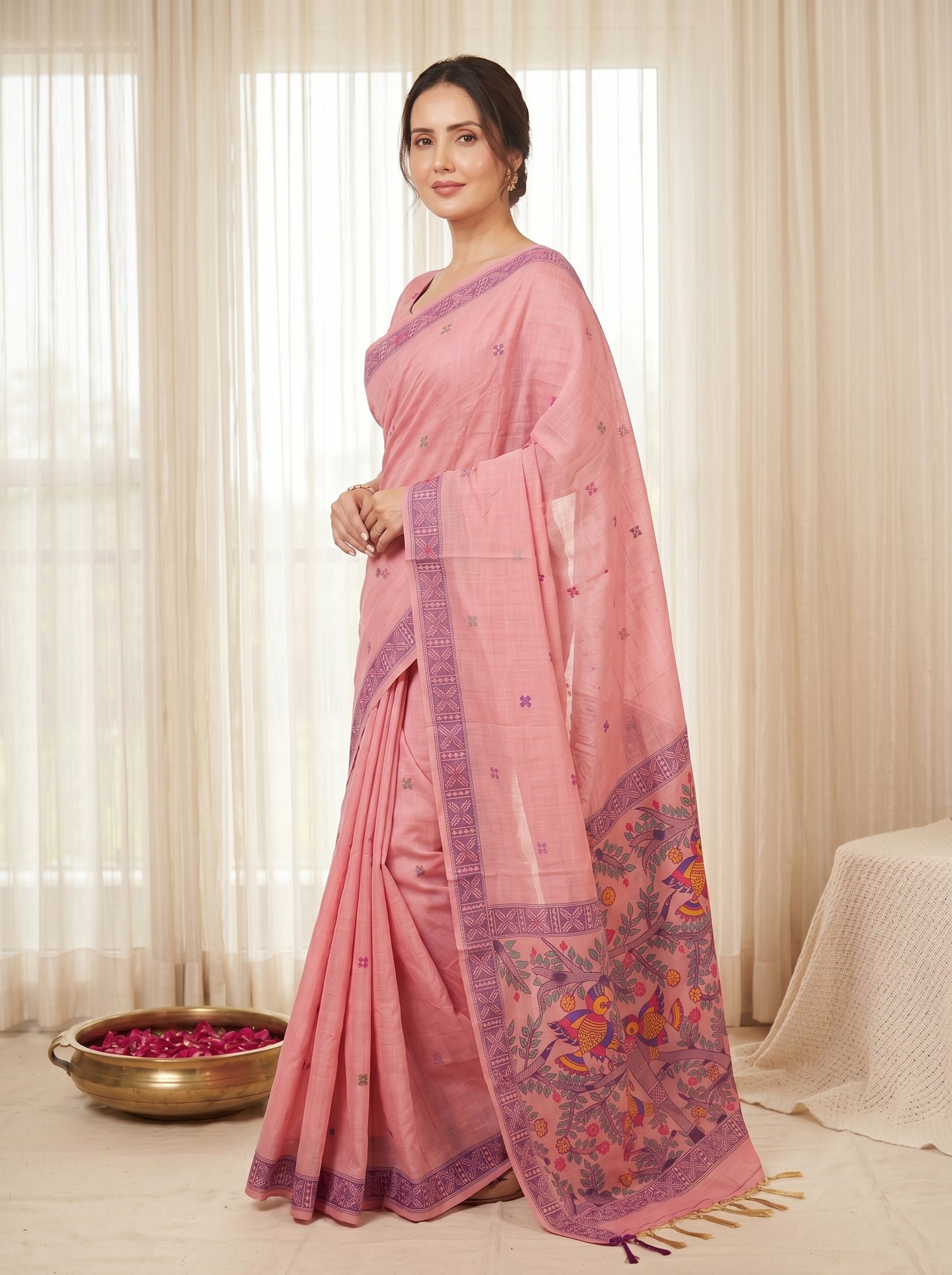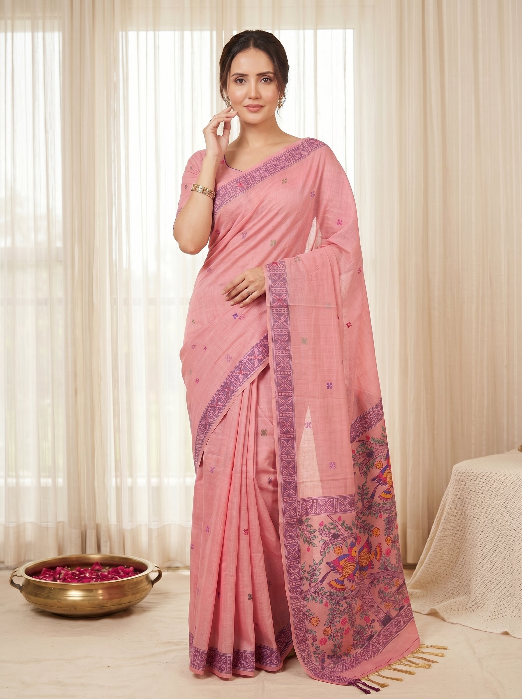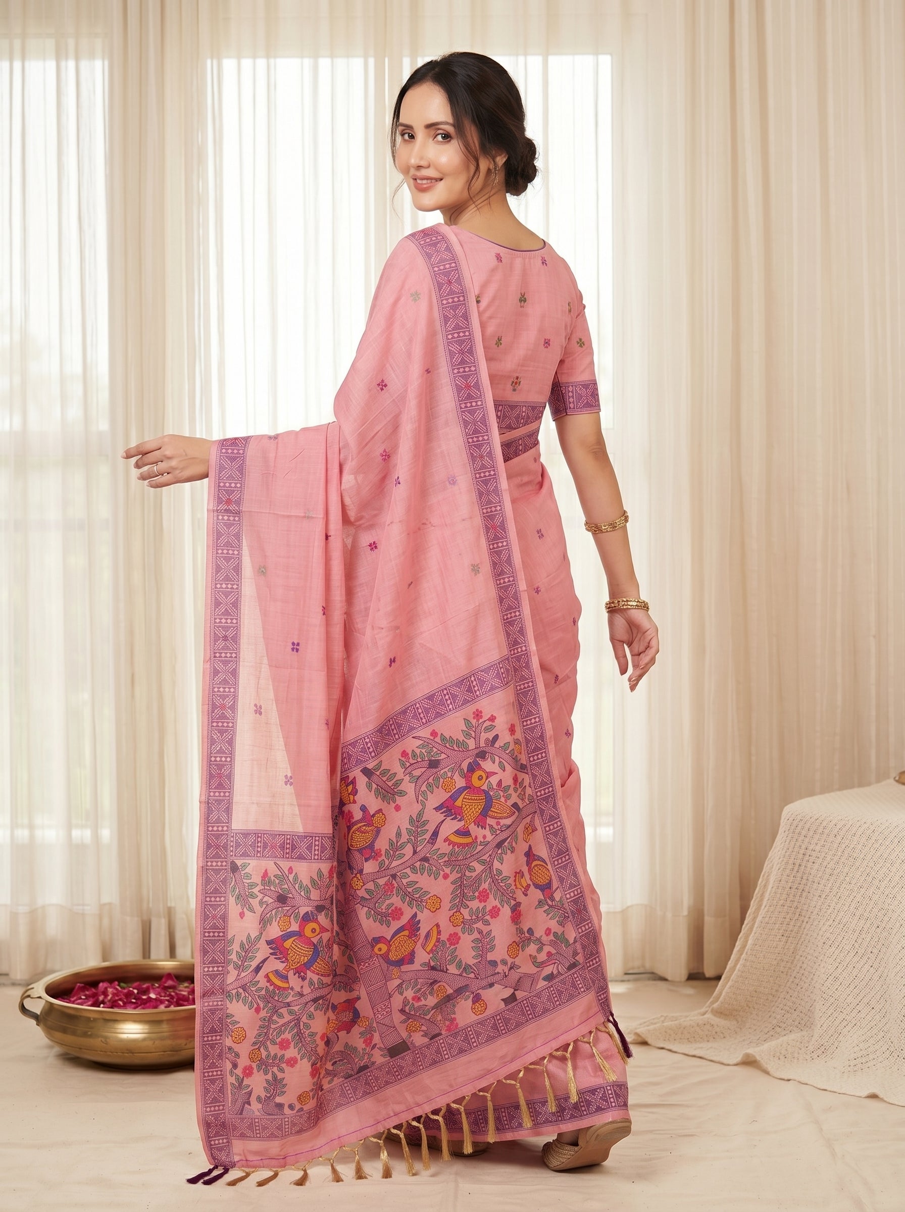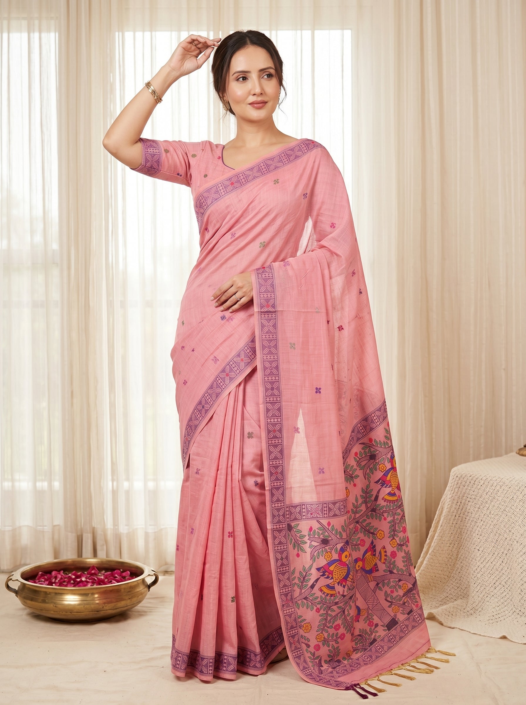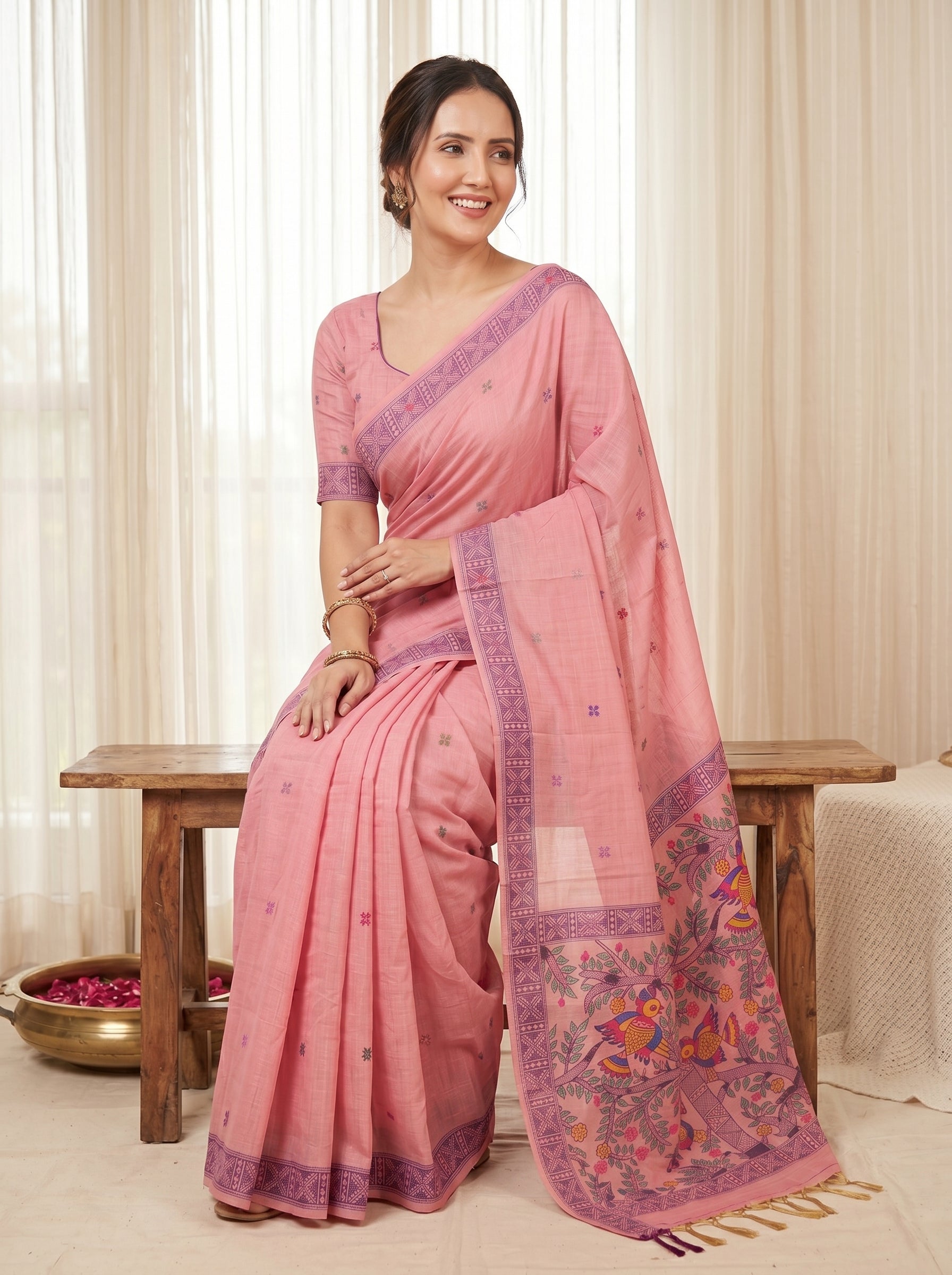 Pink Muga Cotton Saree For Women Madhubani Print Resham Weaving Soft Cotton Saree Traditional Handloom Saree With Blouse