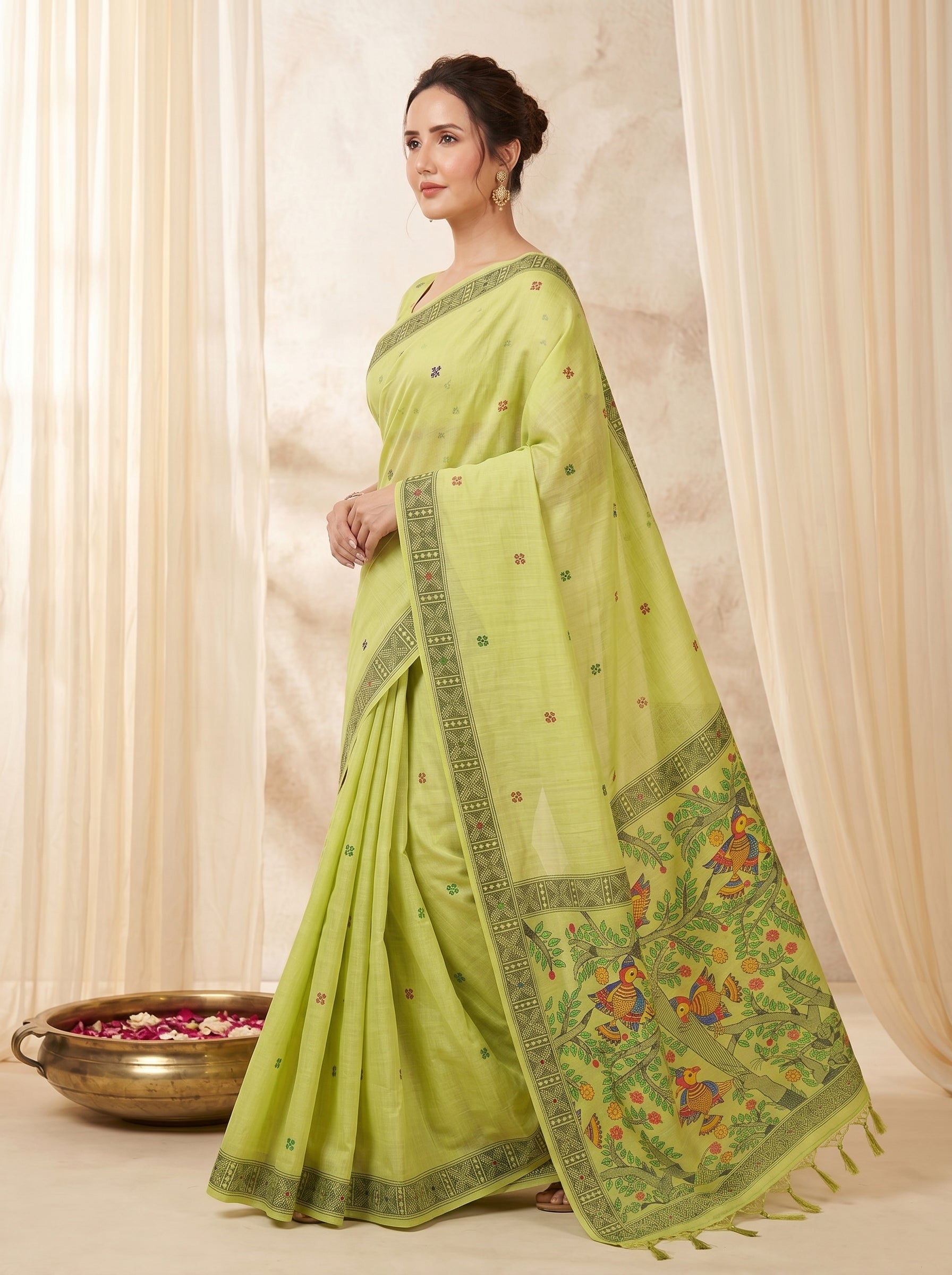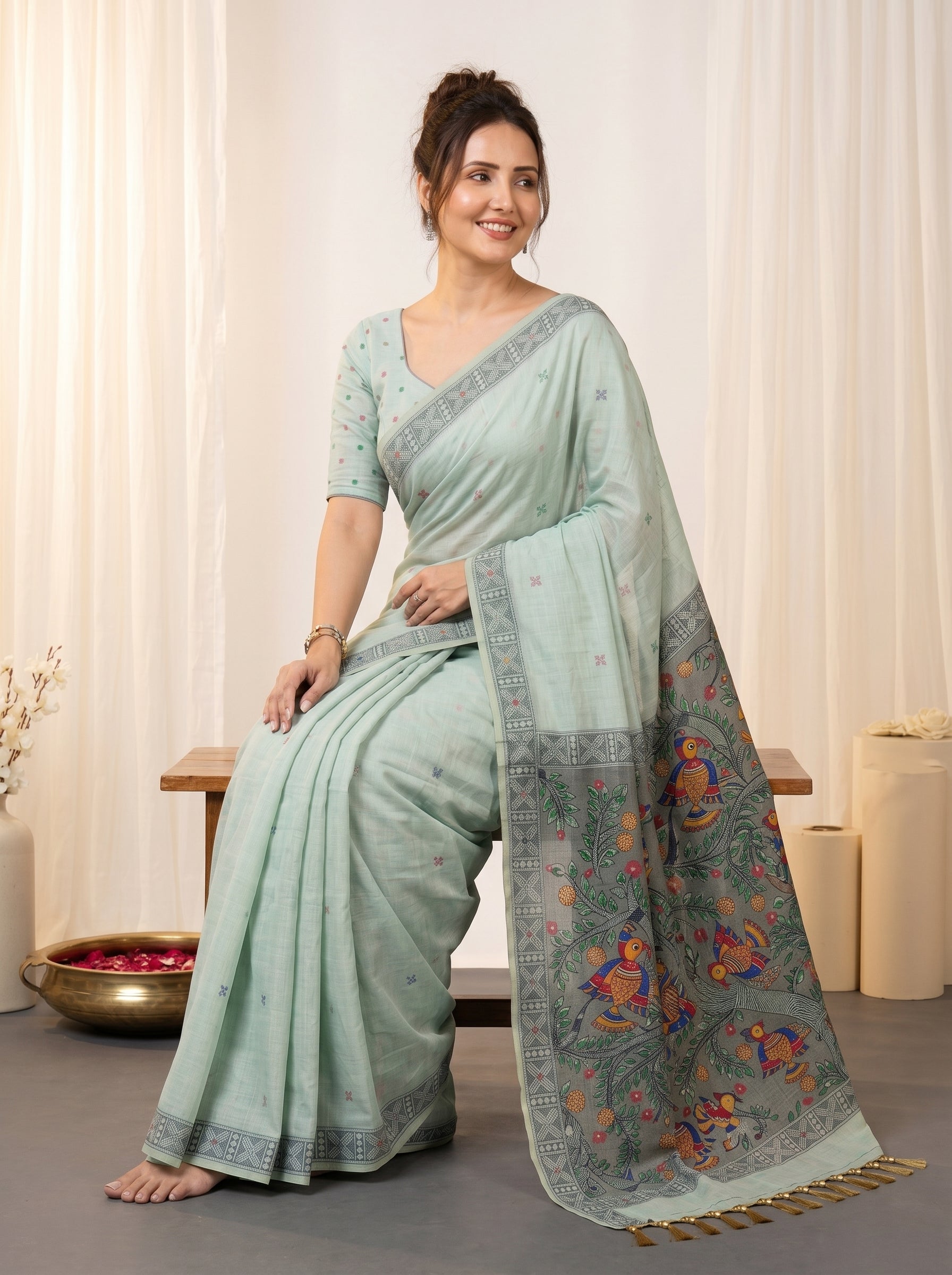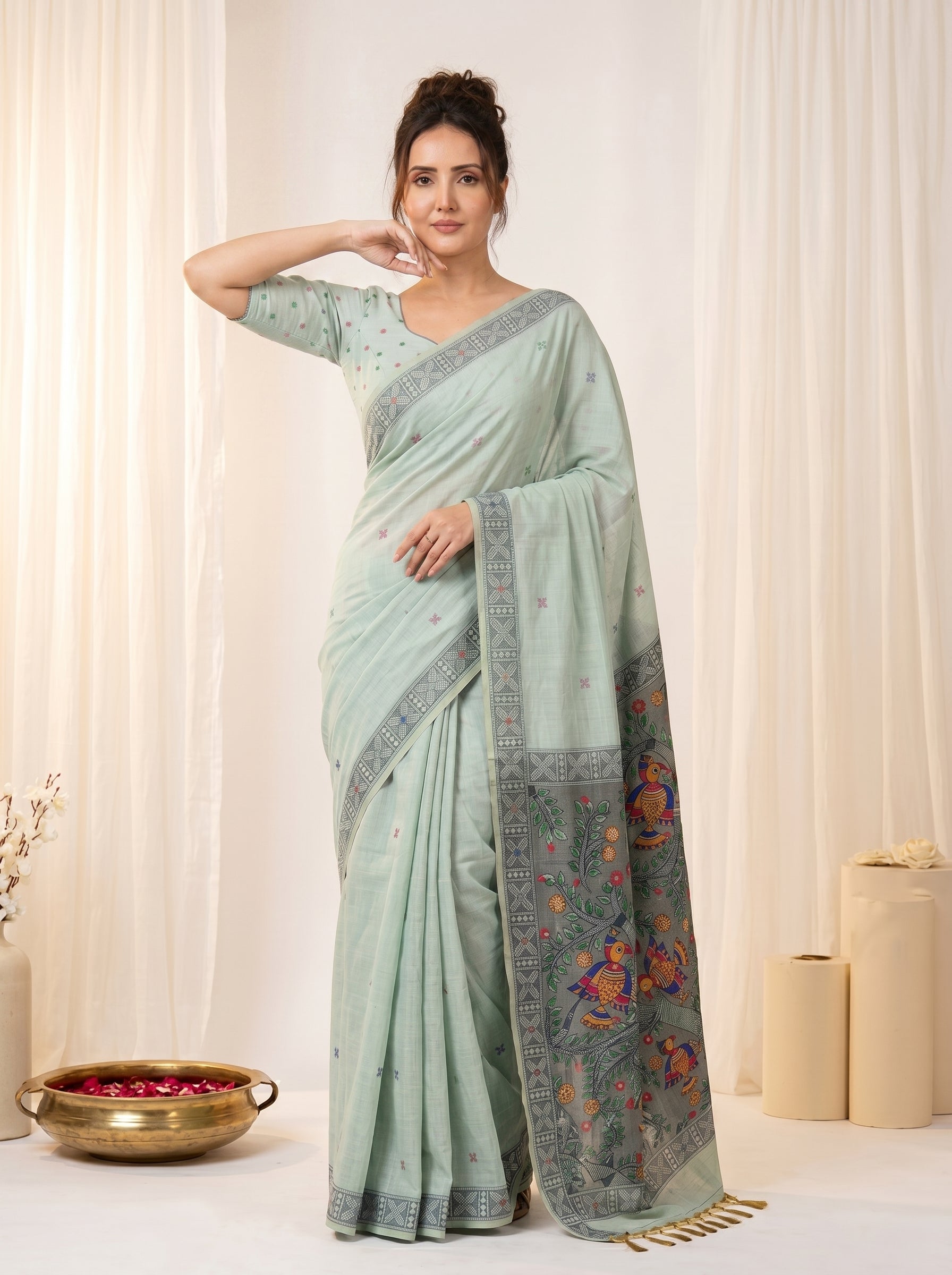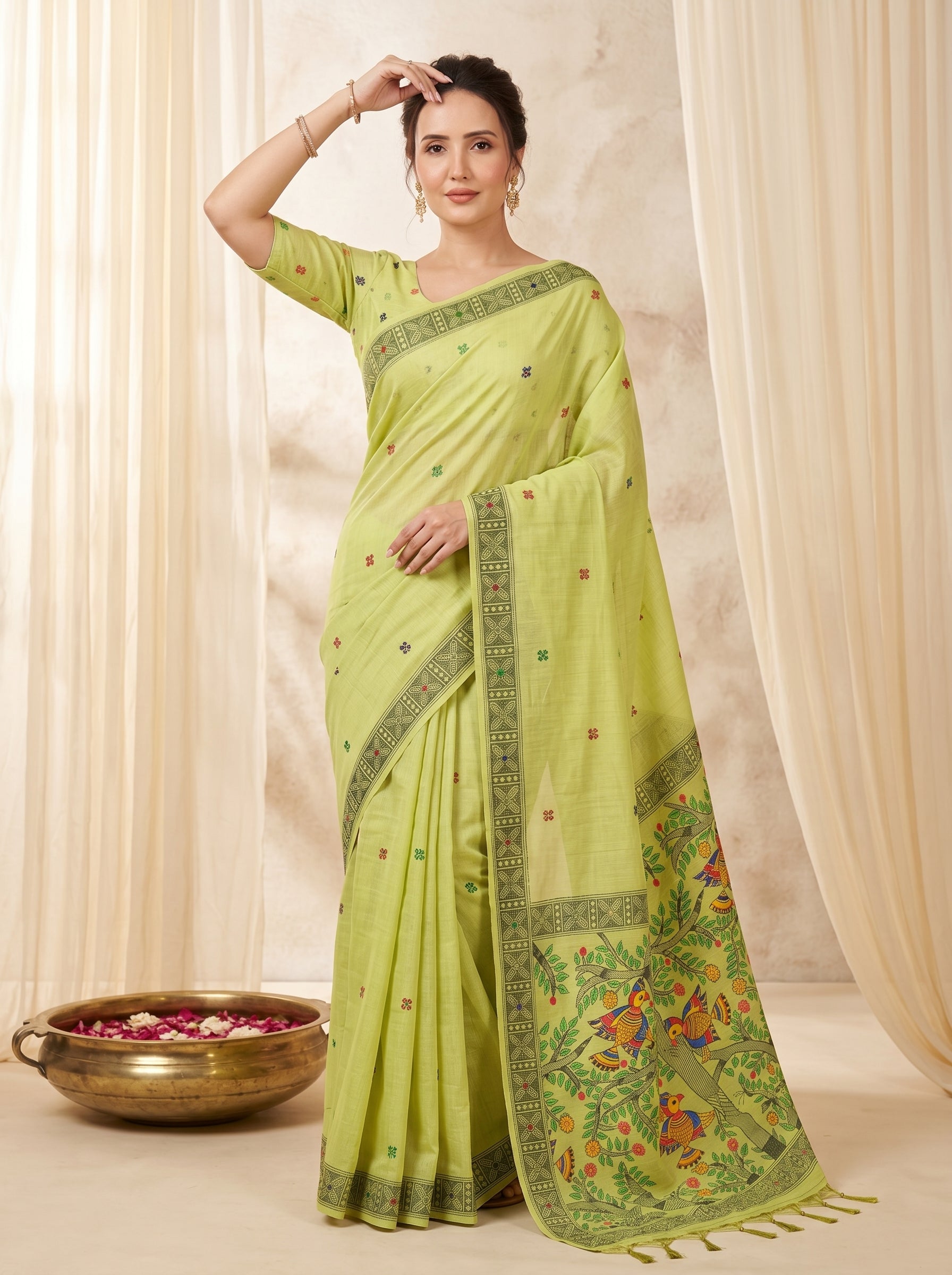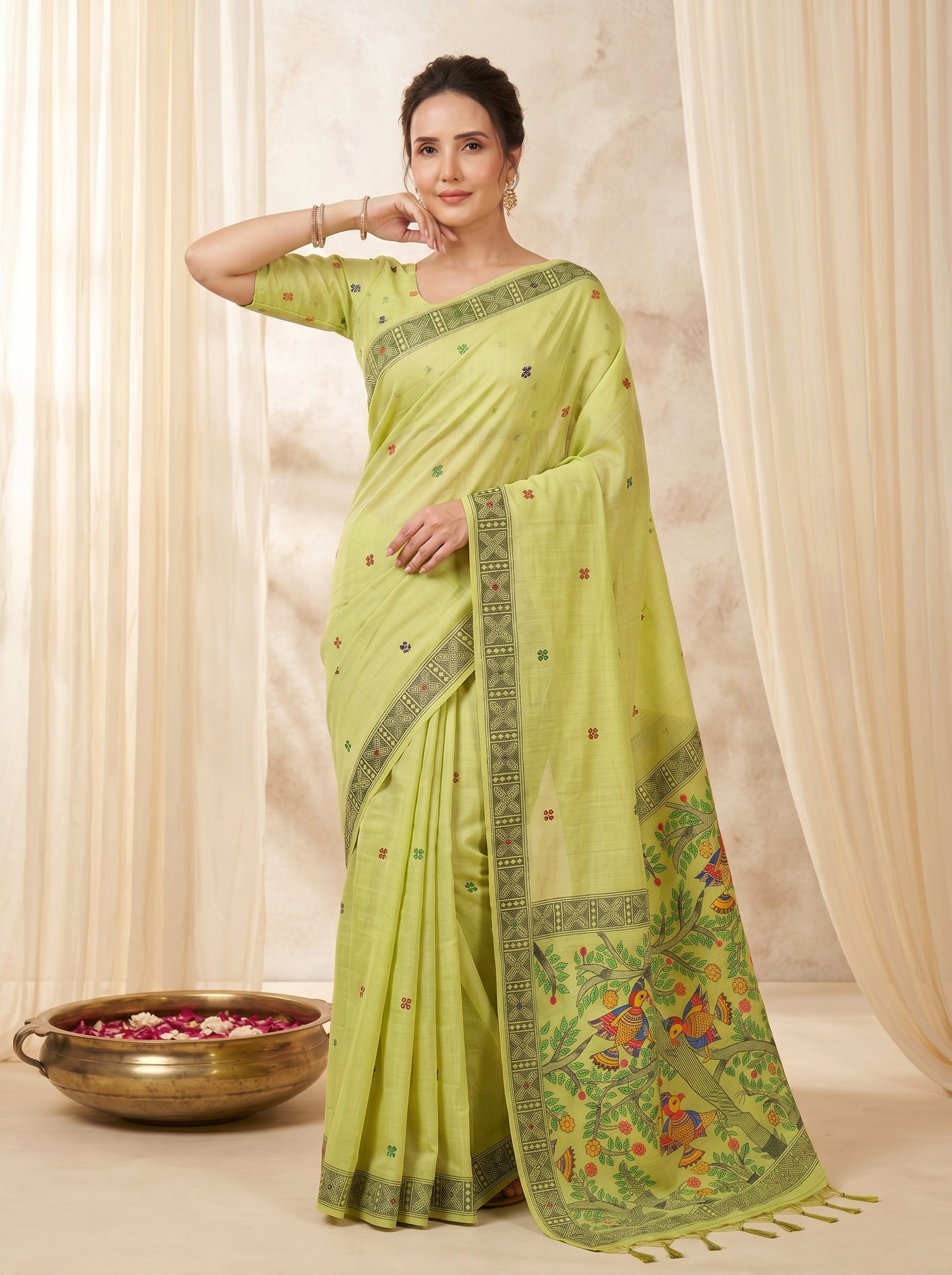 Pista Muga Cotton Saree For Women Madhubani Print Resham Weaving Soft Cotton Saree Traditional Handloom Saree With Blouse