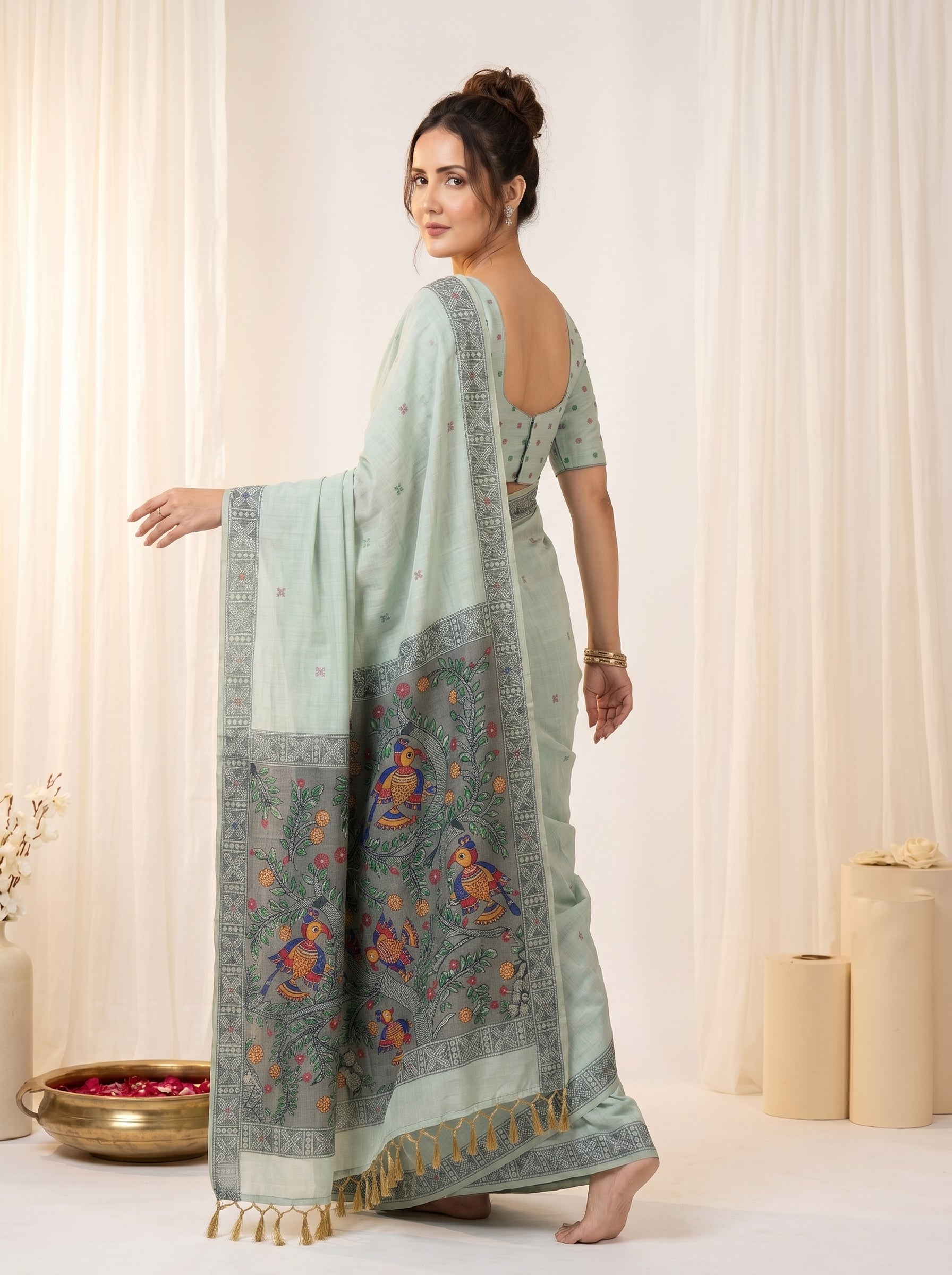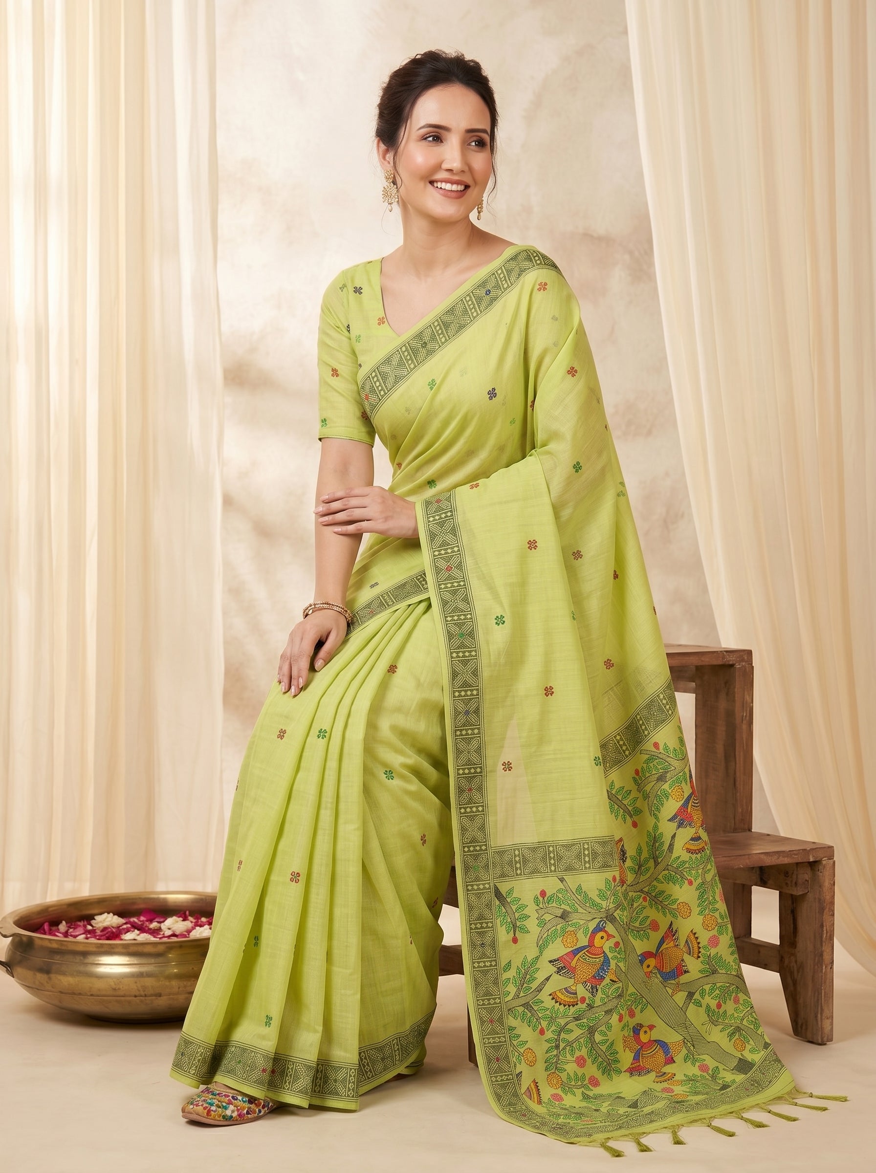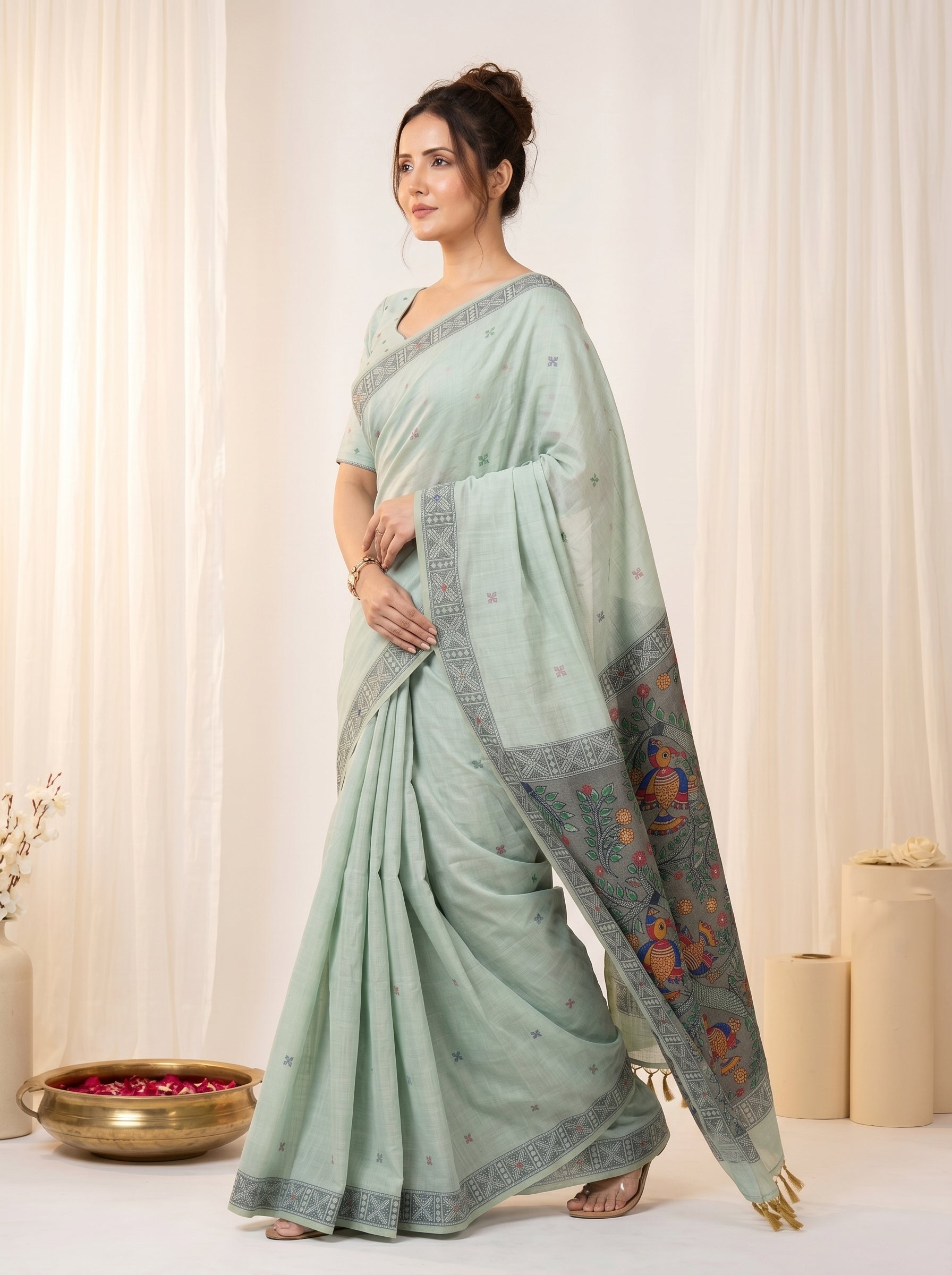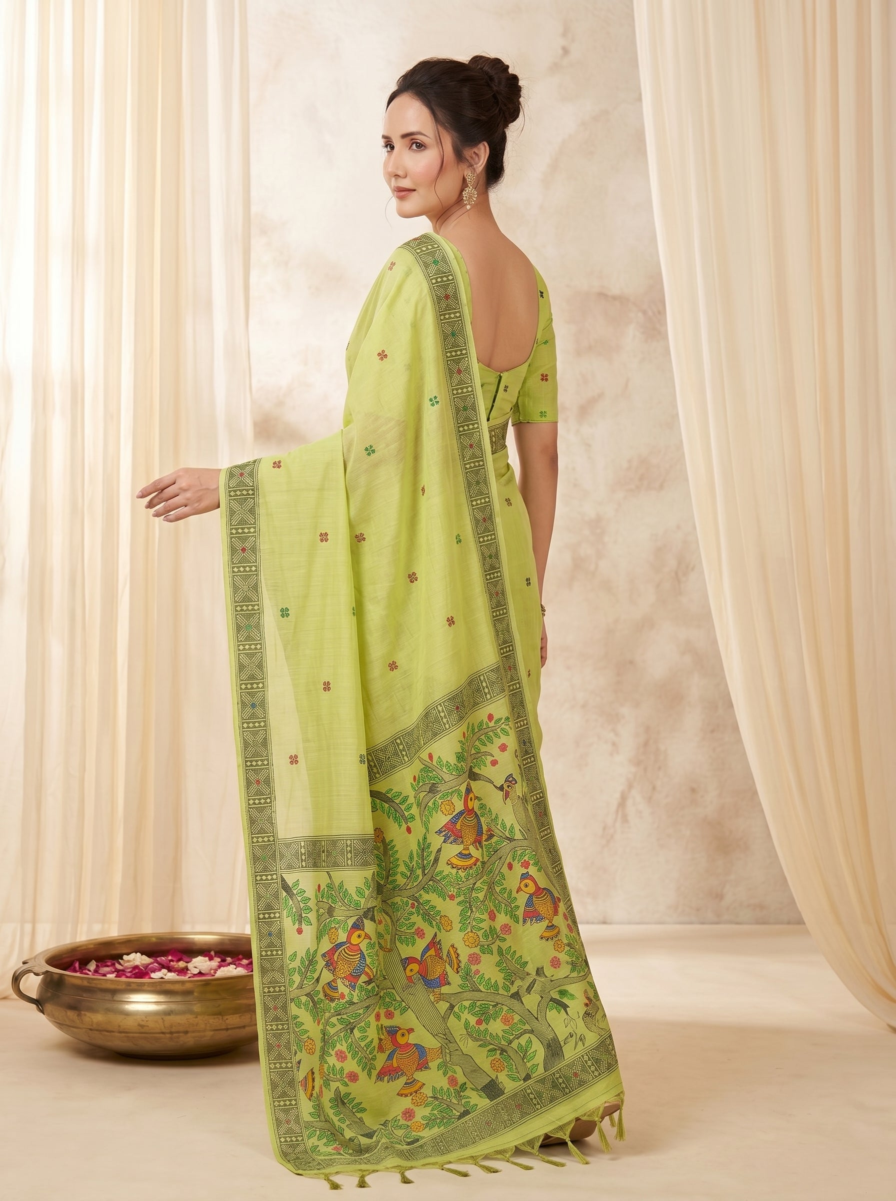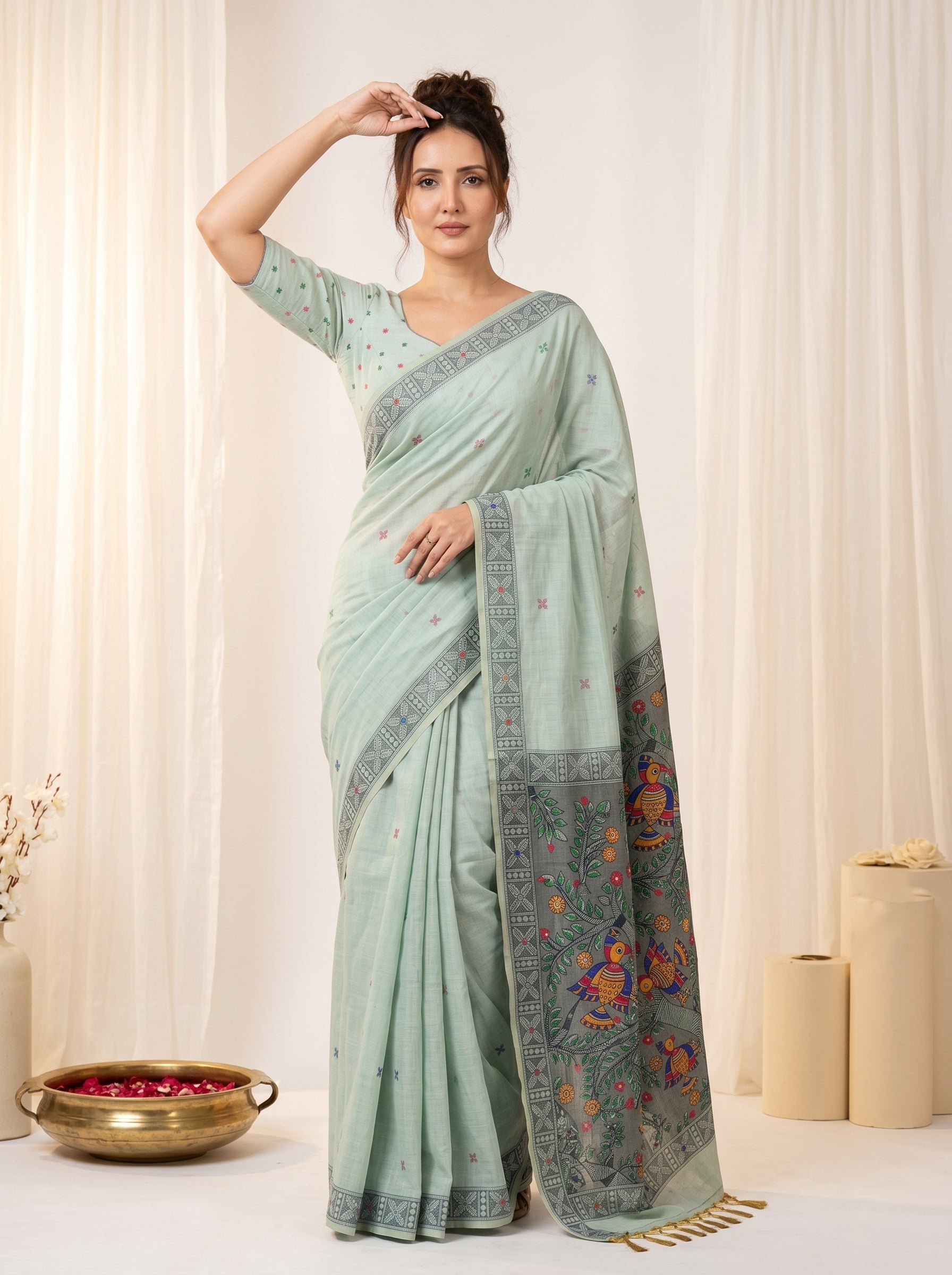 Pista Muga Cotton Saree For Women Madhubani Print Resham Weaving Soft Cotton Saree Traditional Handloom Saree With Blouse