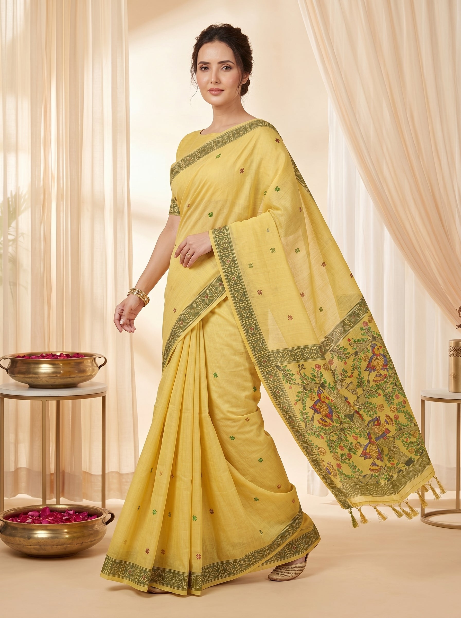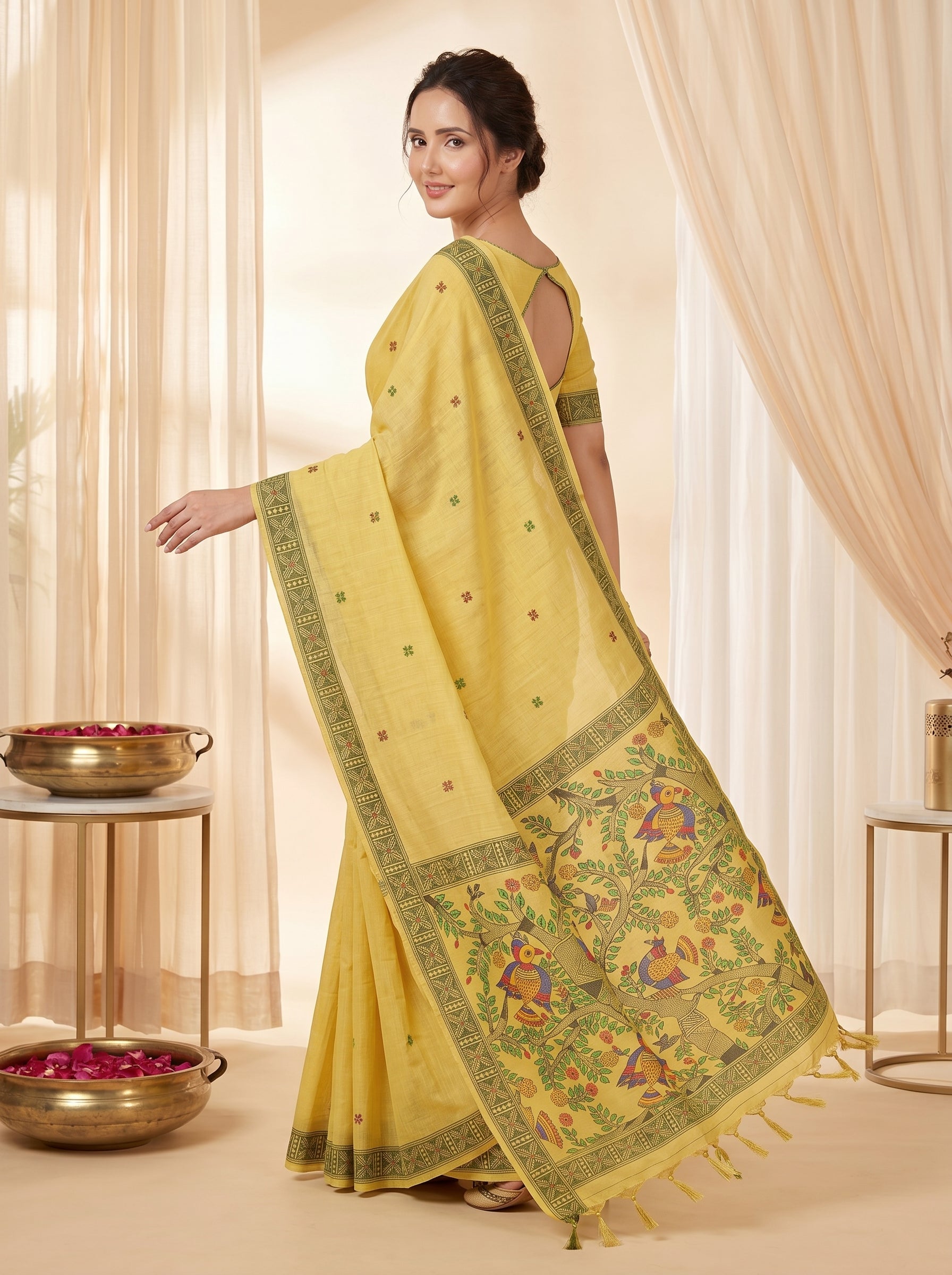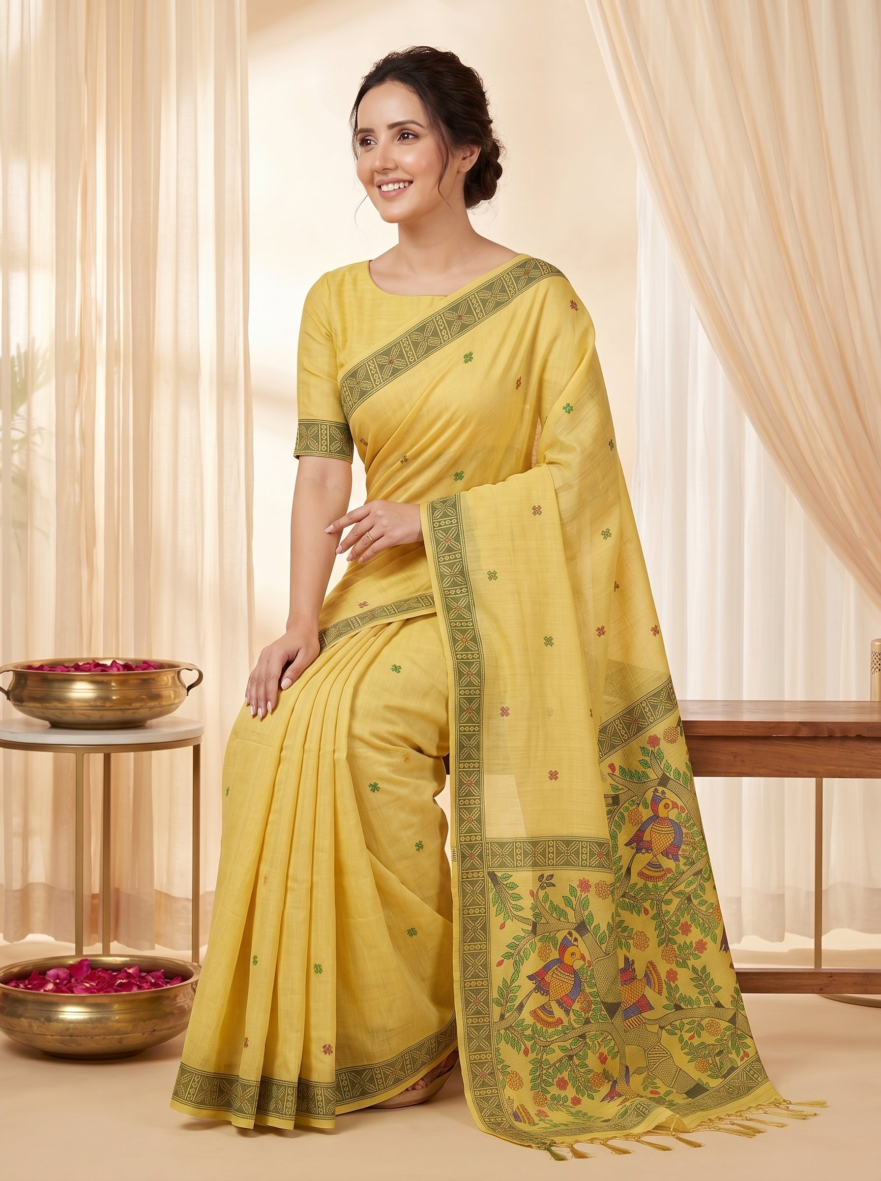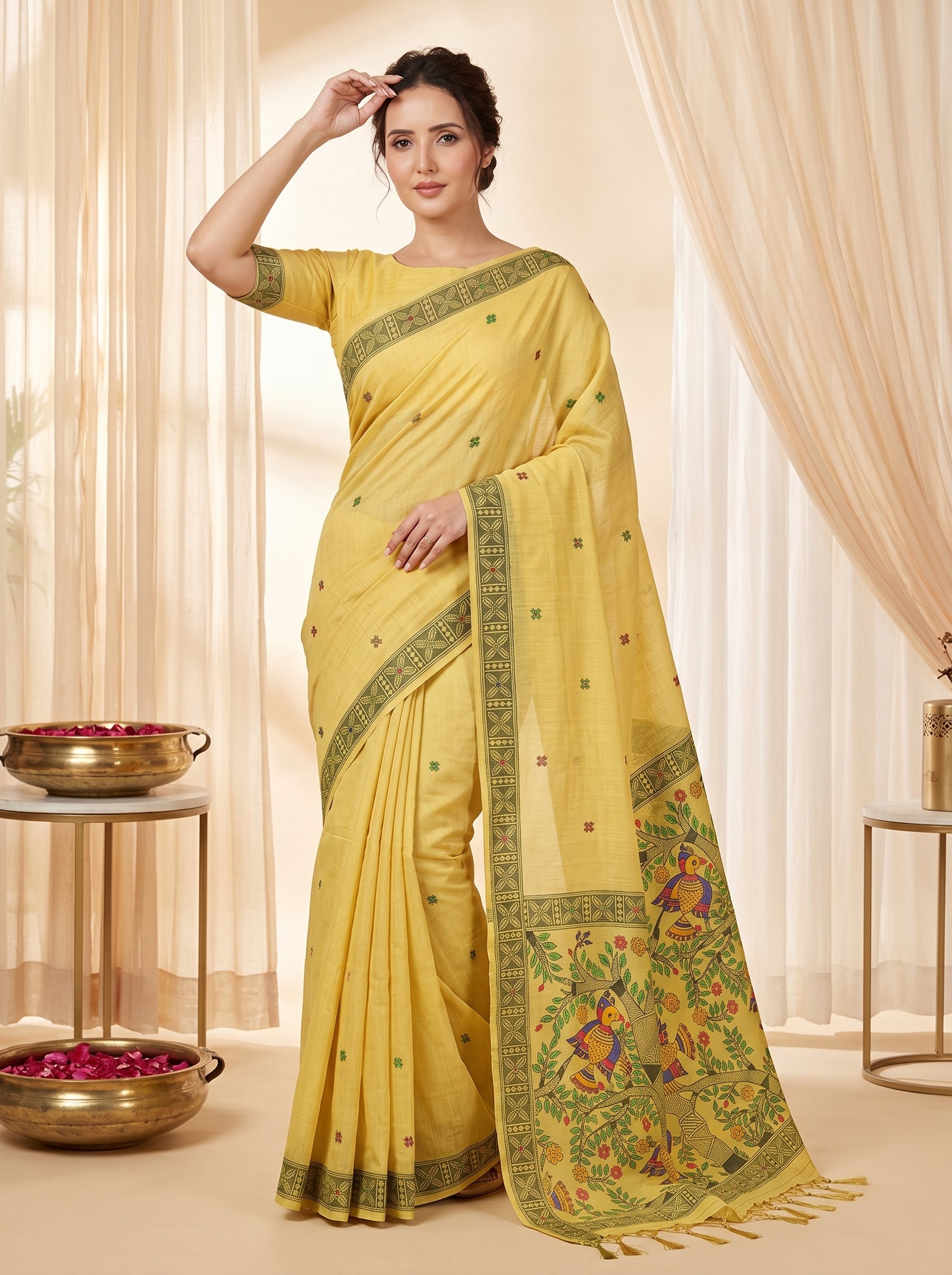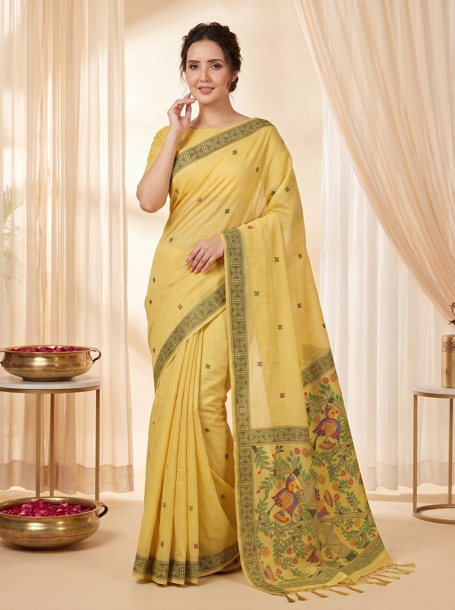 Yellow Muga Cotton Saree For Women Madhubani Print Resham Weaving Soft Cotton Saree Traditional Handloom Saree With Blouse