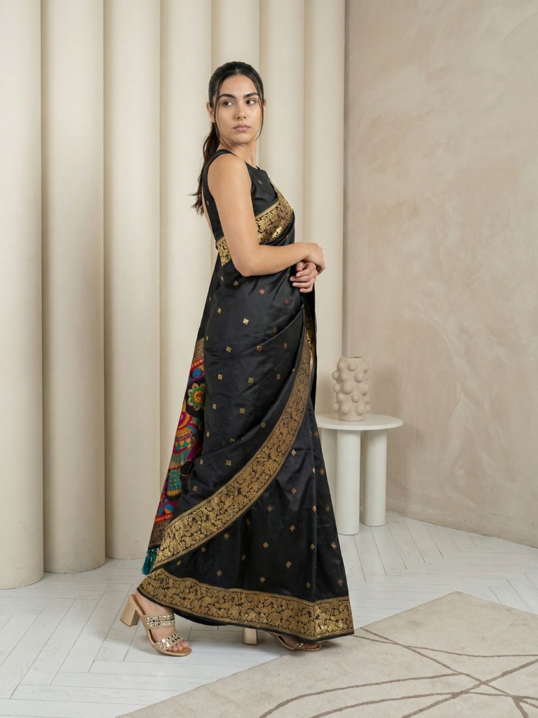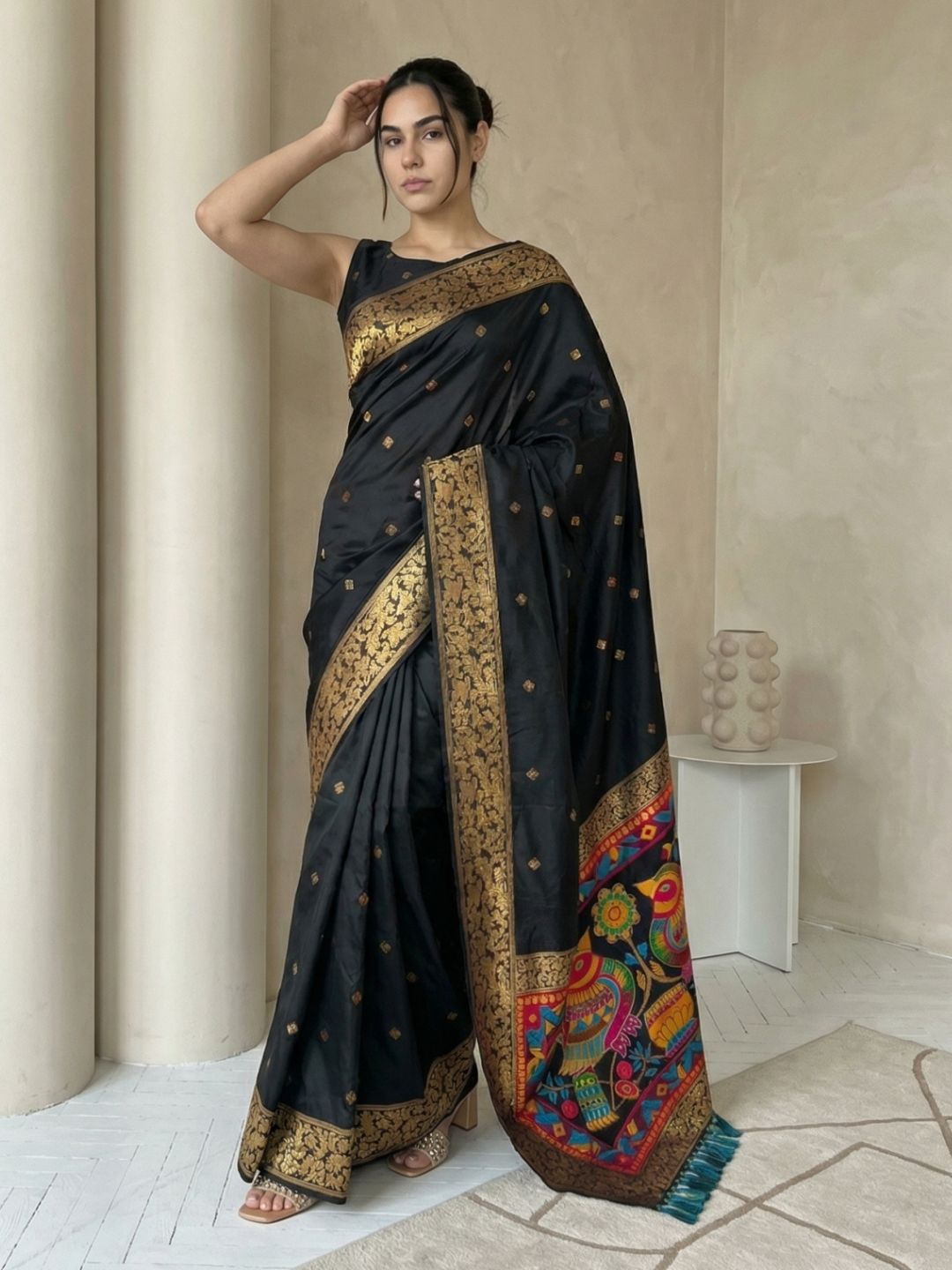 Black Soft Silk Saree Gold Zari Floral Motifs Meenakari Sparrow Pallu Saree With Running Blouse