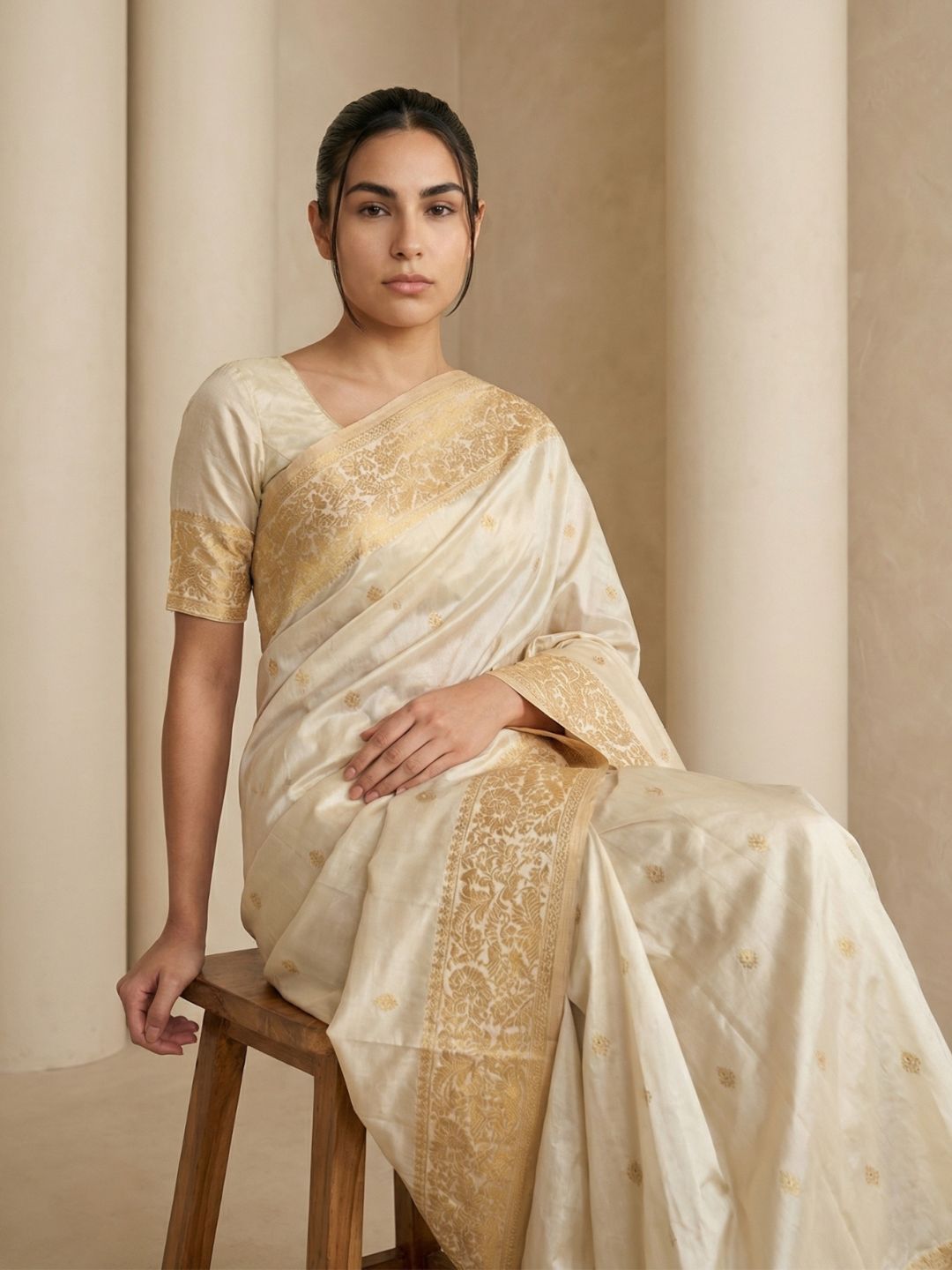 Cream Pashmina Kashmiri Silk Zari Woven Saree