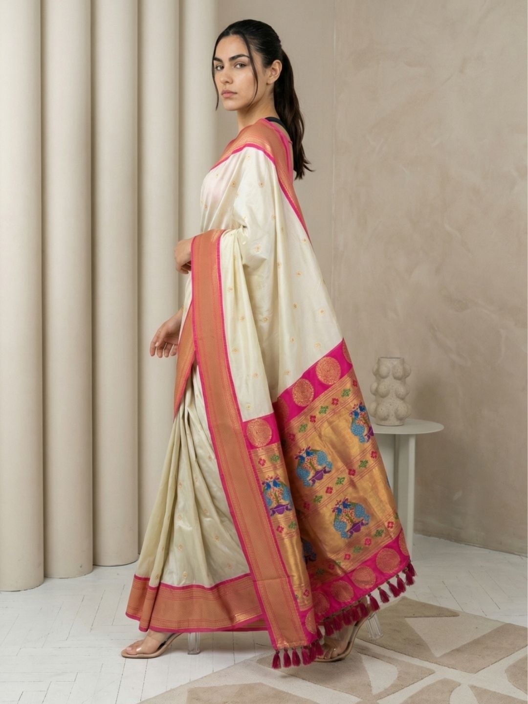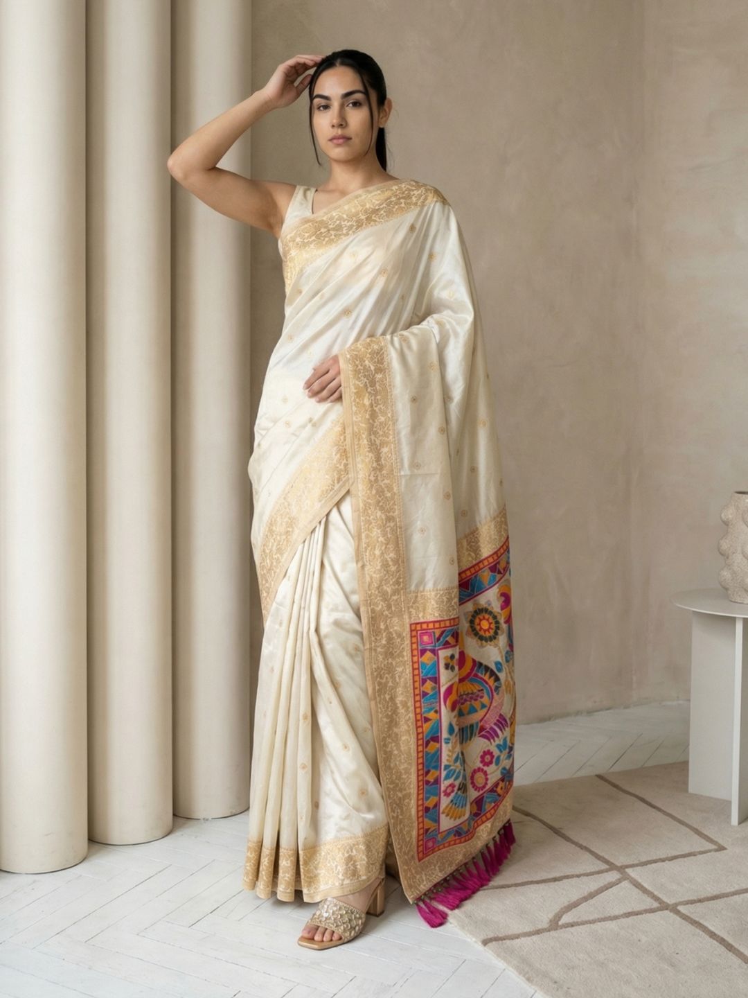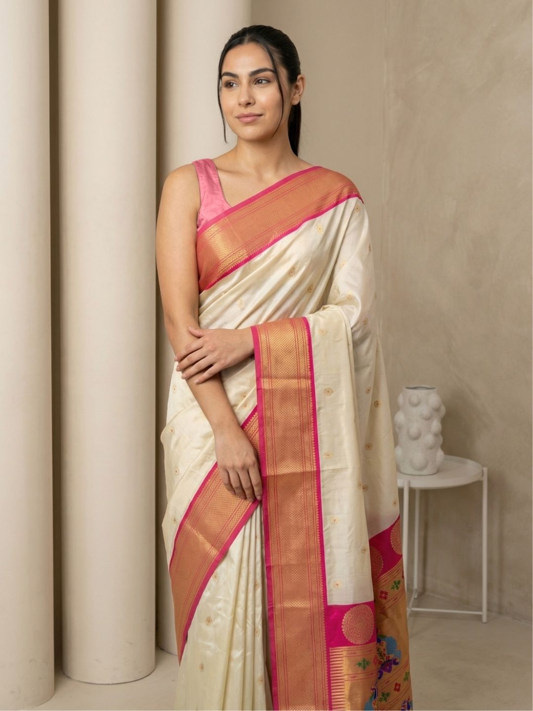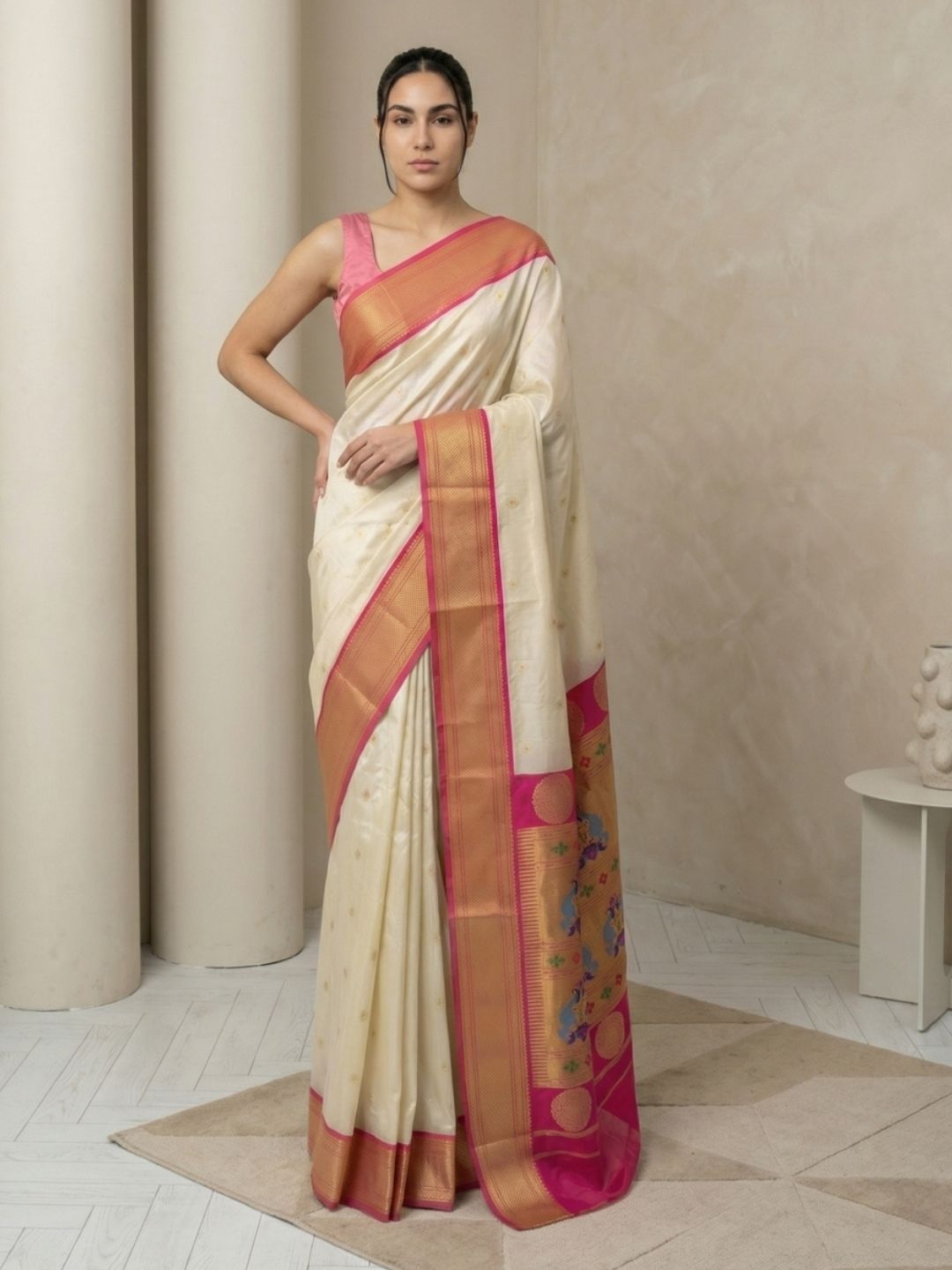 Cream Gala Silk Saree with Paithani Pallu Kadiyal Zari Woven Saree