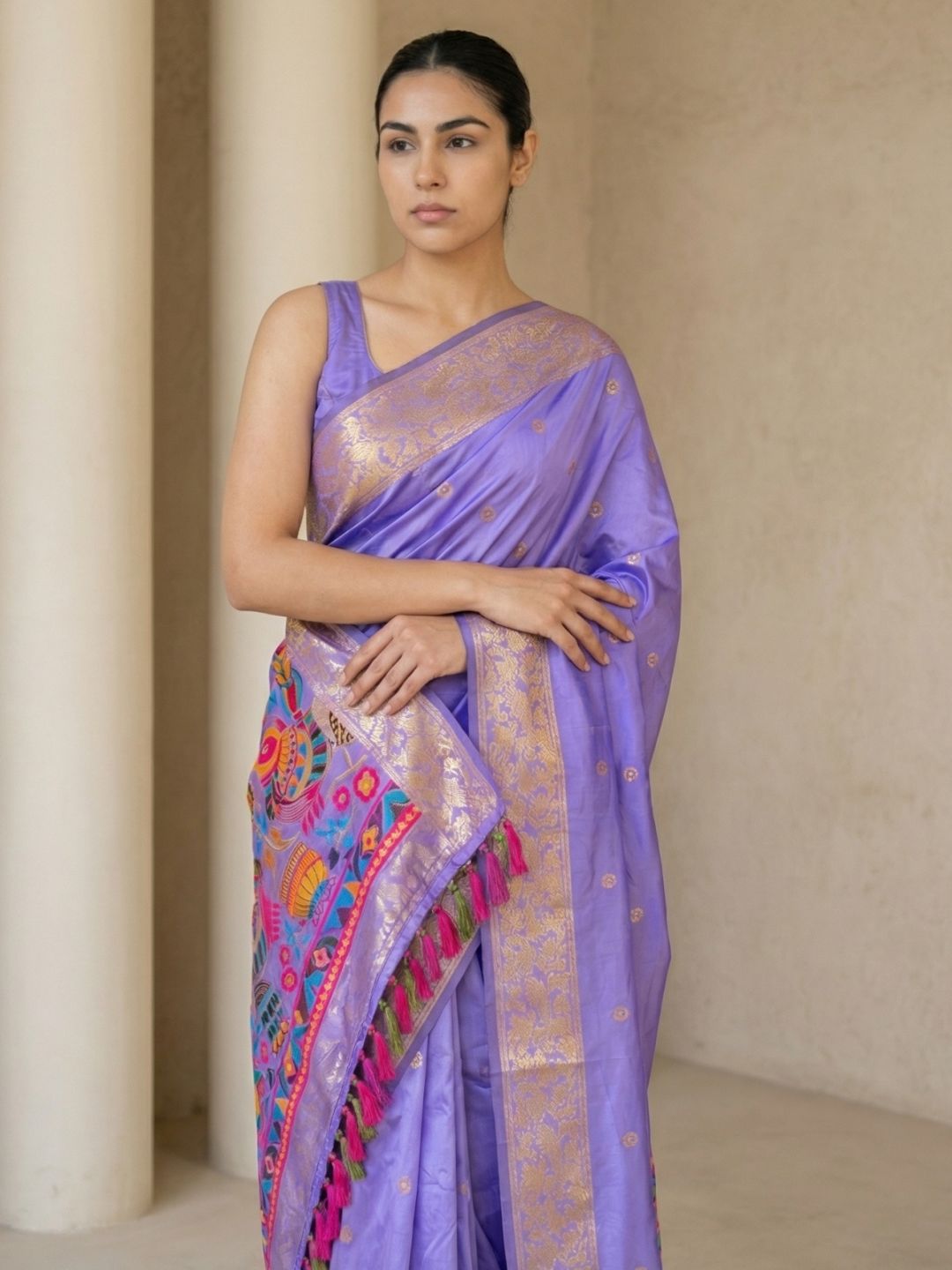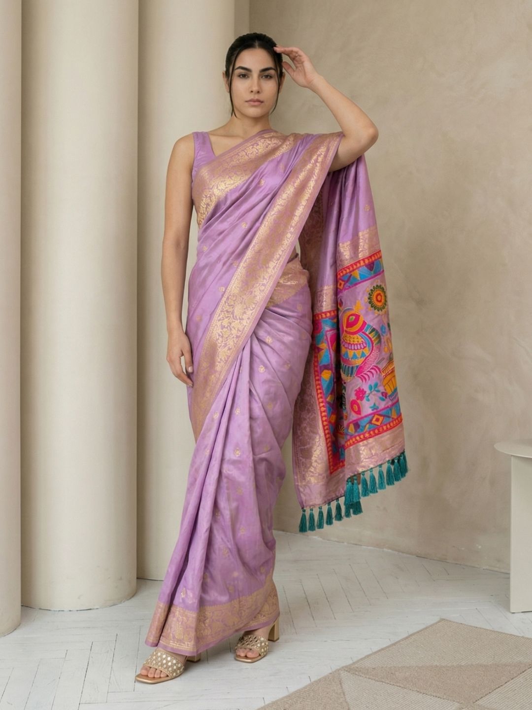 Lavender Soft Silk Saree Gold Zari Floral Motifs Meenakari Sparrow Pallu Saree With Running Blouse