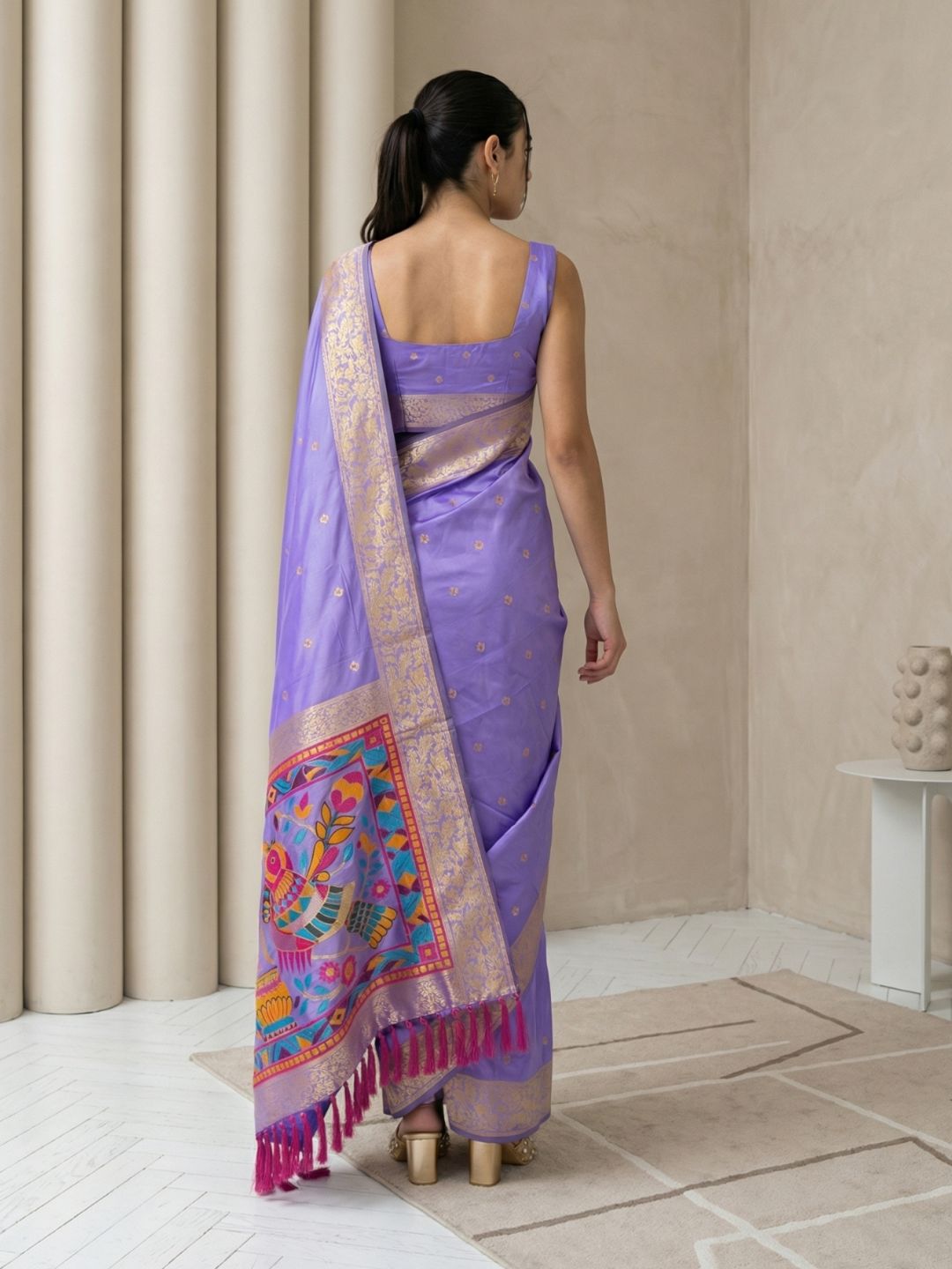 Lavender Soft Silk Paithani Saree Meenakari Peacock Motifs Zari Woven Swan Pallu Saree With Brocade Blouse