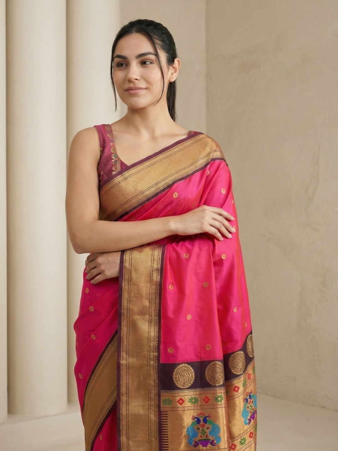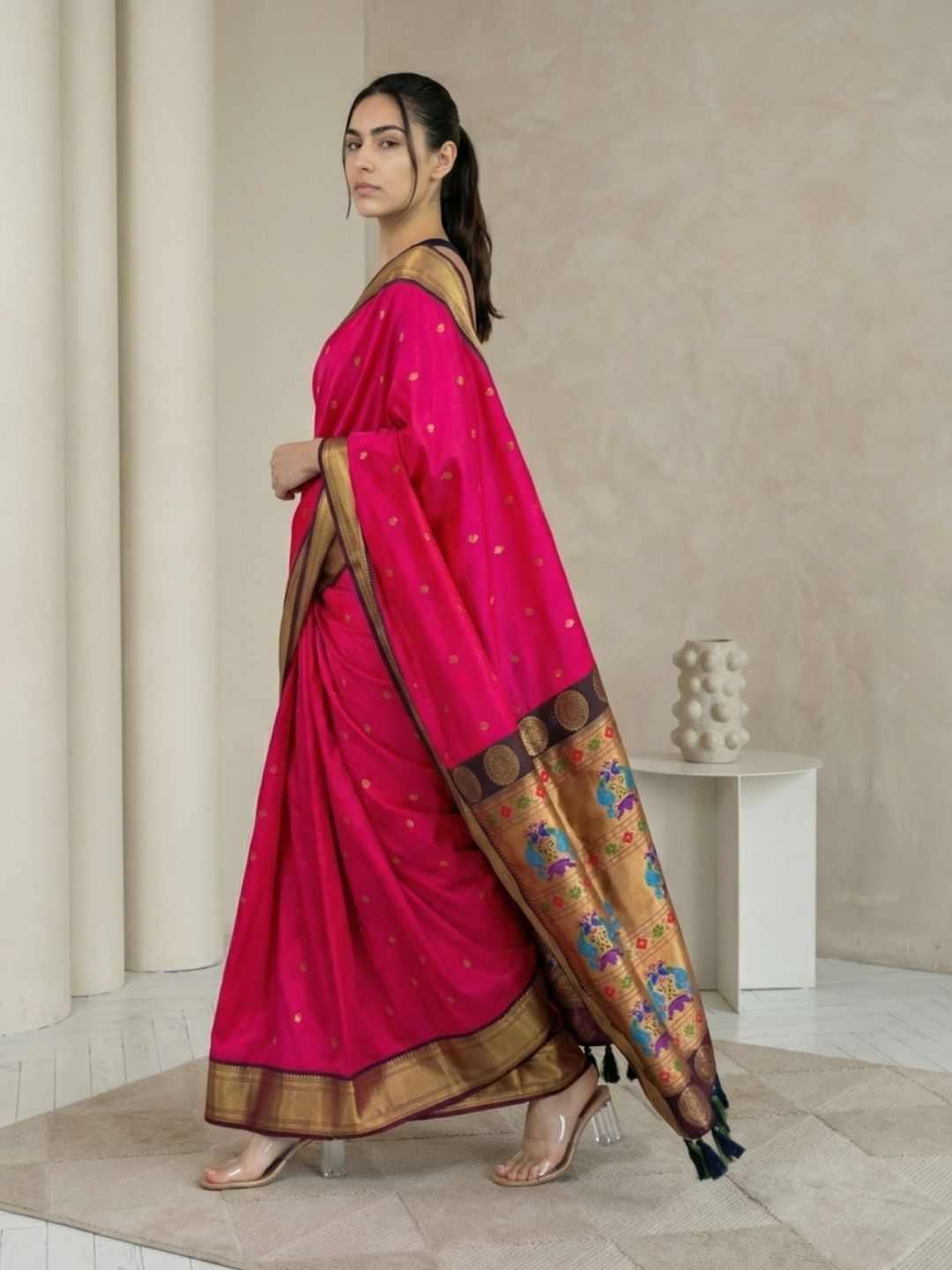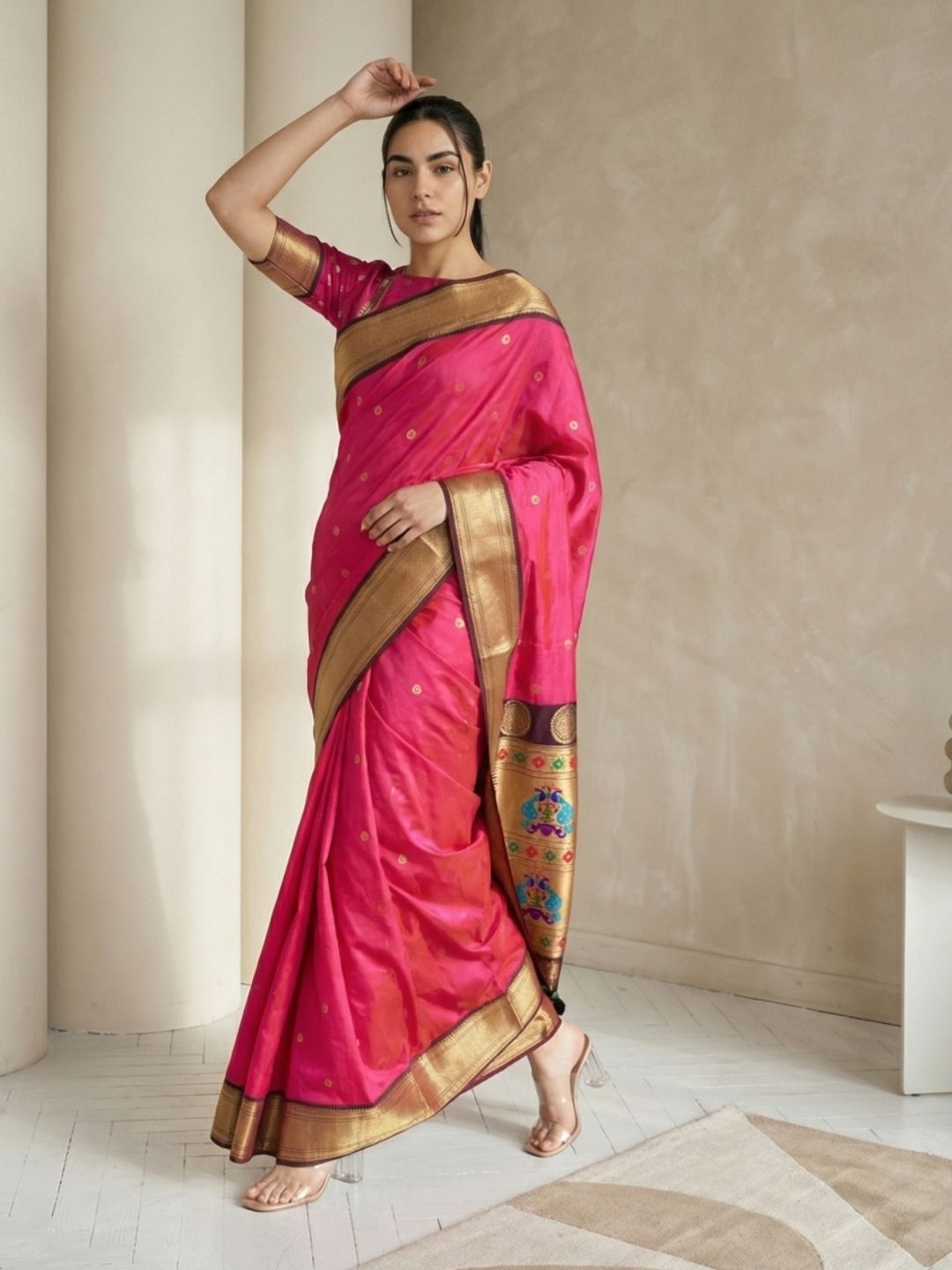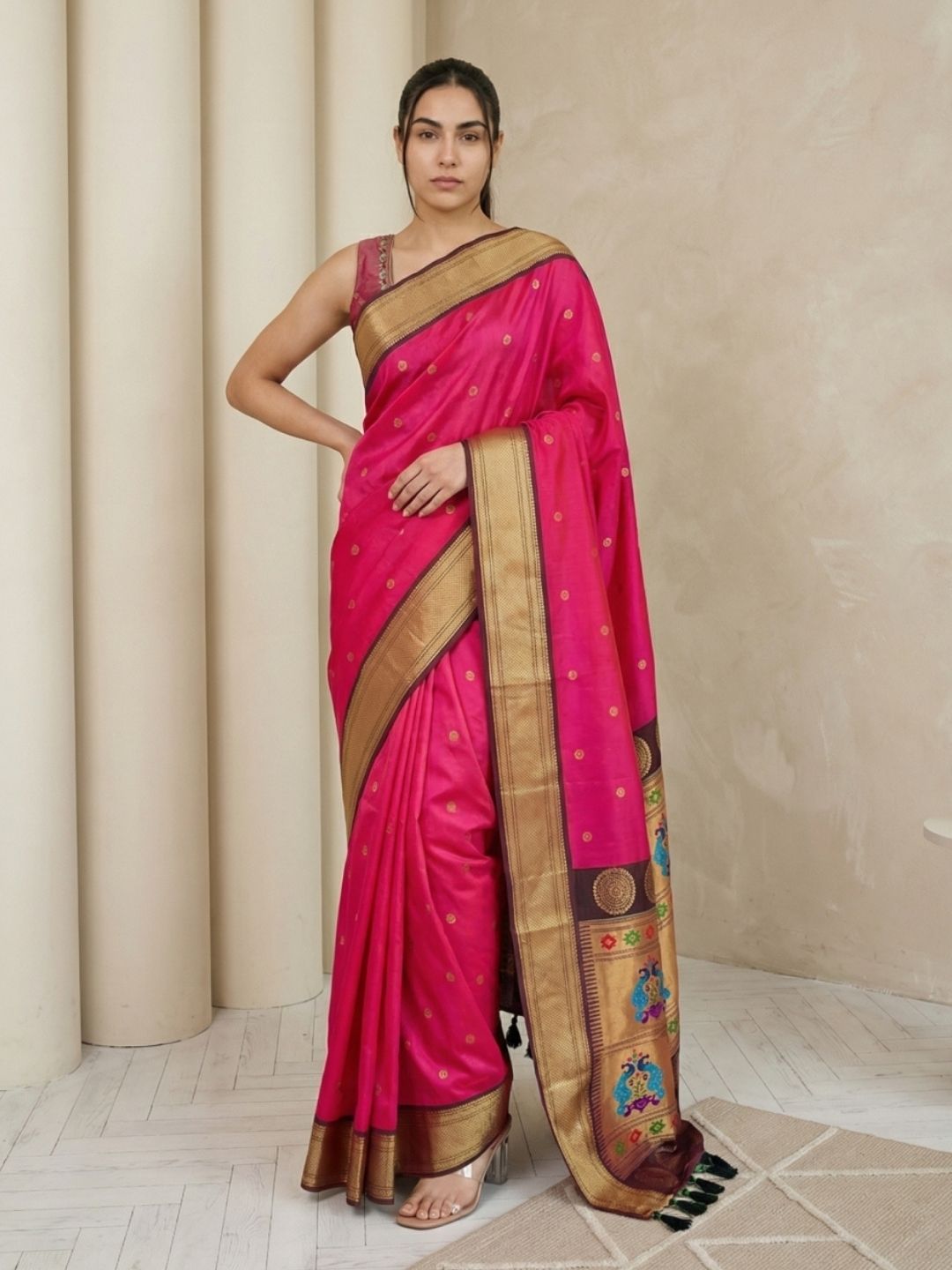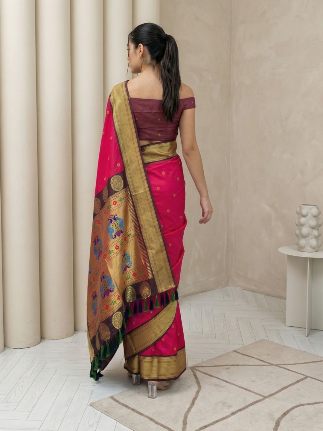 Aditi in our Dark Pink Organza Paithani Zari Woven Saree