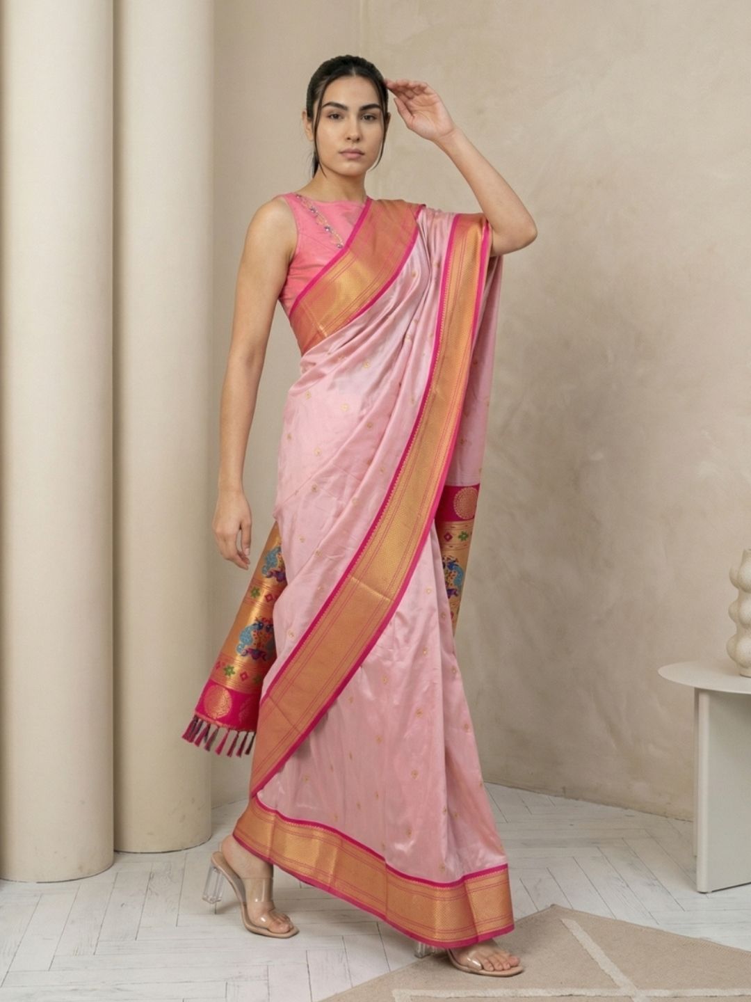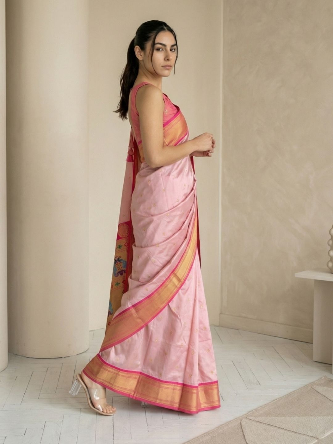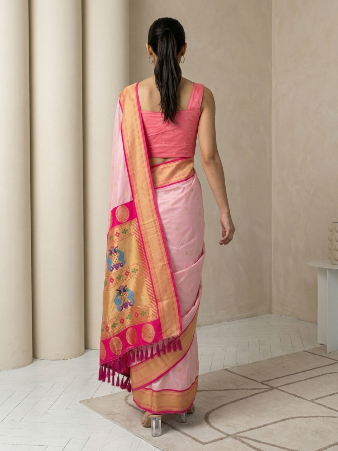 Babypink Soft Silk Paithani Saree For Women Meenakari Zari Weaving Floral Motifs Traditional Wedding Saree With Brocade Blouse