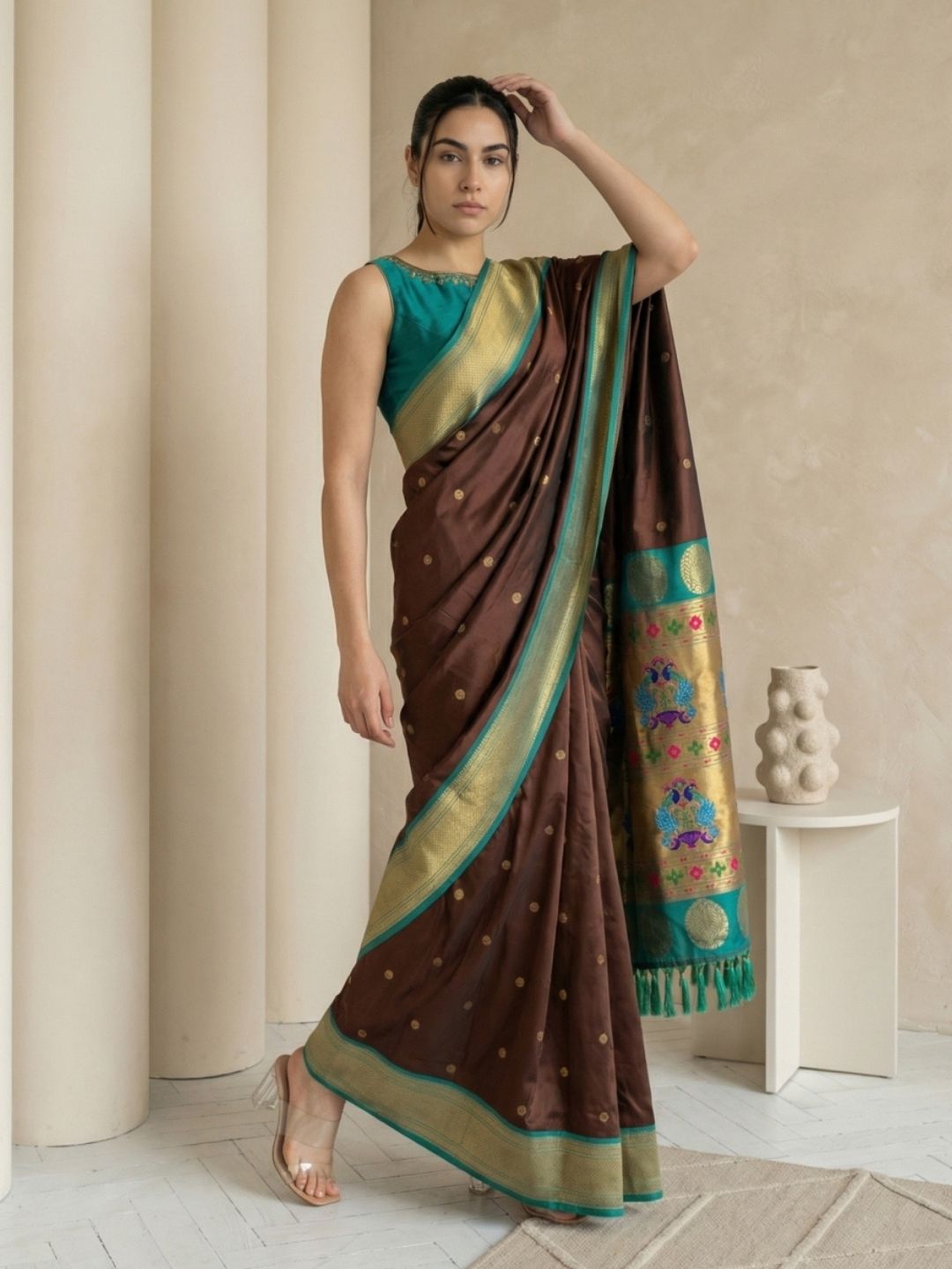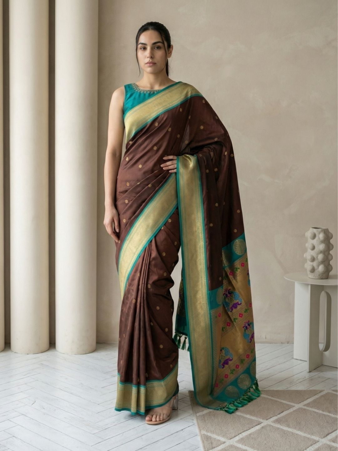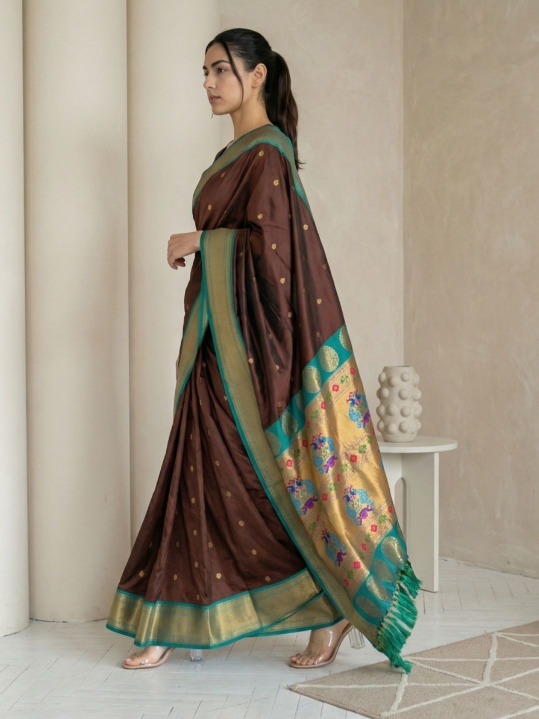 Coffee Zari Woven Vitthala God Special Traditional Paithani Silk Saree
