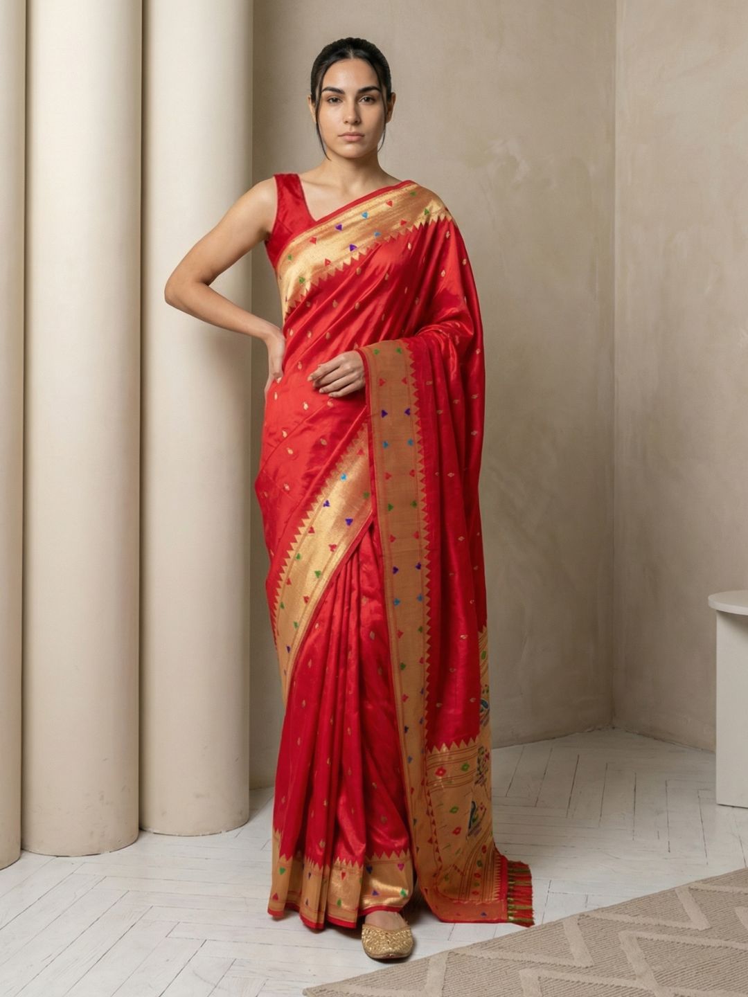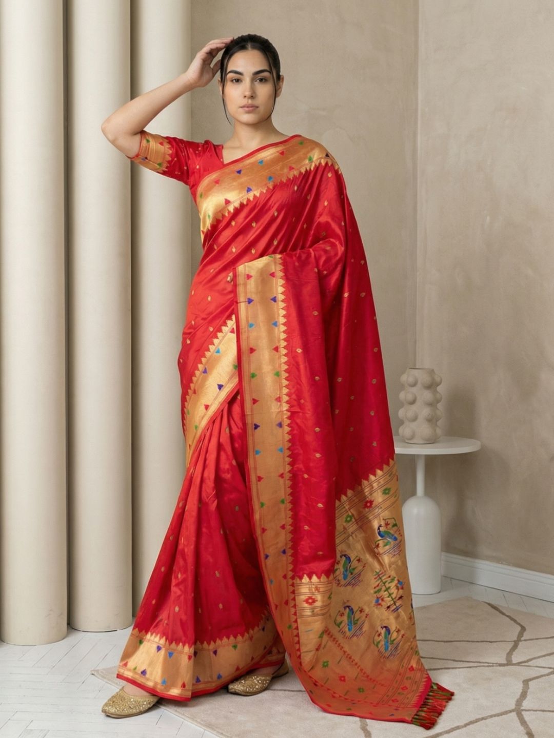 Red Soft Silk Paithani Meenakari Saree Tilak Zari Woven Motifs Temple Border Saree With Brocade Blouse