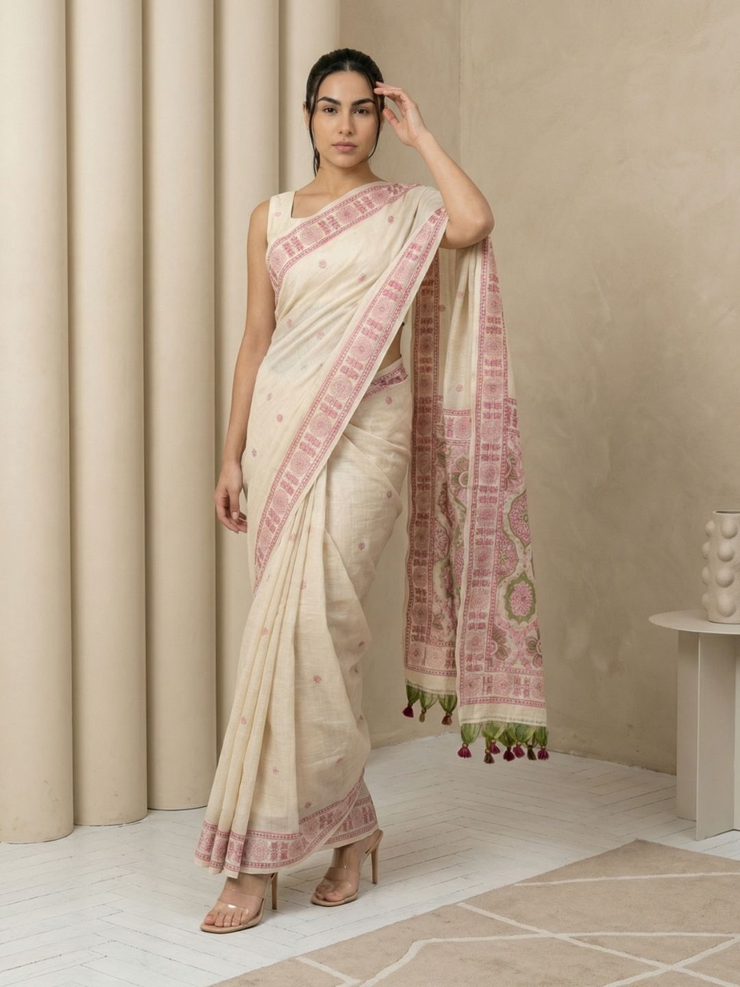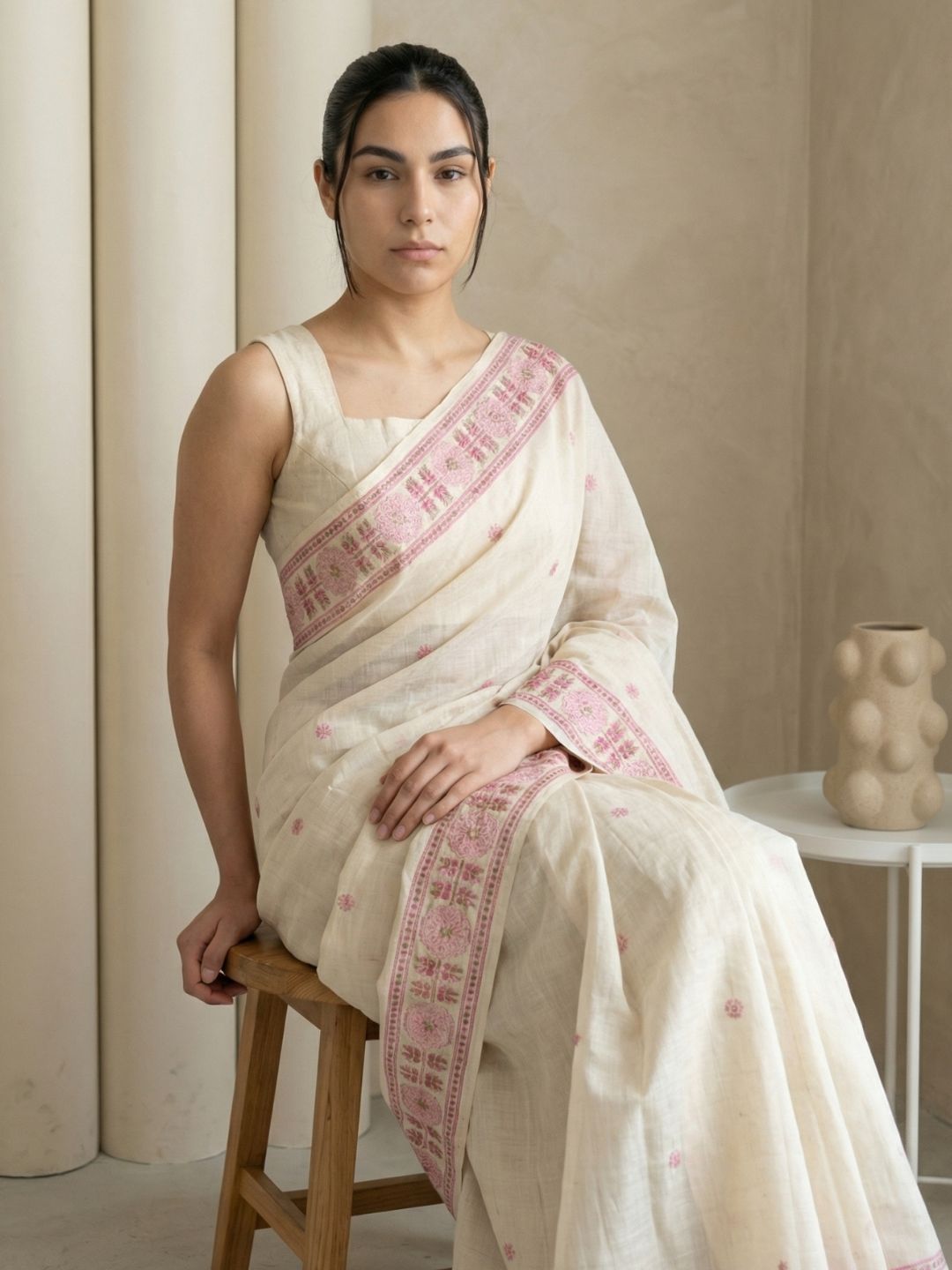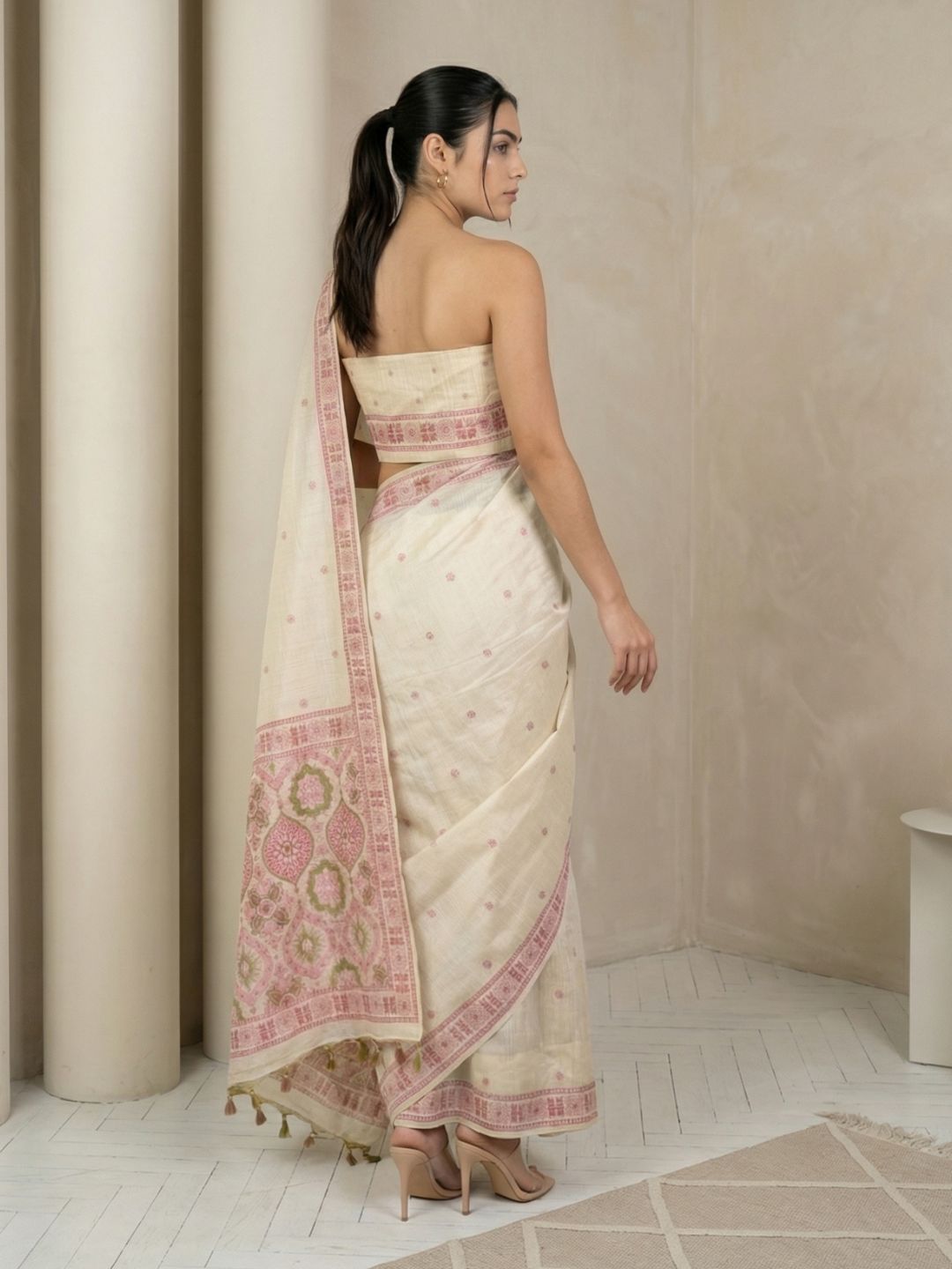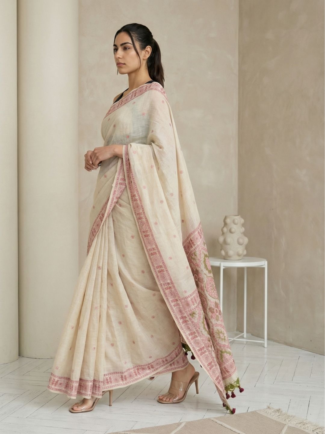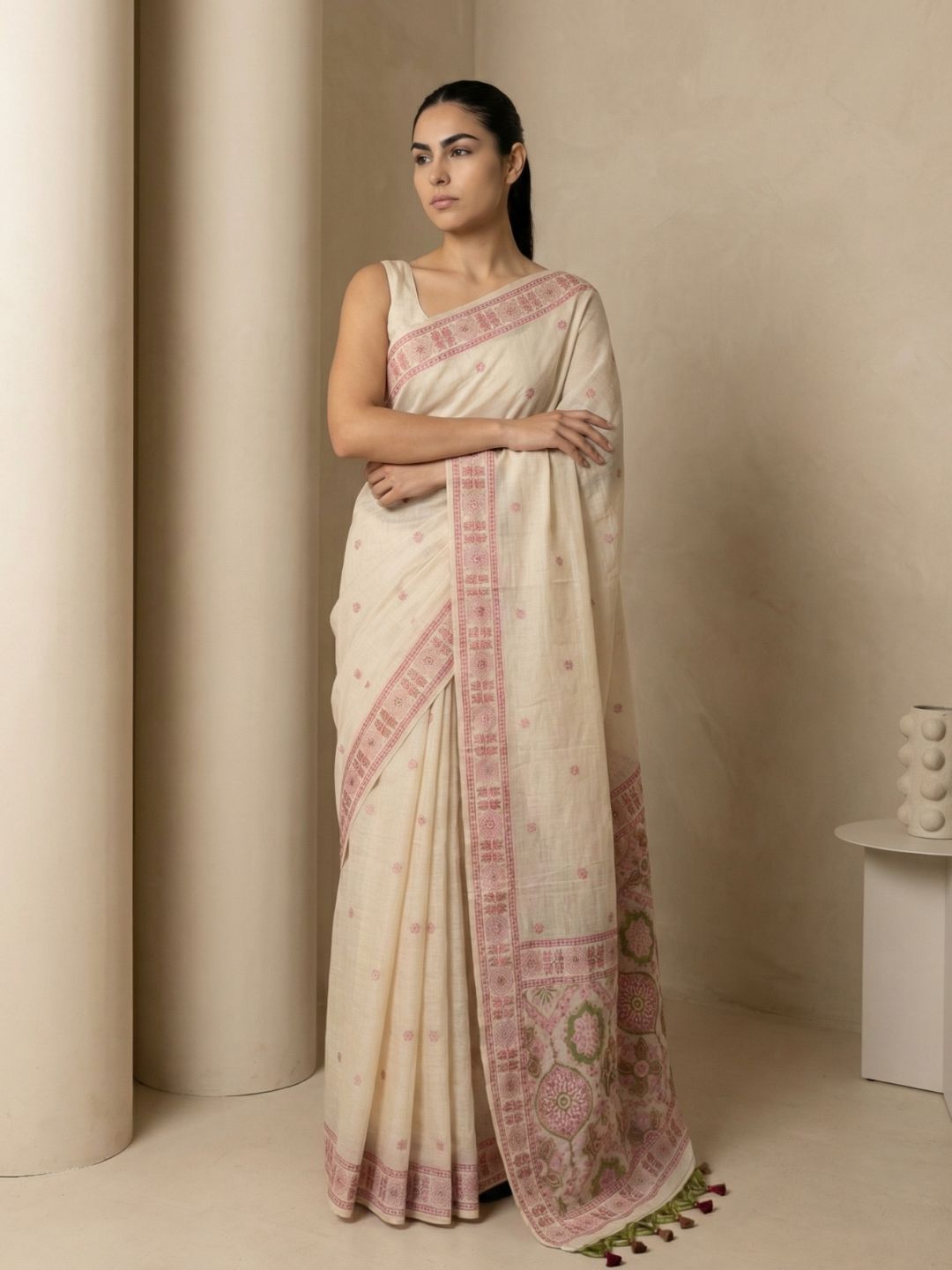 White Muga Cotton Saree with Resham Weaving Meenakari Buttis, Pencil Art Pallu – Soft Summer Saree with Blouse Piece