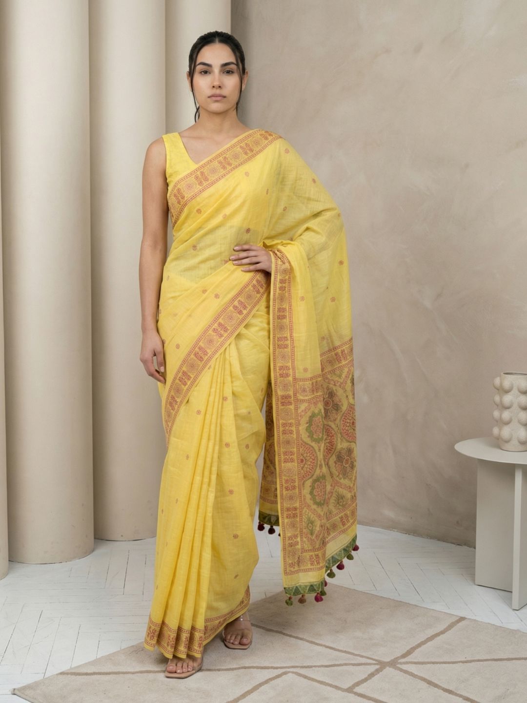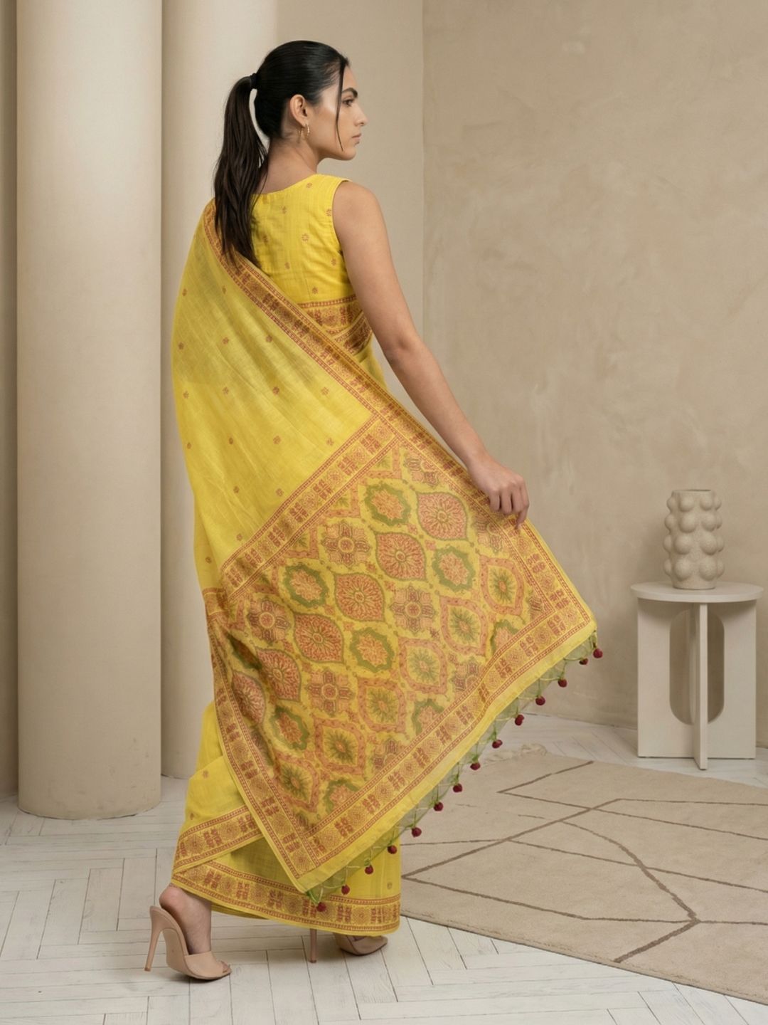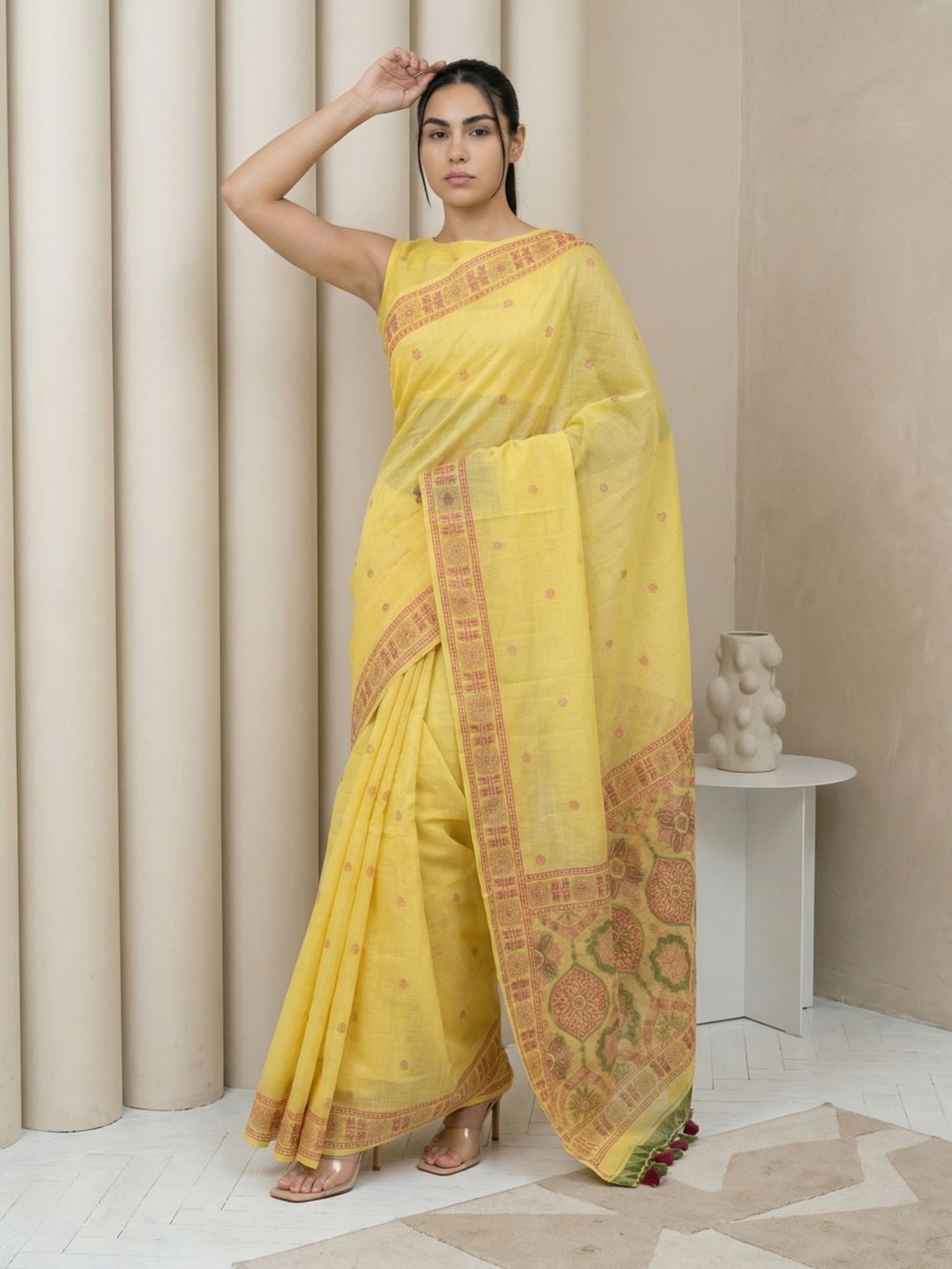 Yellow Muga Cotton Saree with Resham Weaving Meenakari Buttis, Pencil Art Pallu – Soft Summer Saree with Blouse Piece