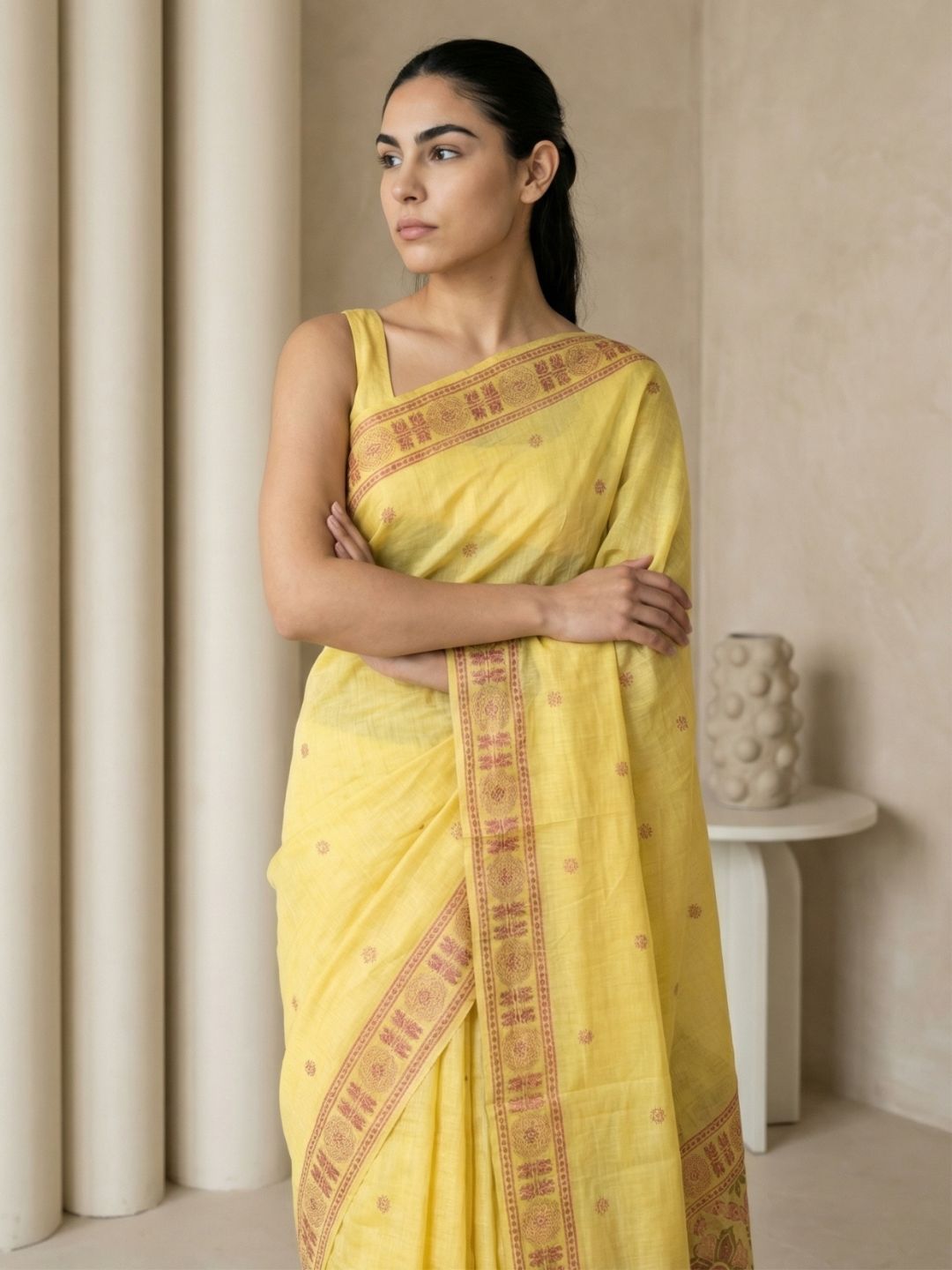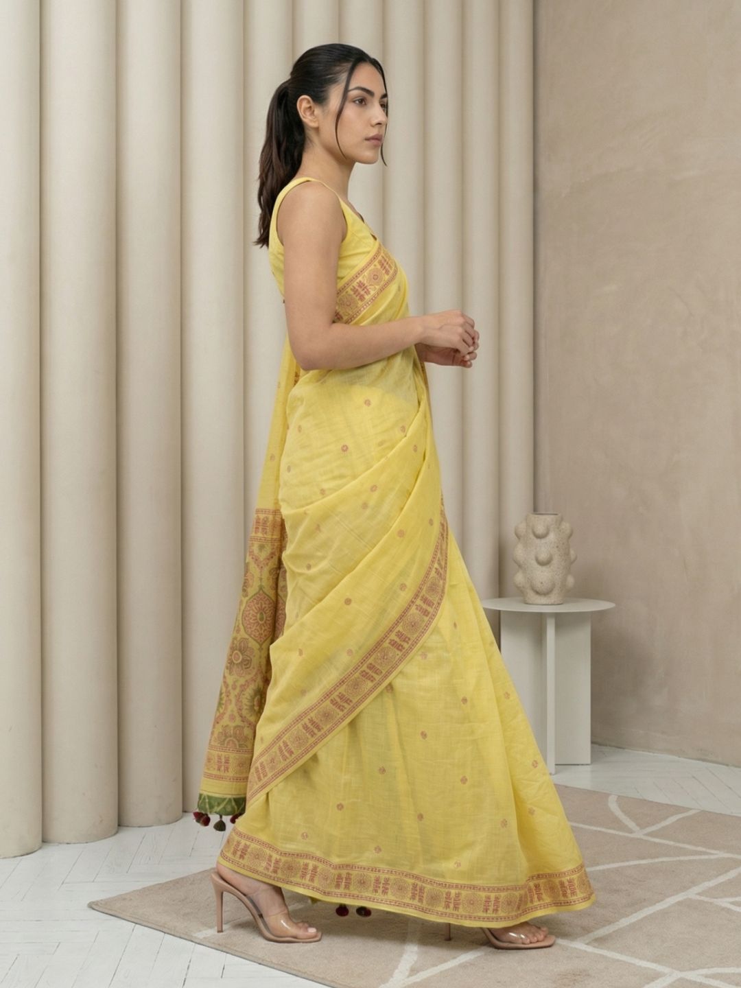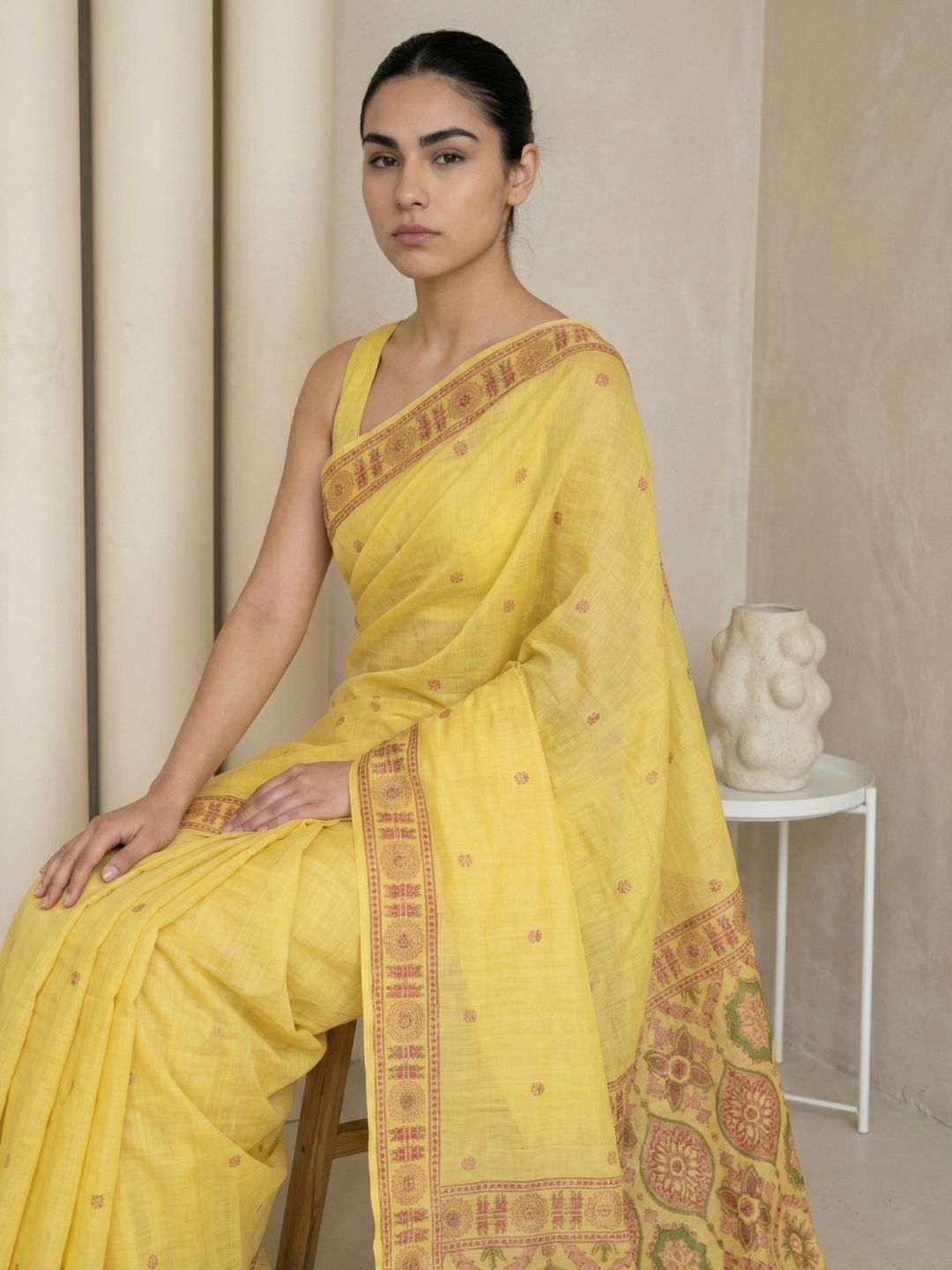 Yellow Muga Cotton Saree with Resham Weaving Meenakari Buttis, Pencil Art Pallu – Soft Summer Saree with Blouse Piece