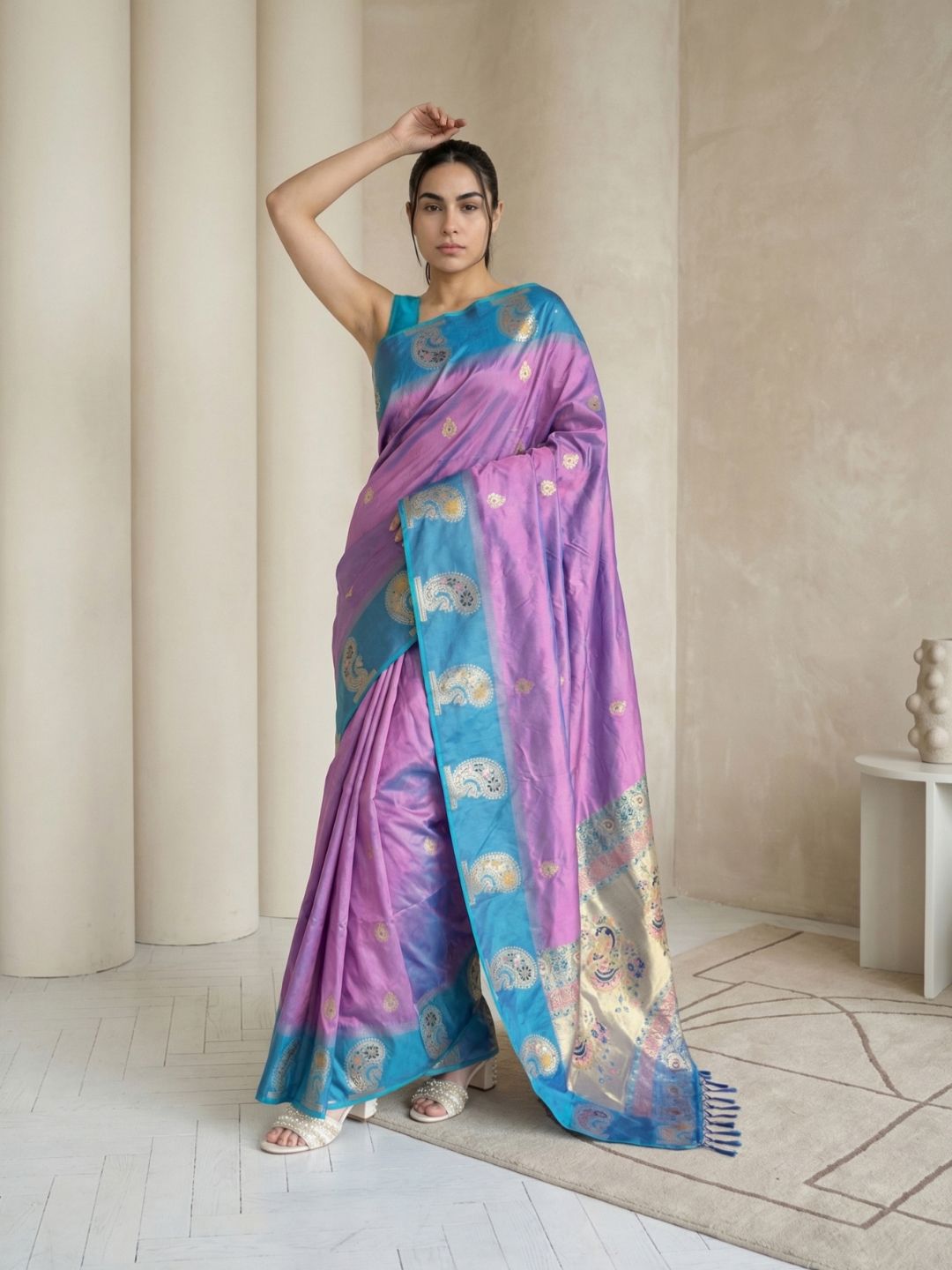 Sky Soft Silk Paithani Meenakari Saree Tilak Zari Woven Motifs Temple Border Saree With Brocade Blouse
