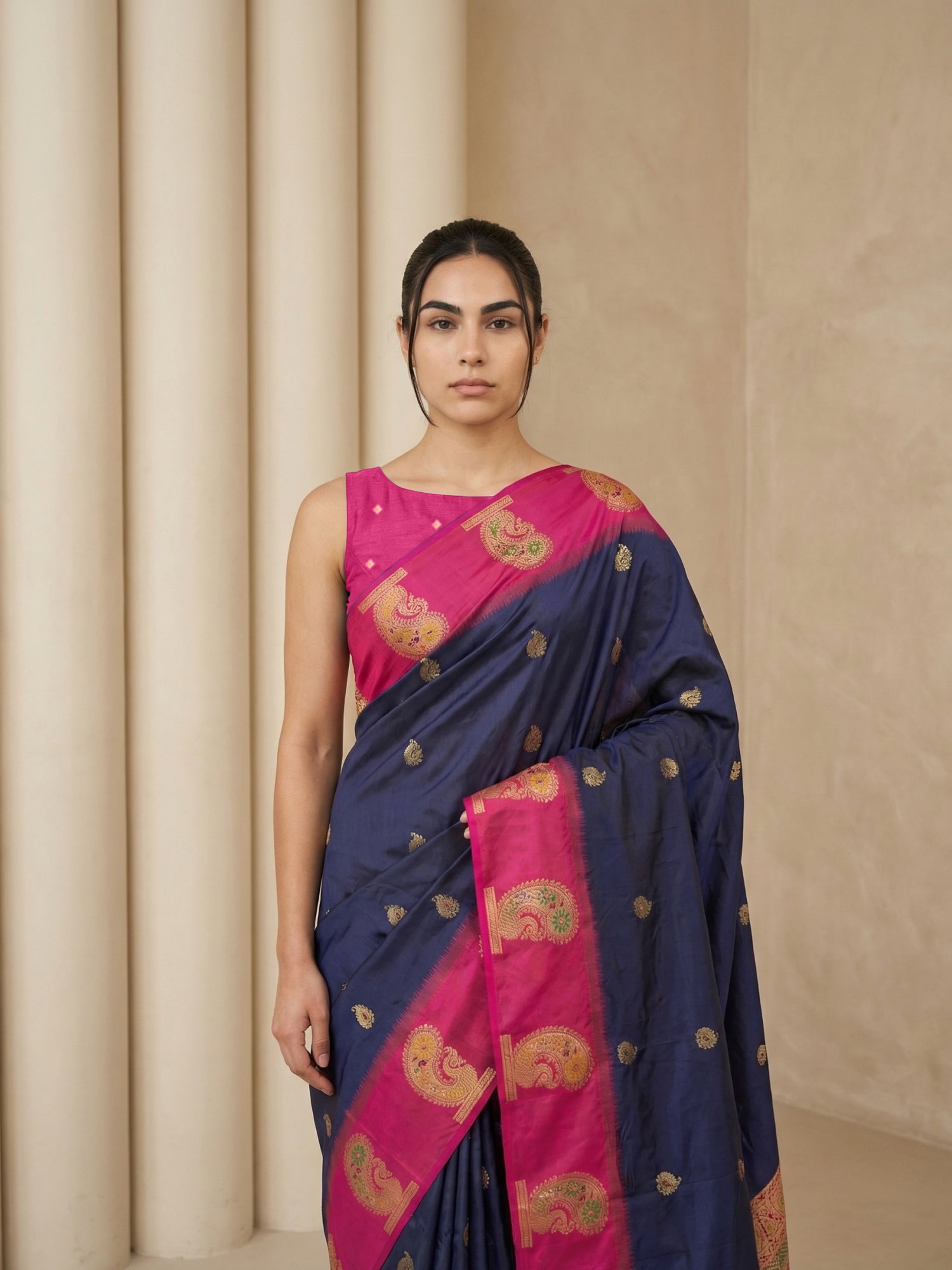 Navy Blue Soft Kashmiri Silk Zari Woven Contrast Saree