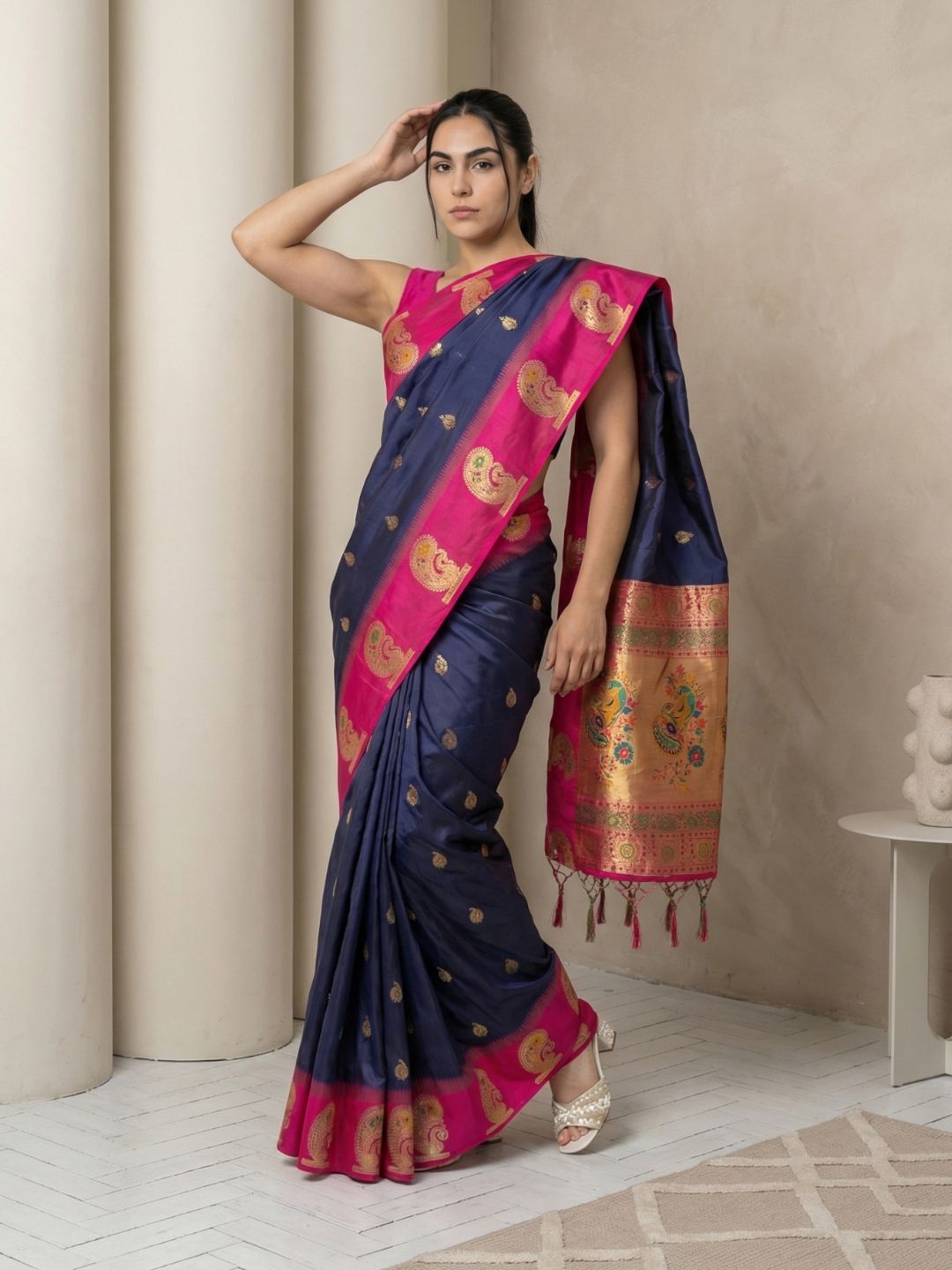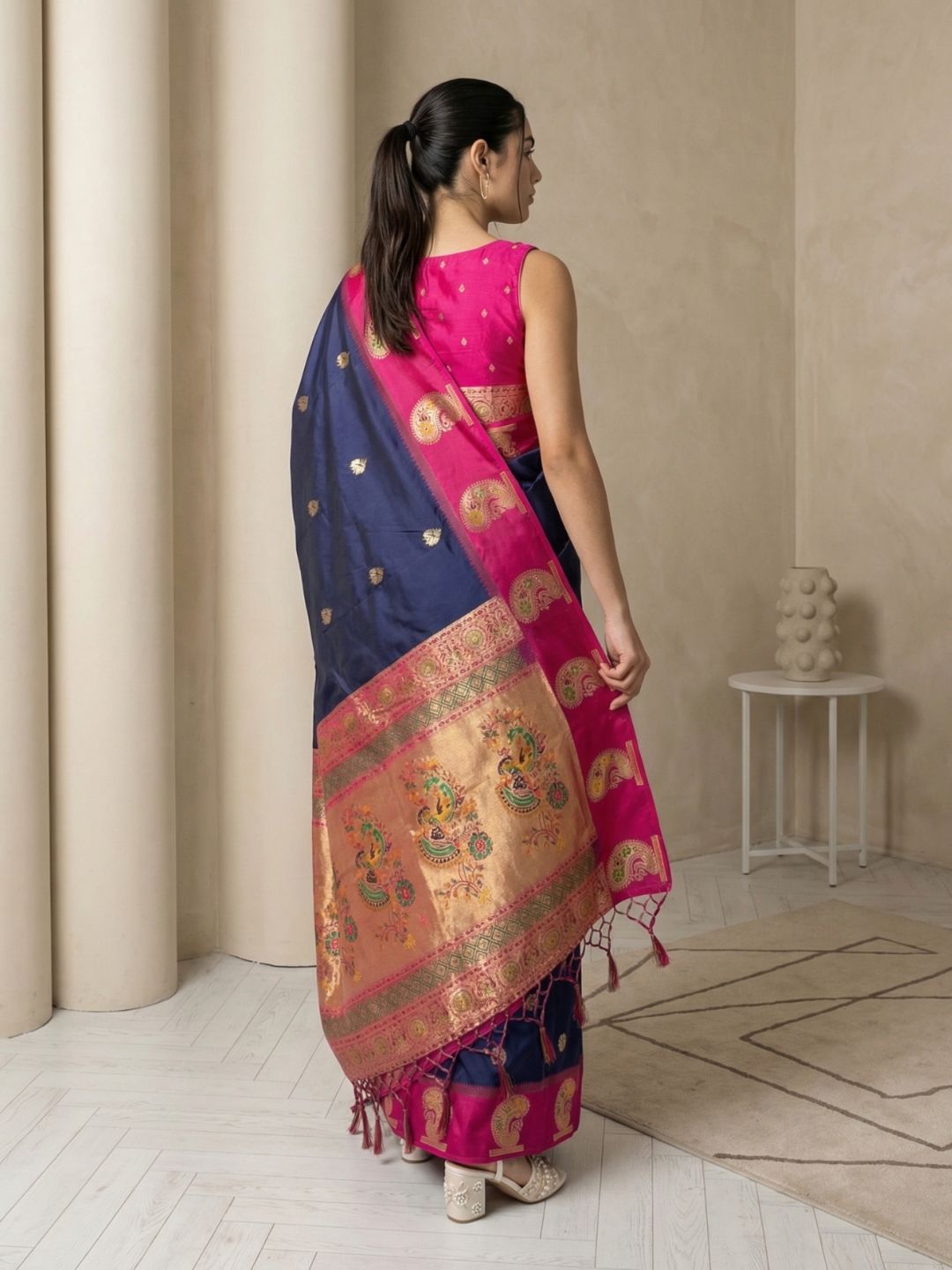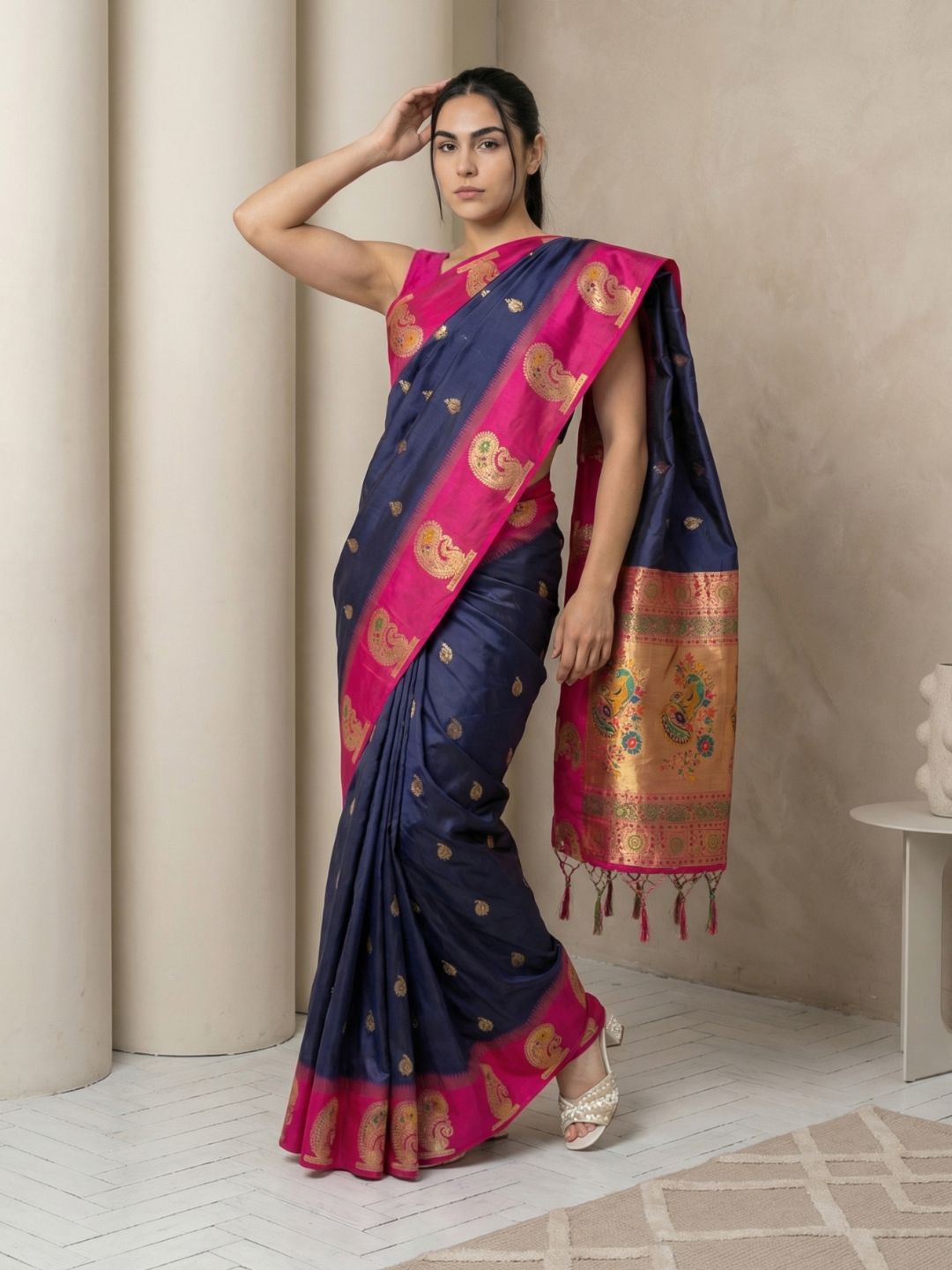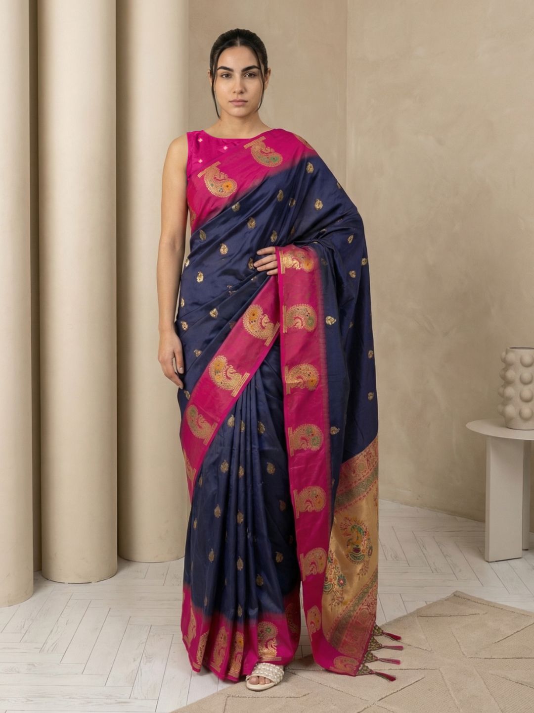 Navy Soft Silk Paithani Saree Meenakari Peacock Motifs Zari Woven Swan Pallu Saree With Brocade Blouse