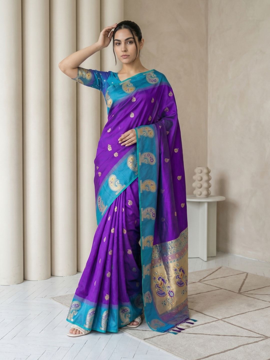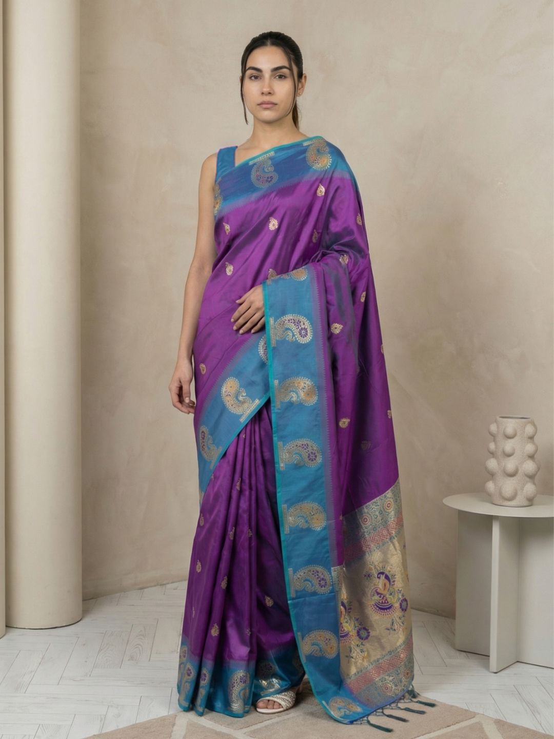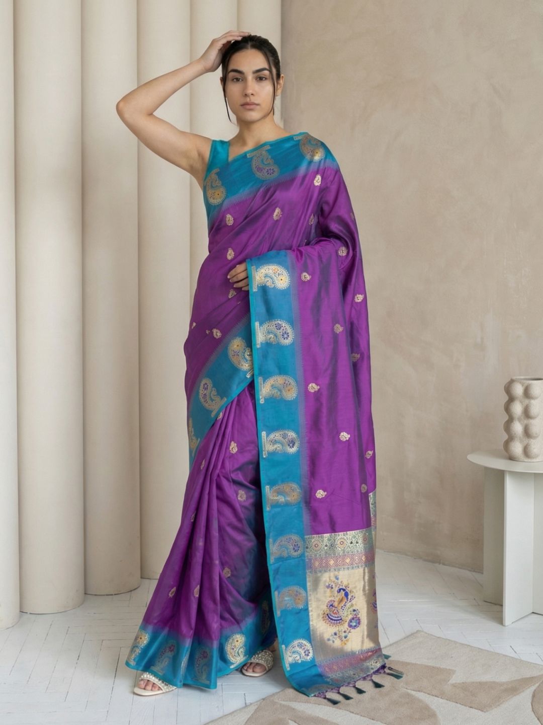 Violet Soft Silk Paithani Meenakari Saree Tilak Zari Woven Motifs Temple Border Saree With Brocade Blouse