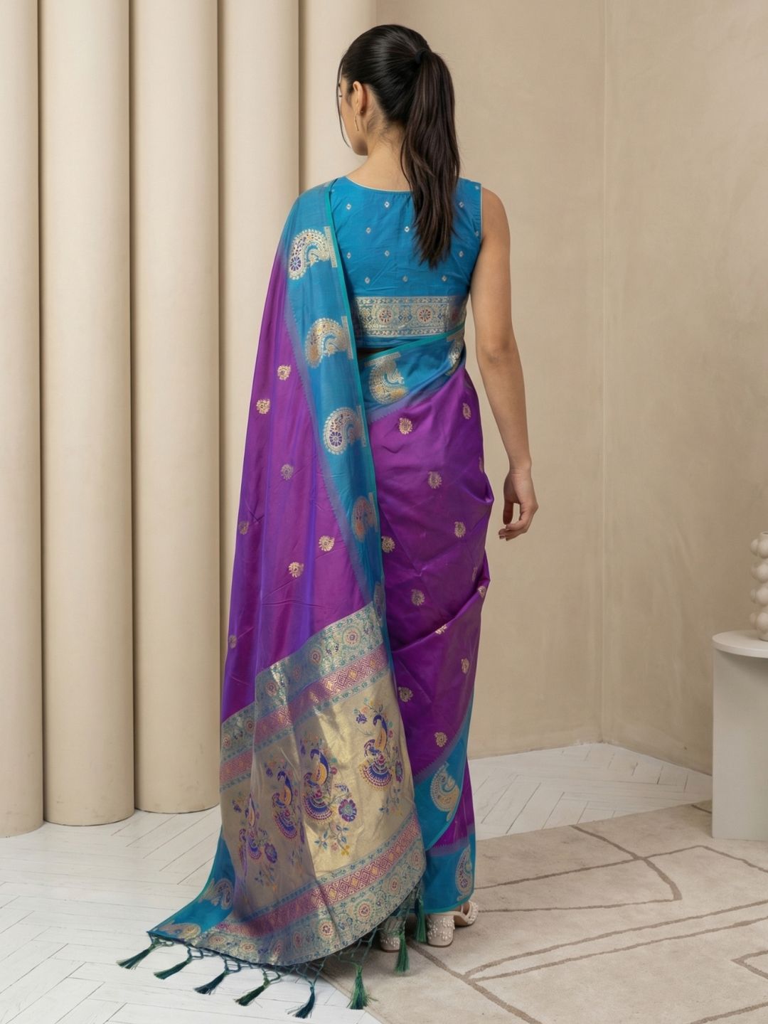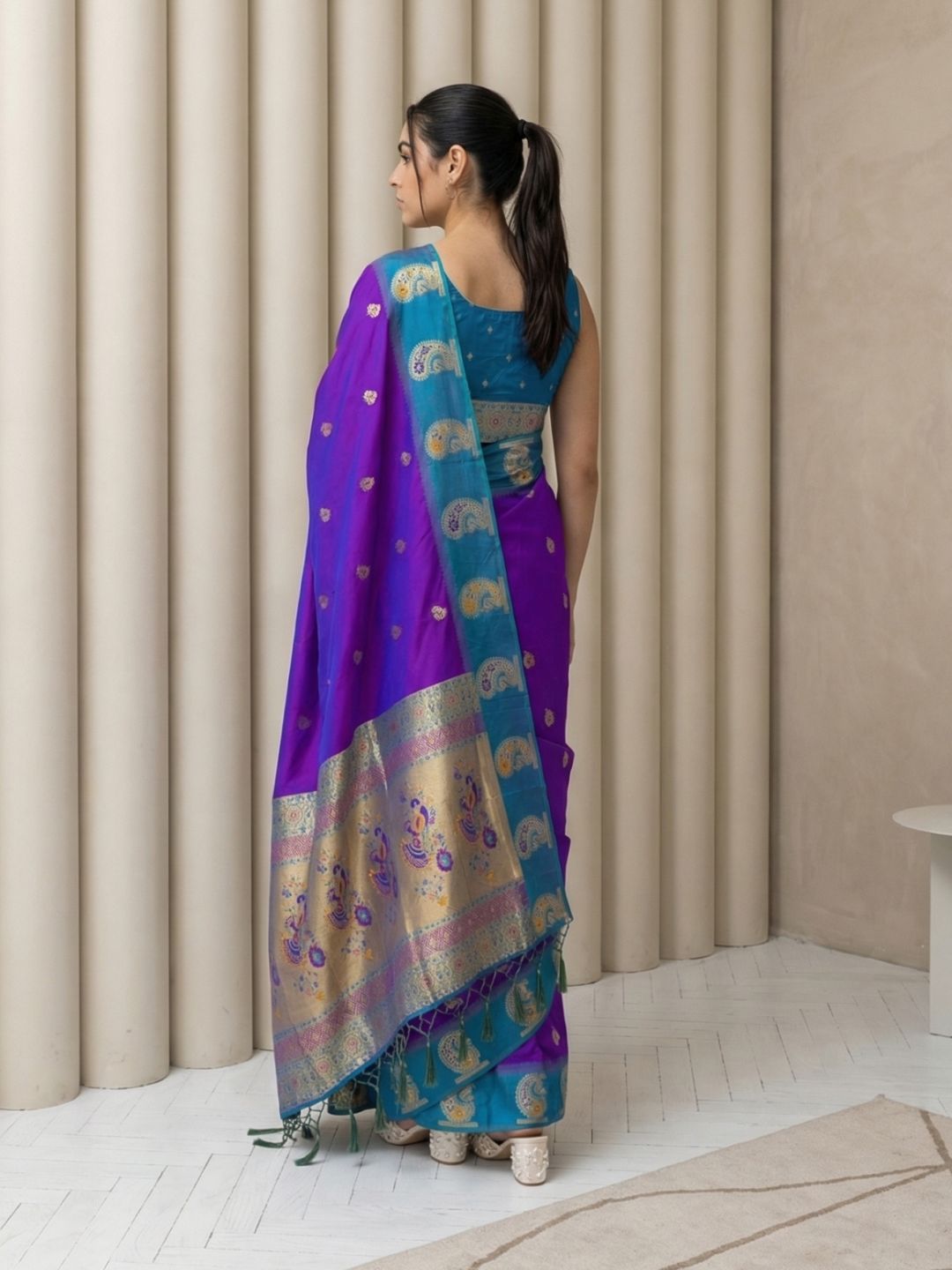 Purple Soft Silk Paithani Saree Meenakari Peacock Motifs Zari Woven Swan Pallu Saree With Brocade Blouse
