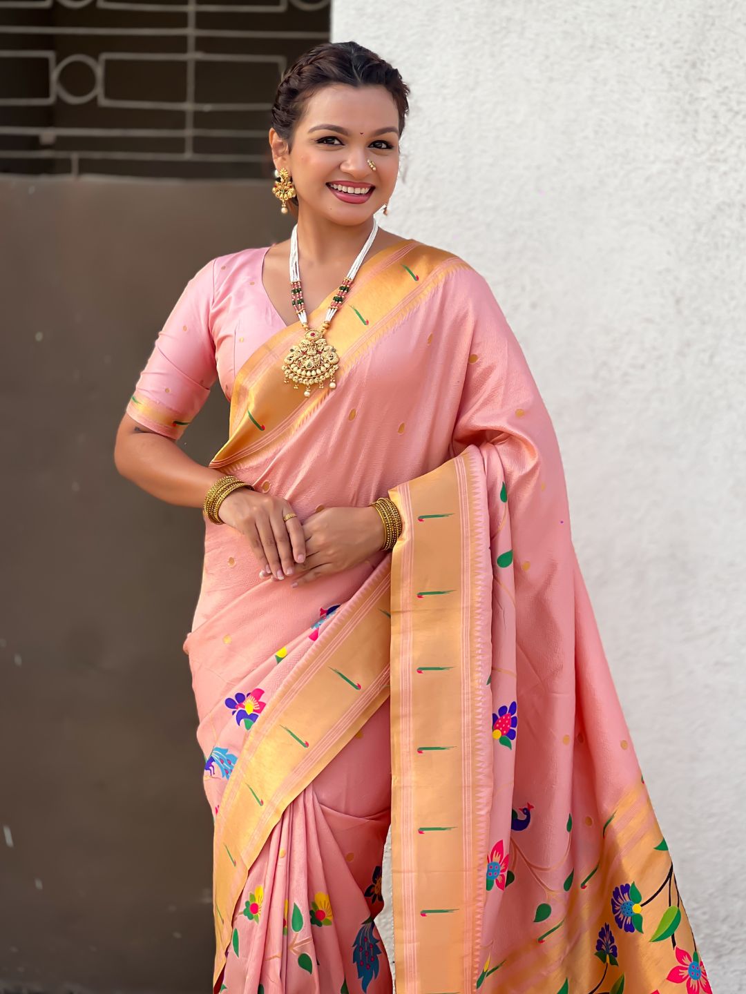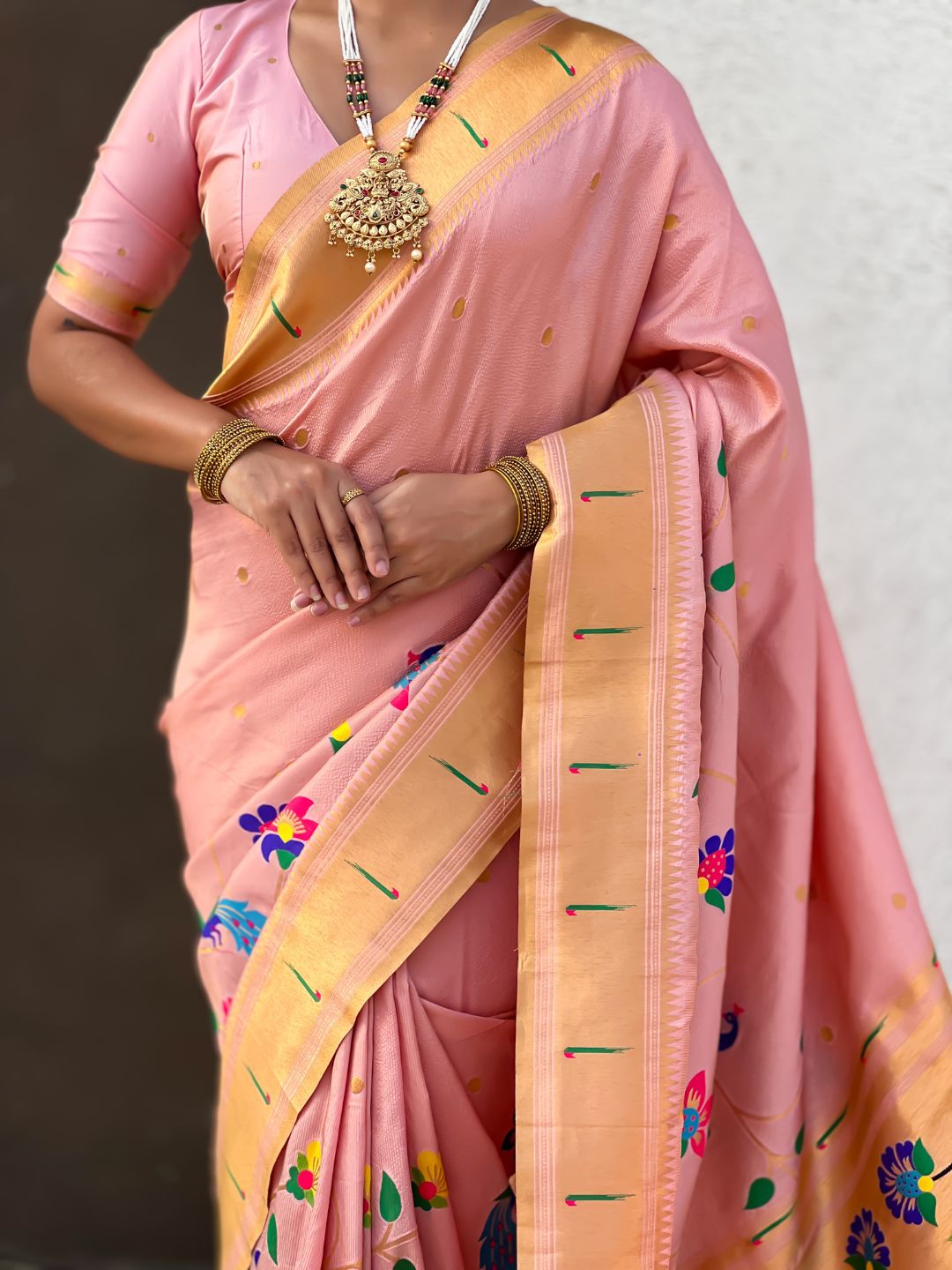 Baby Pink Pastel Zari Woven Peacock Lotus Paithani Silk Saree