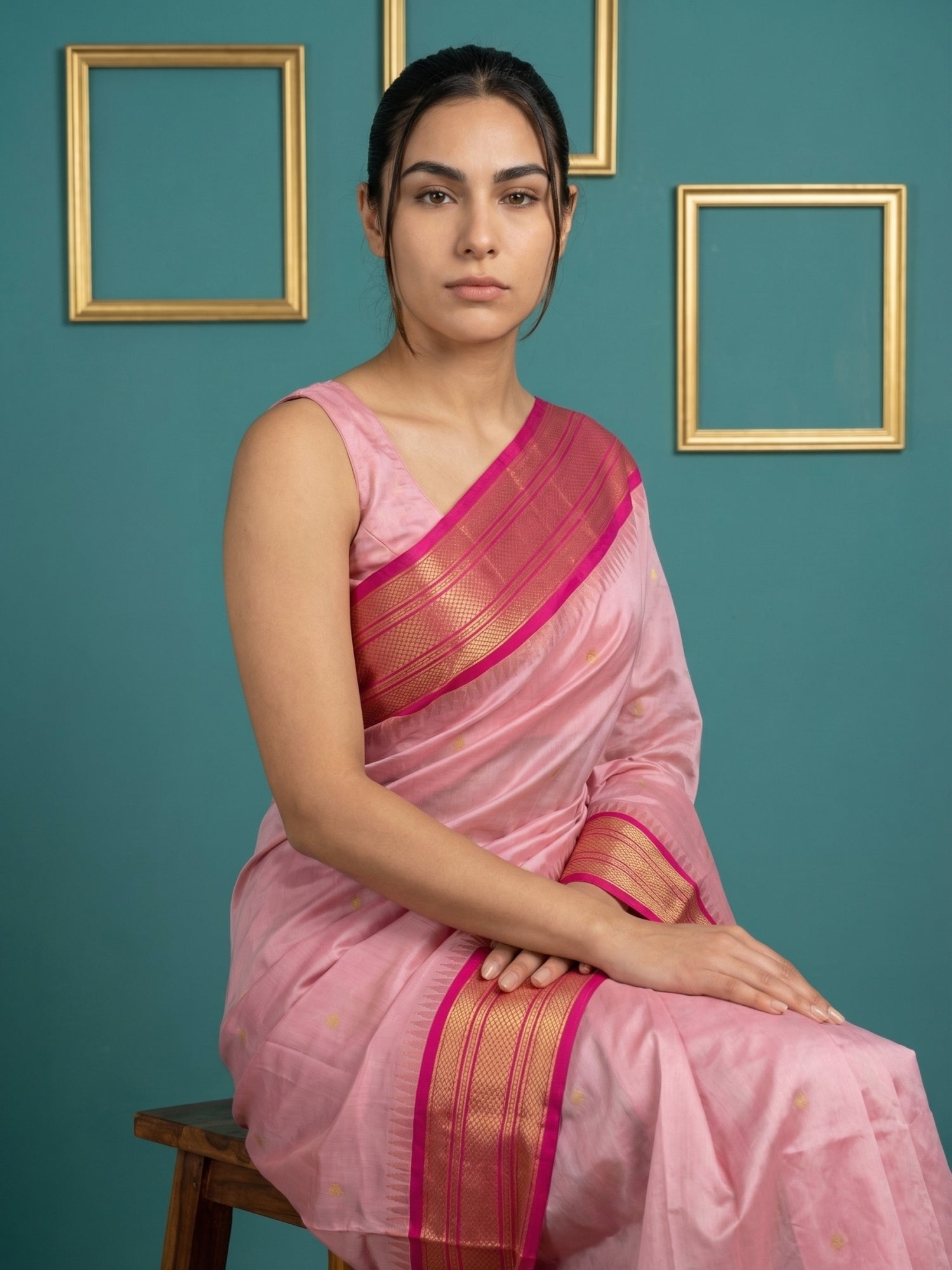 Baby Pink Wedding Special Nauvari Paithani Soft Silk Saree with Zari Woven Polka Motifs and Peacock Pallu