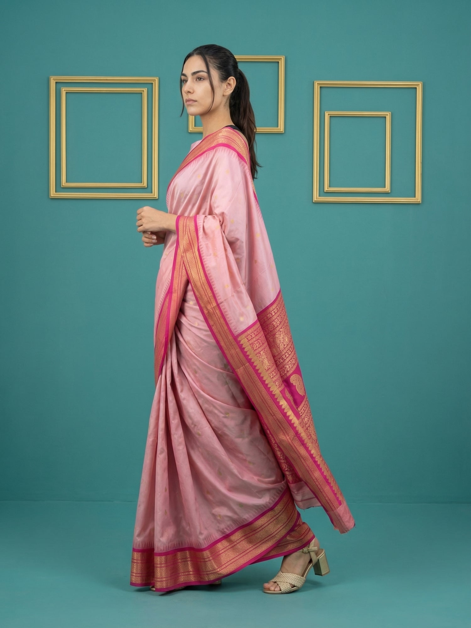 Baby Pink Paithani Silk Saree with Half Half Concept Big Border Zari Woven Saree