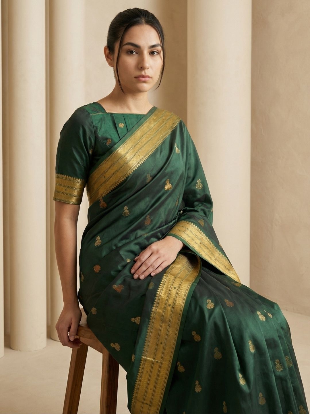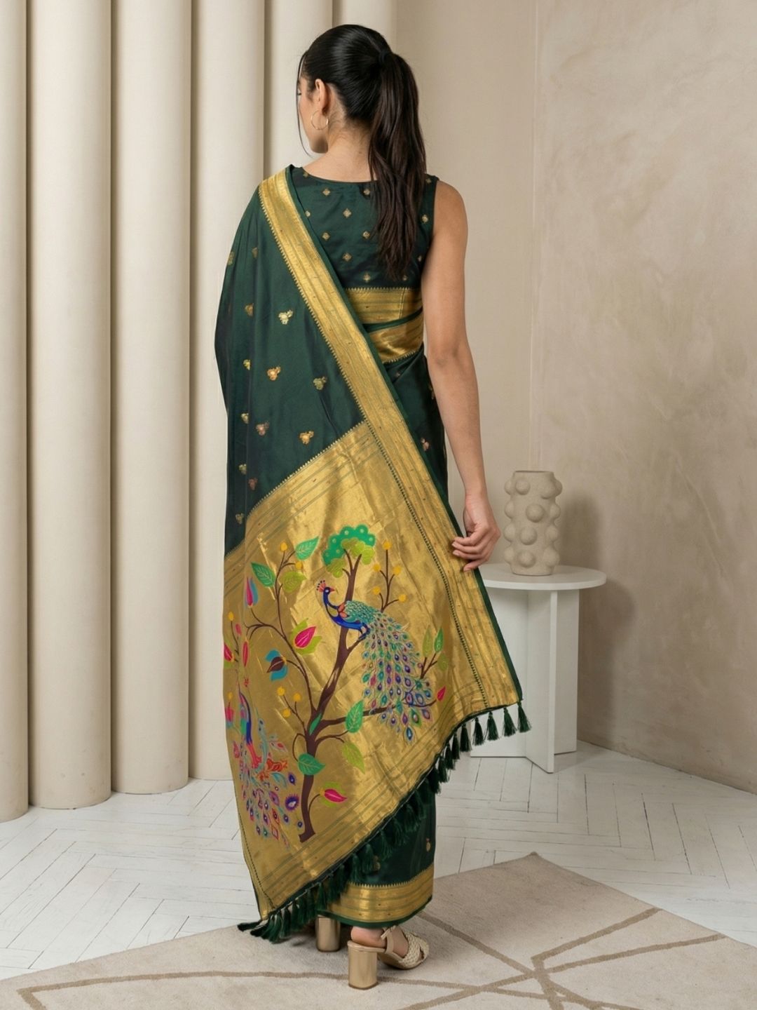 BGreen Paithani Silk Saree with Jhumka Zari Motifs, Meenakari Peacock Pallu and Triple Muniya Border
