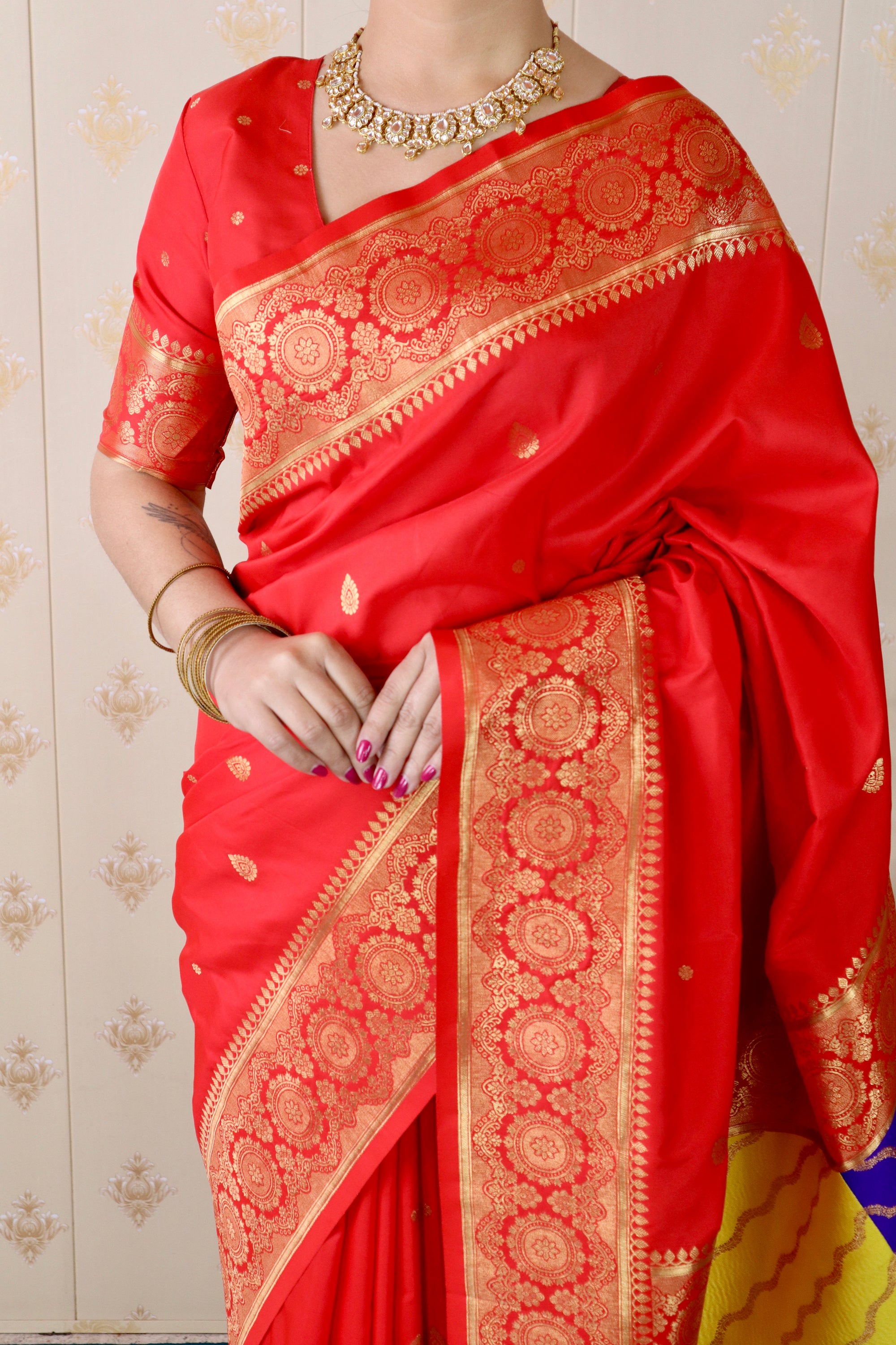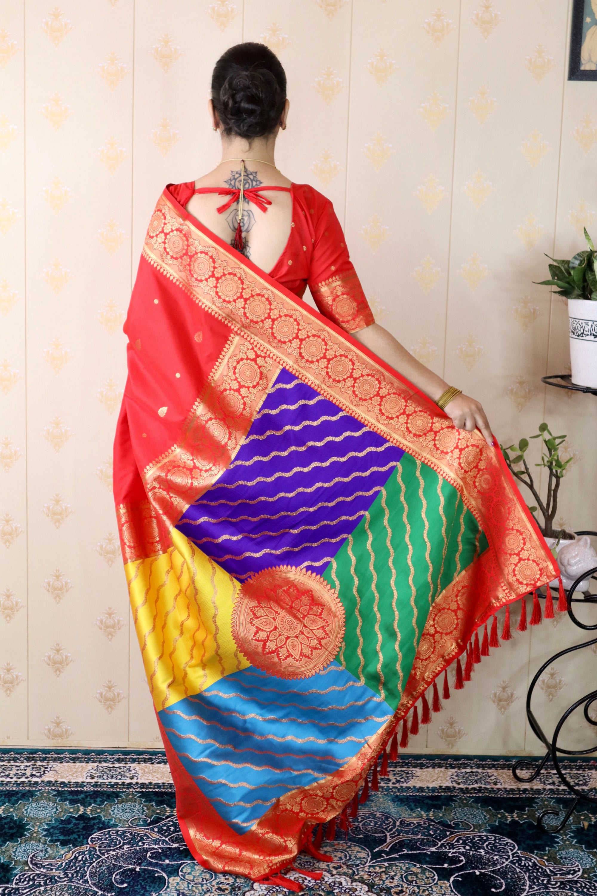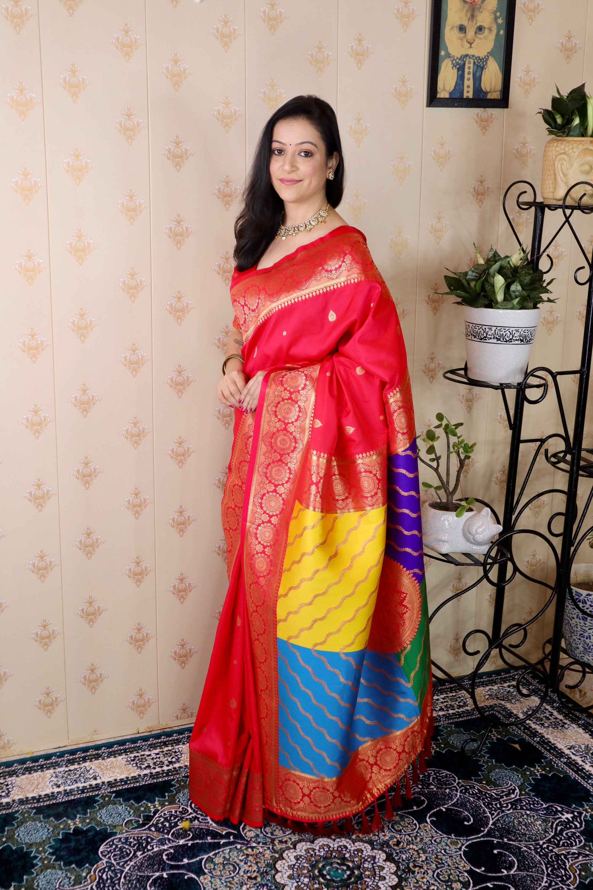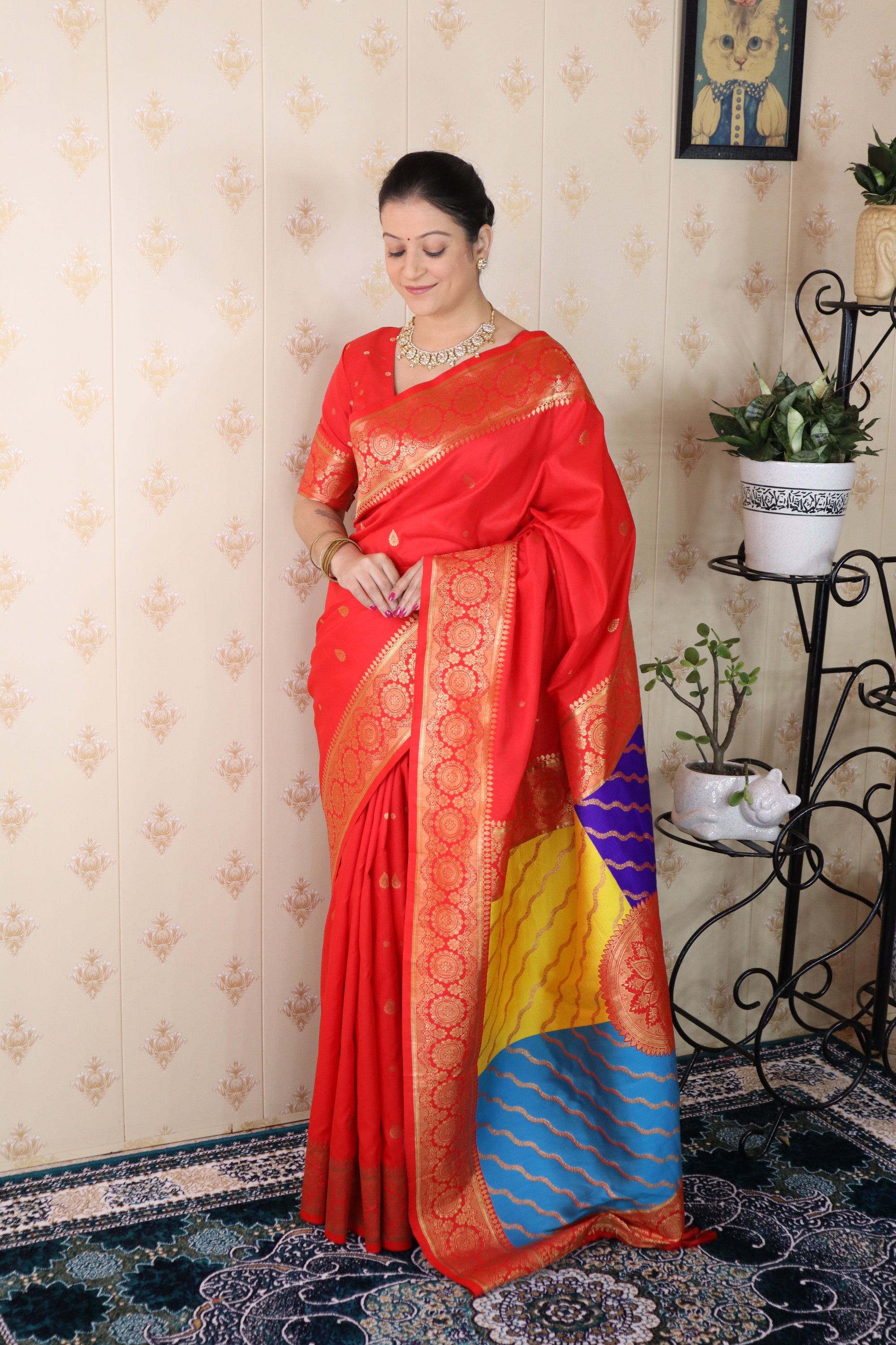 Red Soft Silk Banarasi Multicolor Pallu Zari Woven Saree