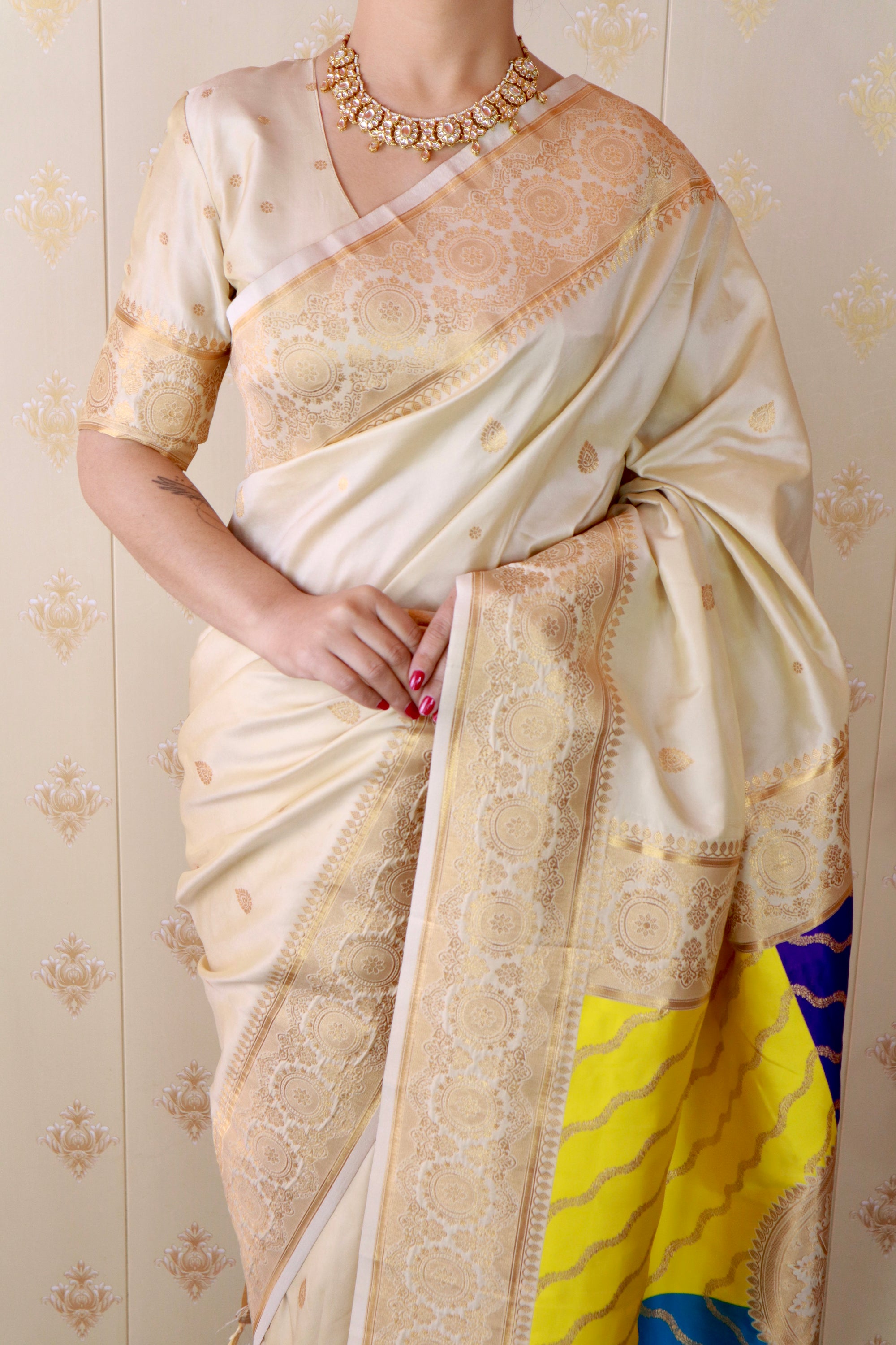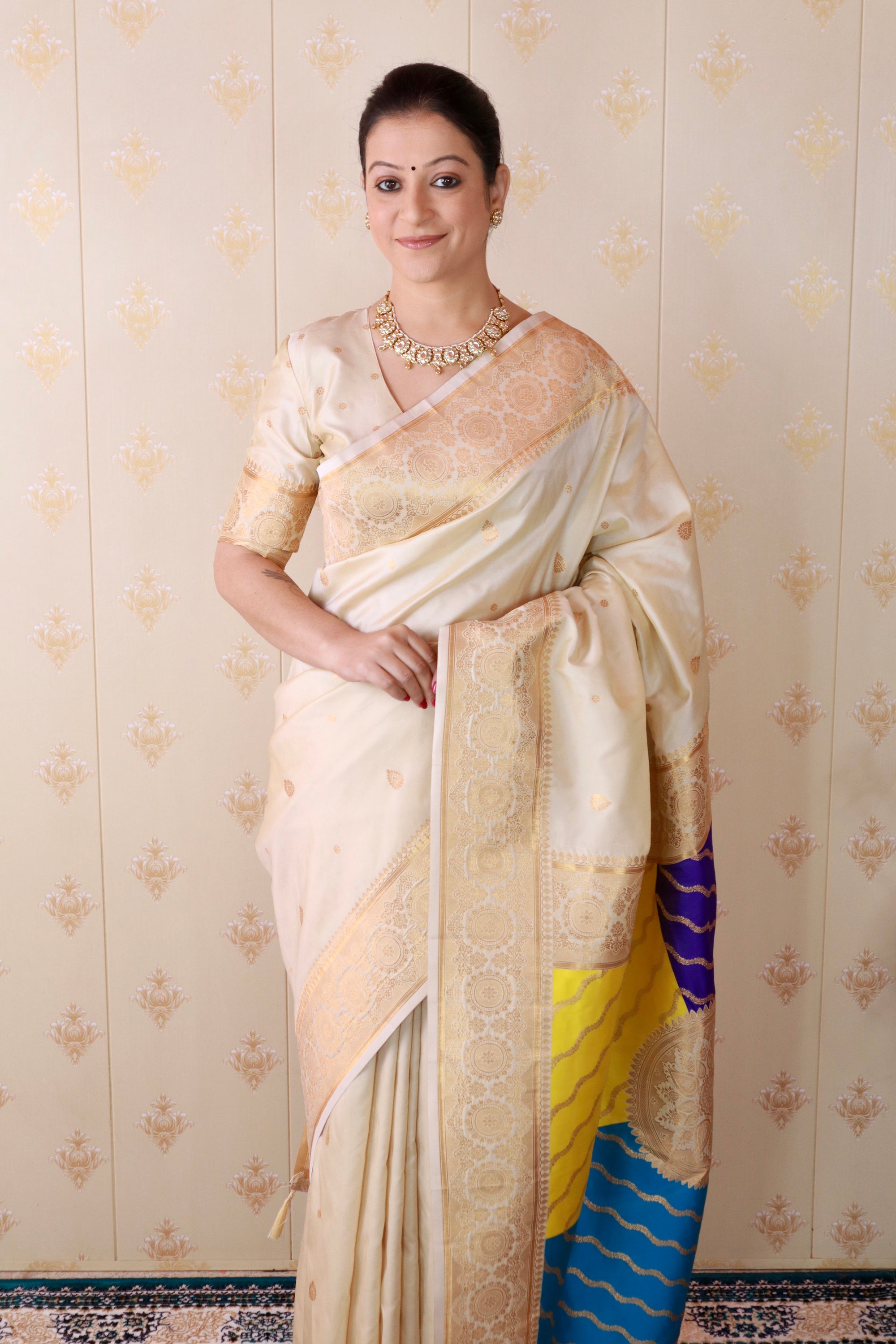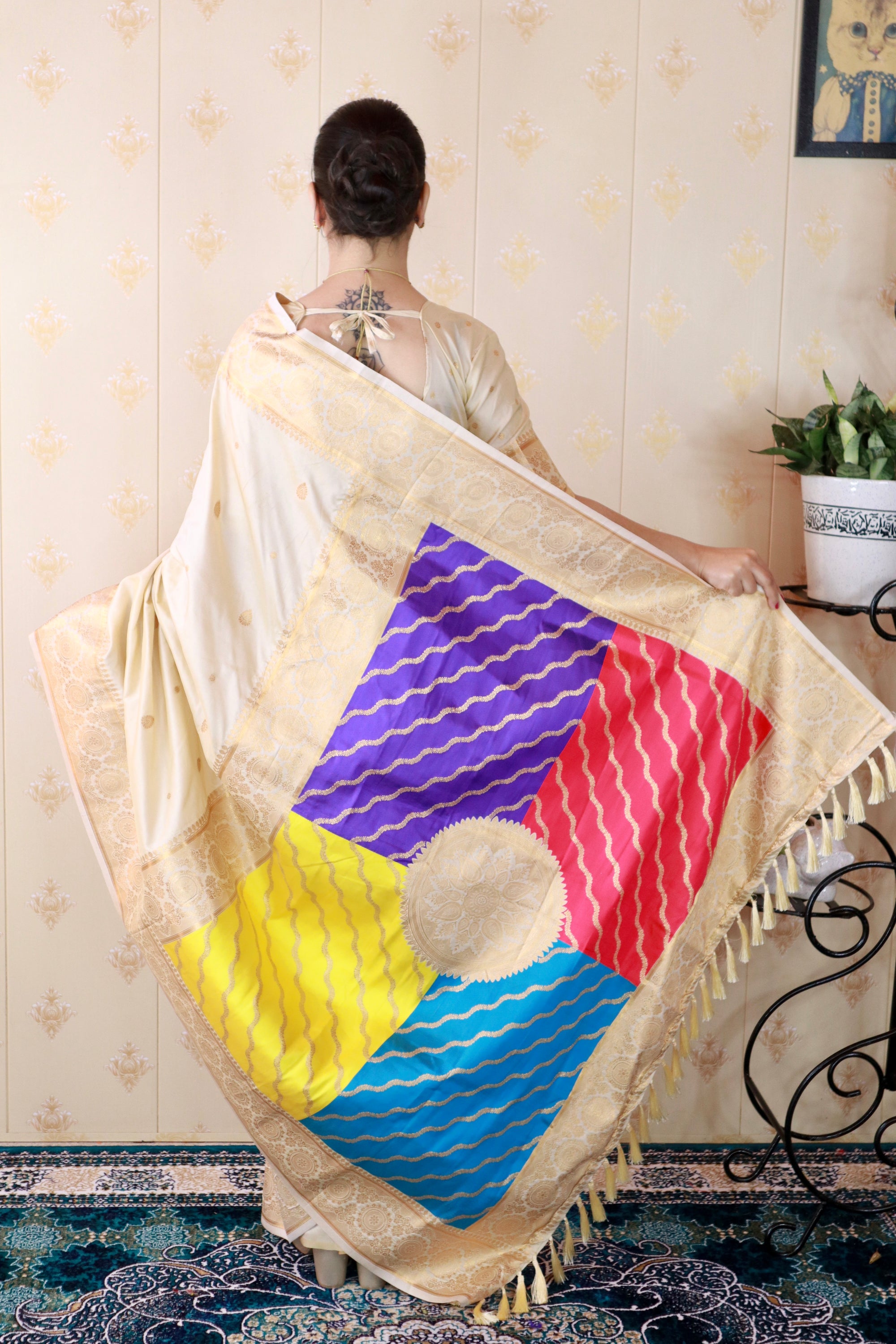 Cream Soft Silk Banarasi Multicolor Pallu Zari Woven Saree
