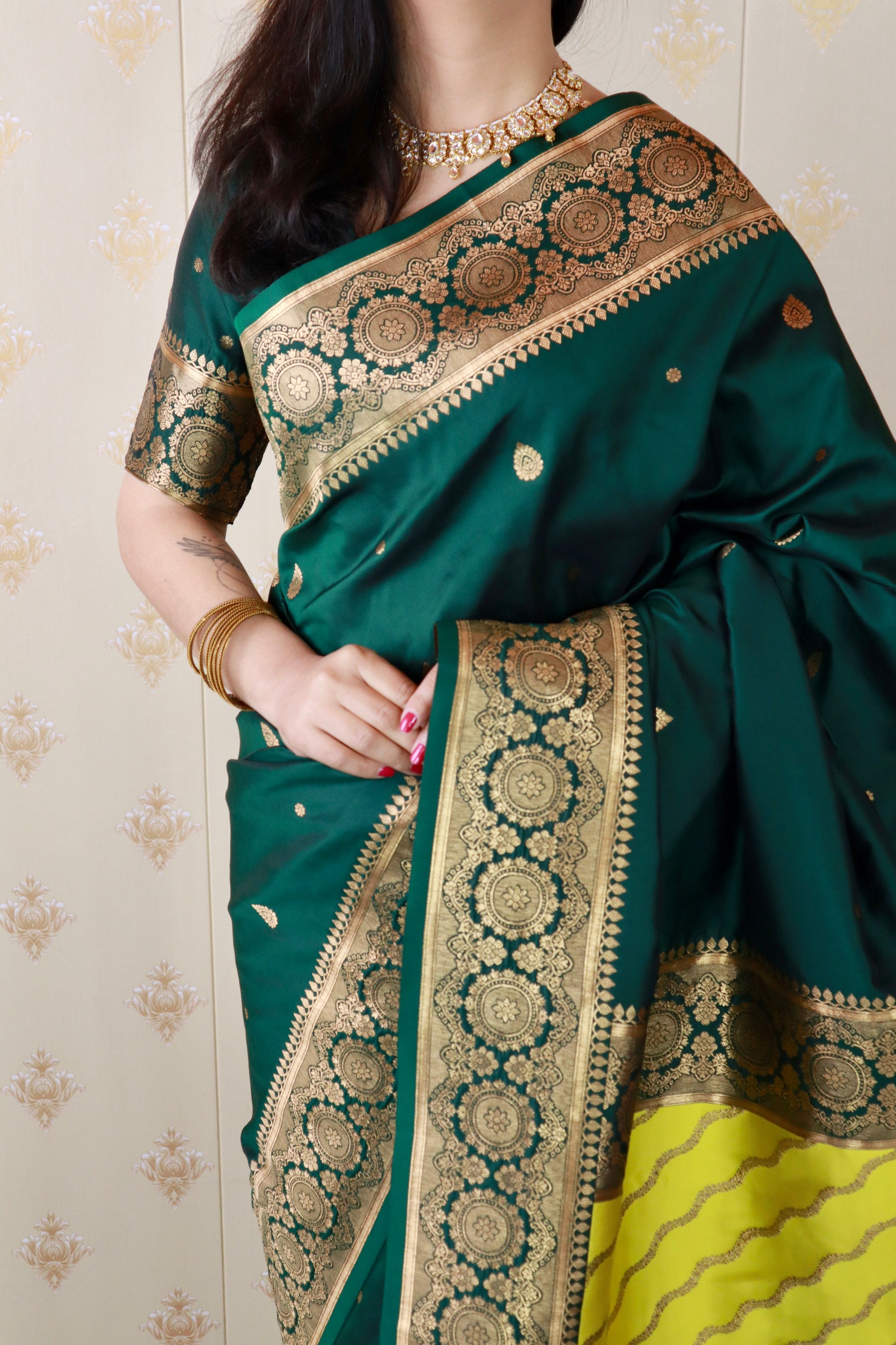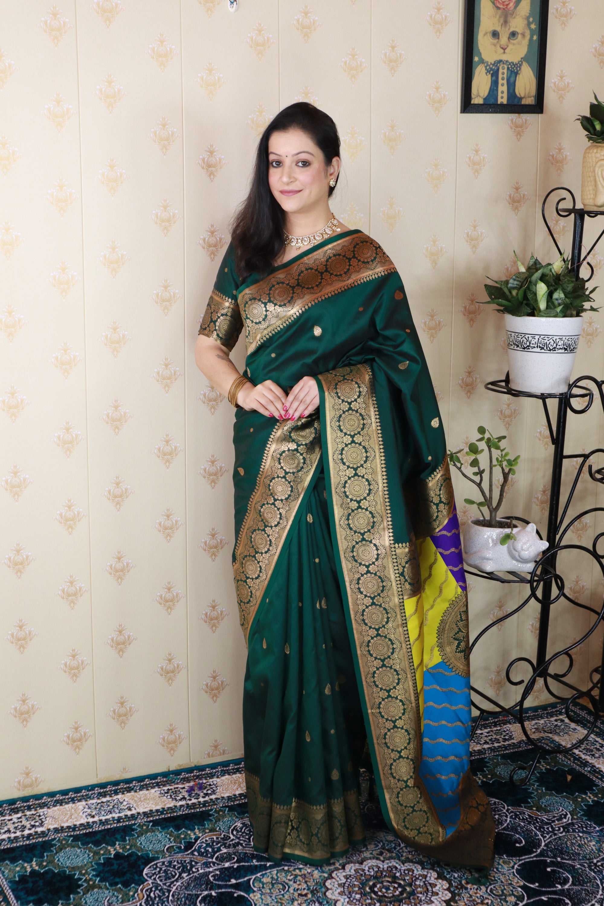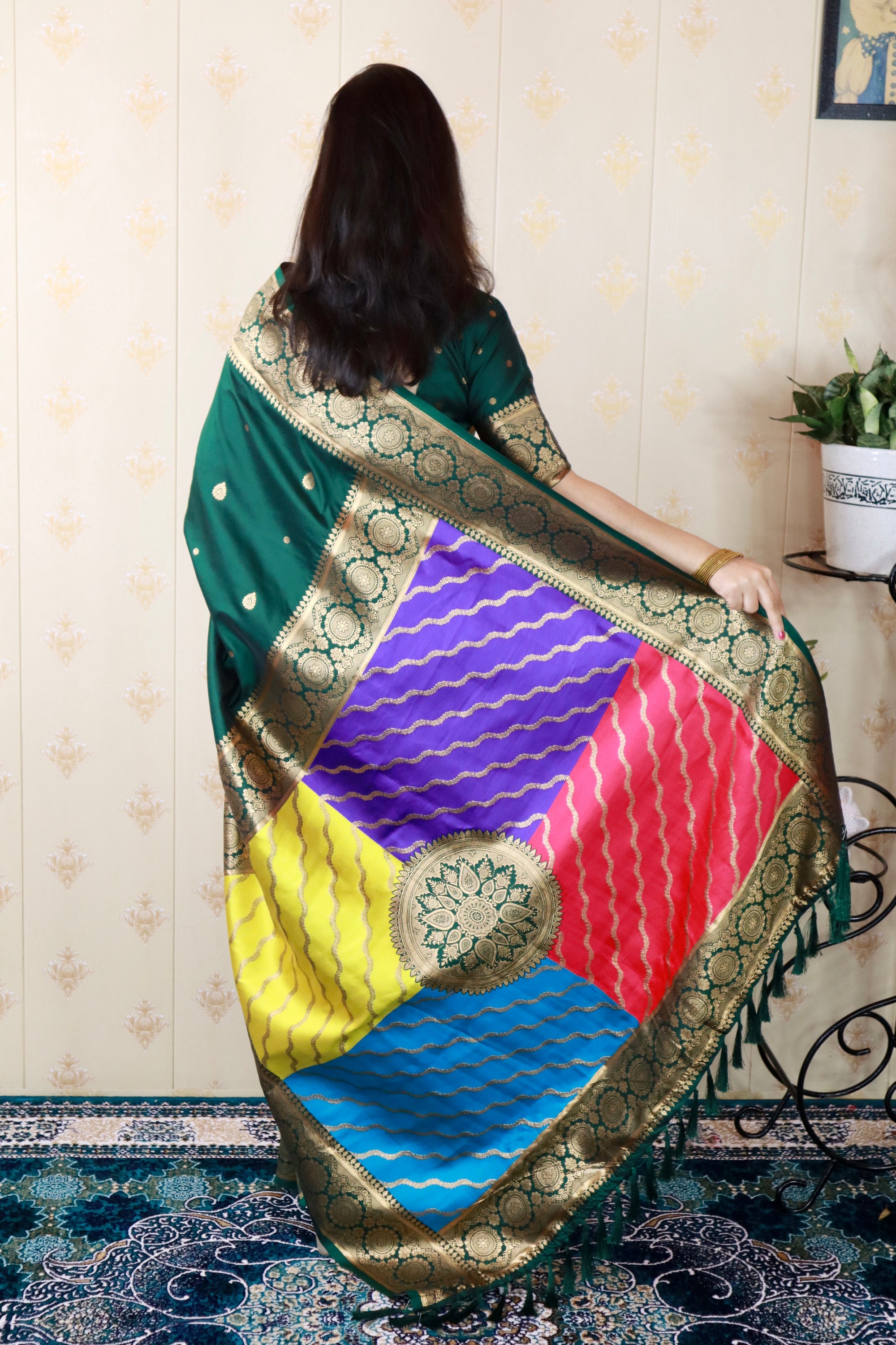 Bottle Green Soft Silk Banarasi Multicolor Pallu Zari Woven Saree