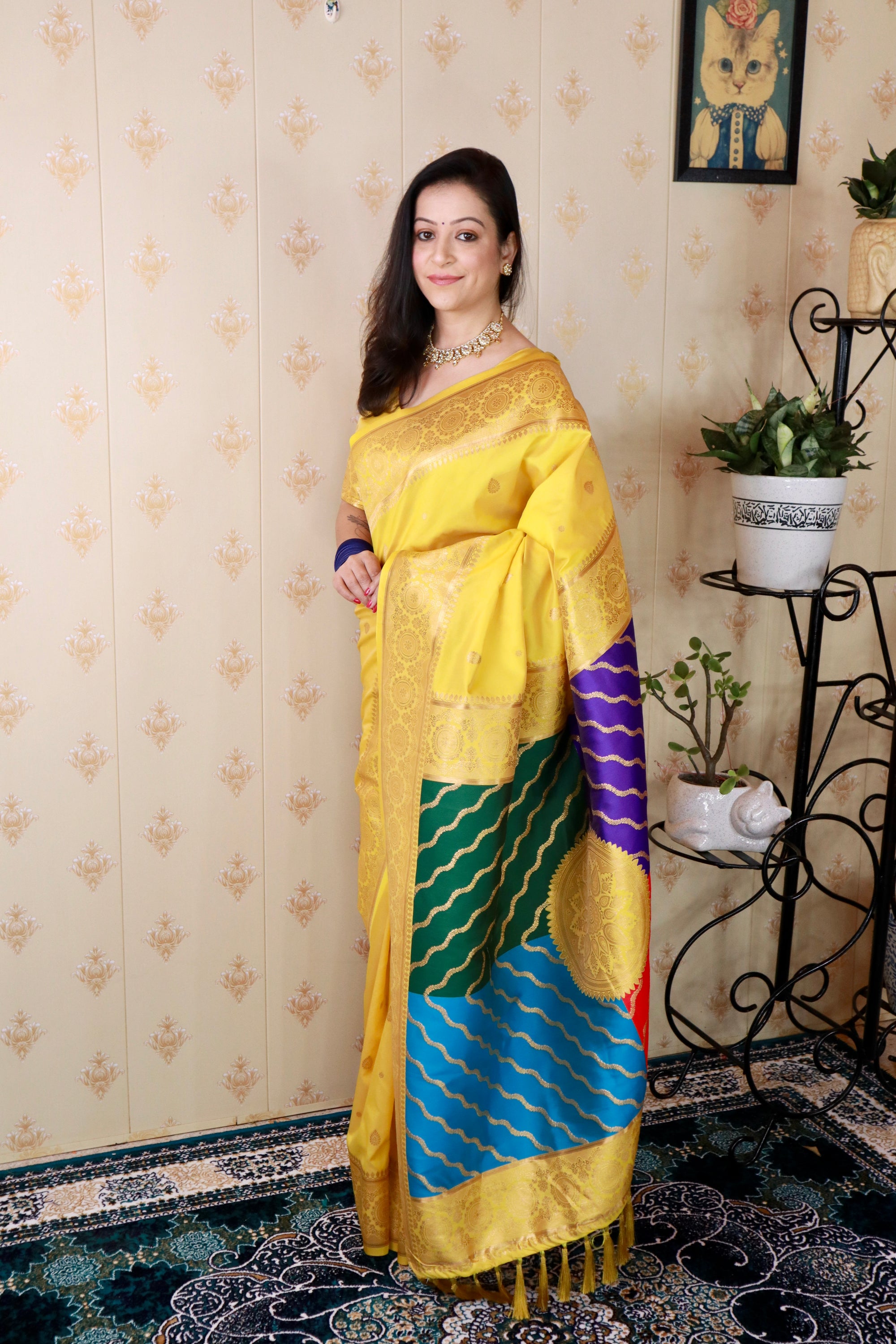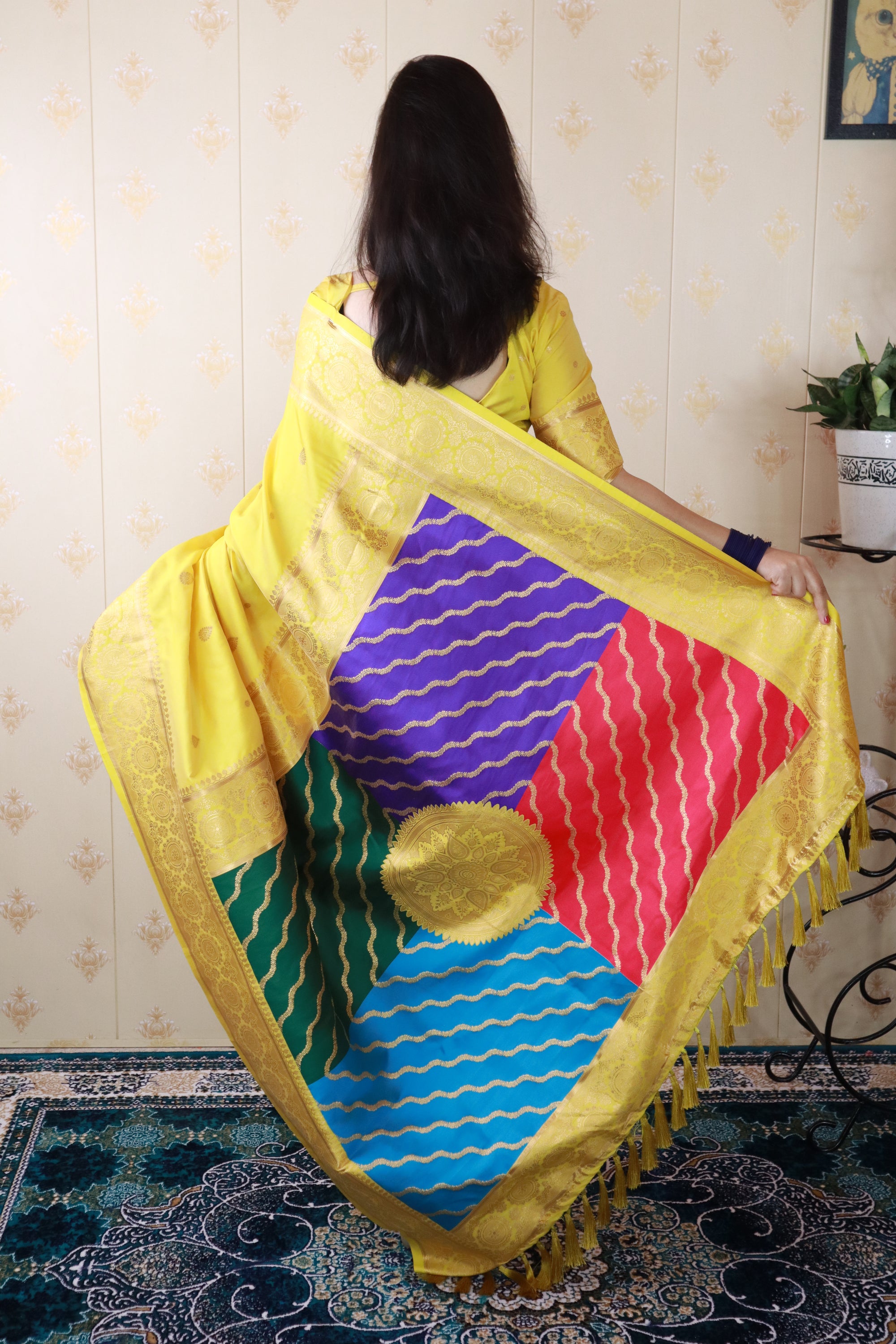 Yellow Soft Silk Banarasi Multicolor Pallu Zari Woven Saree