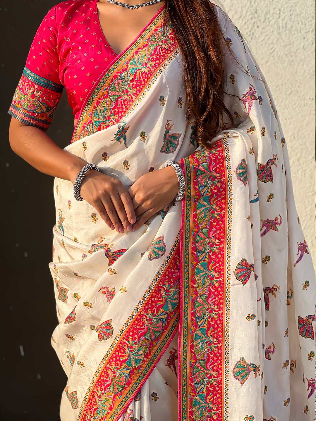 White Pure Viscose Silk Position Printed Traditional Darbari Saree