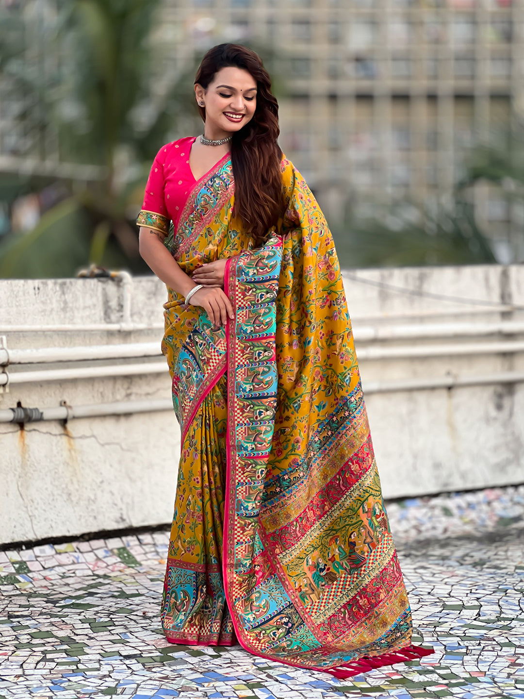 Mustard Yellow Pure Viscose Silk Position Printed Darbari Saree