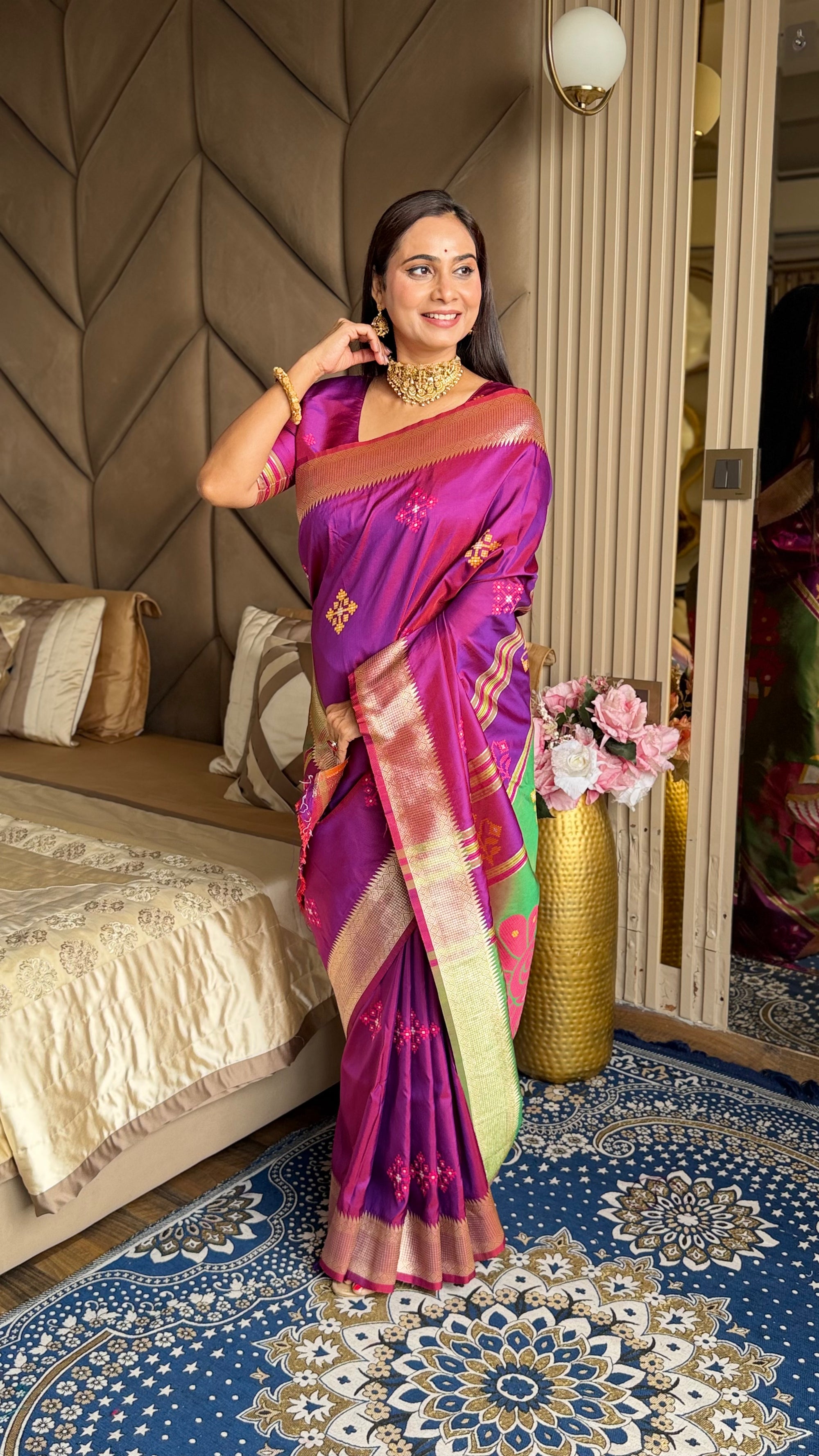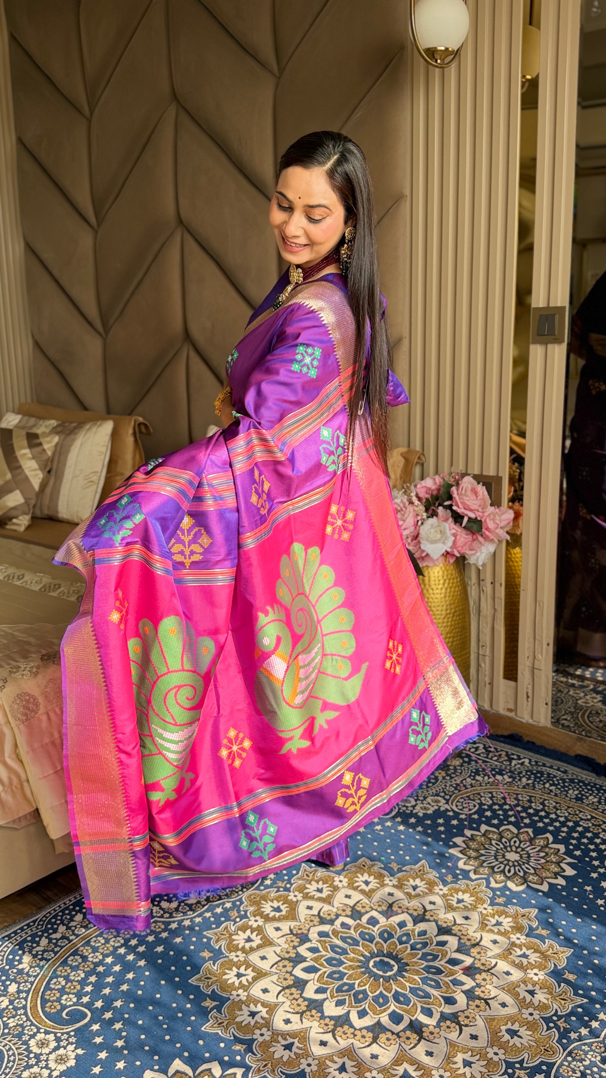 Violet Soft Silk Ikkat Patola Saree with Meenakari Motifs Peacock Pallu and Gold Zari Border
