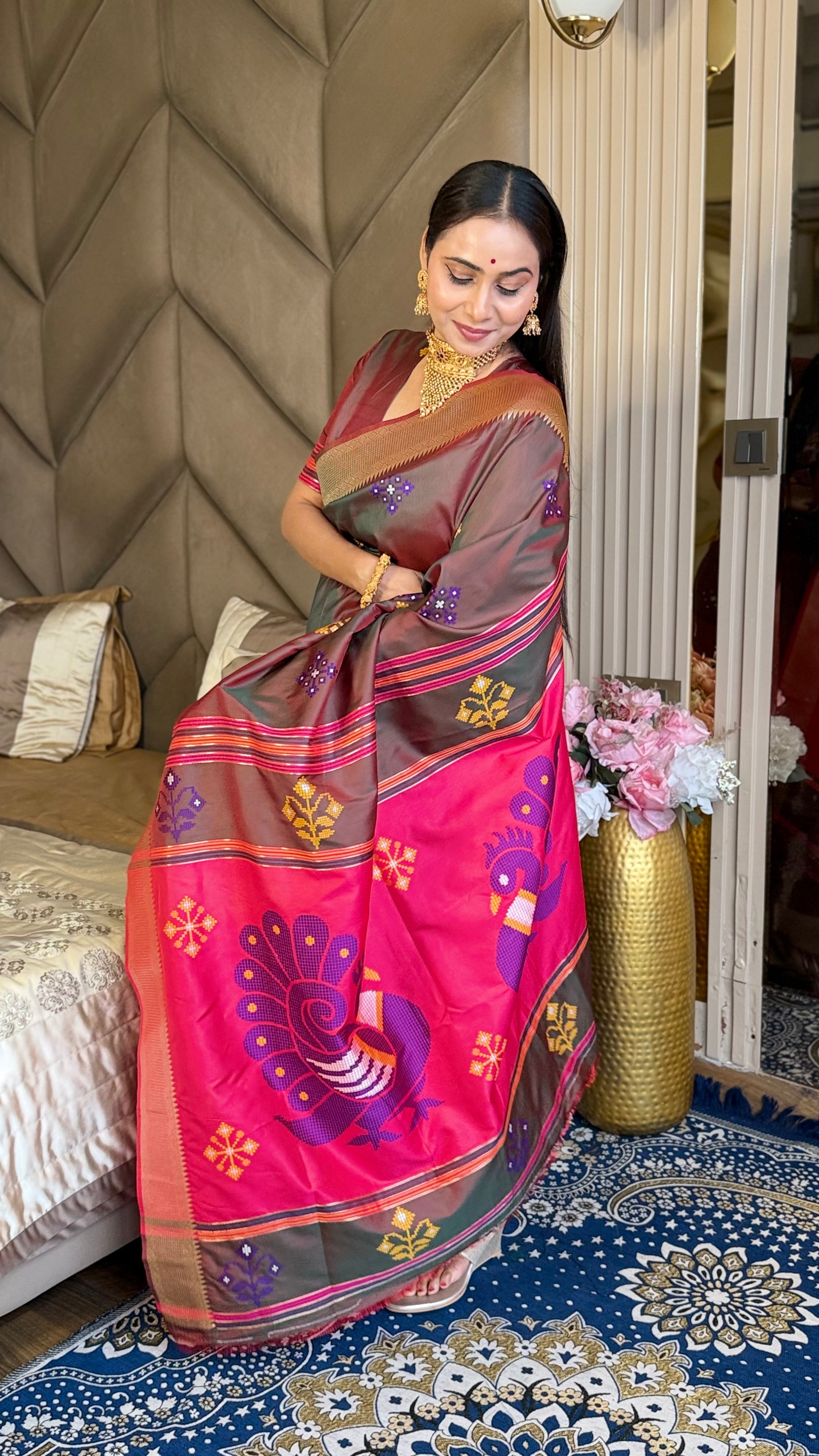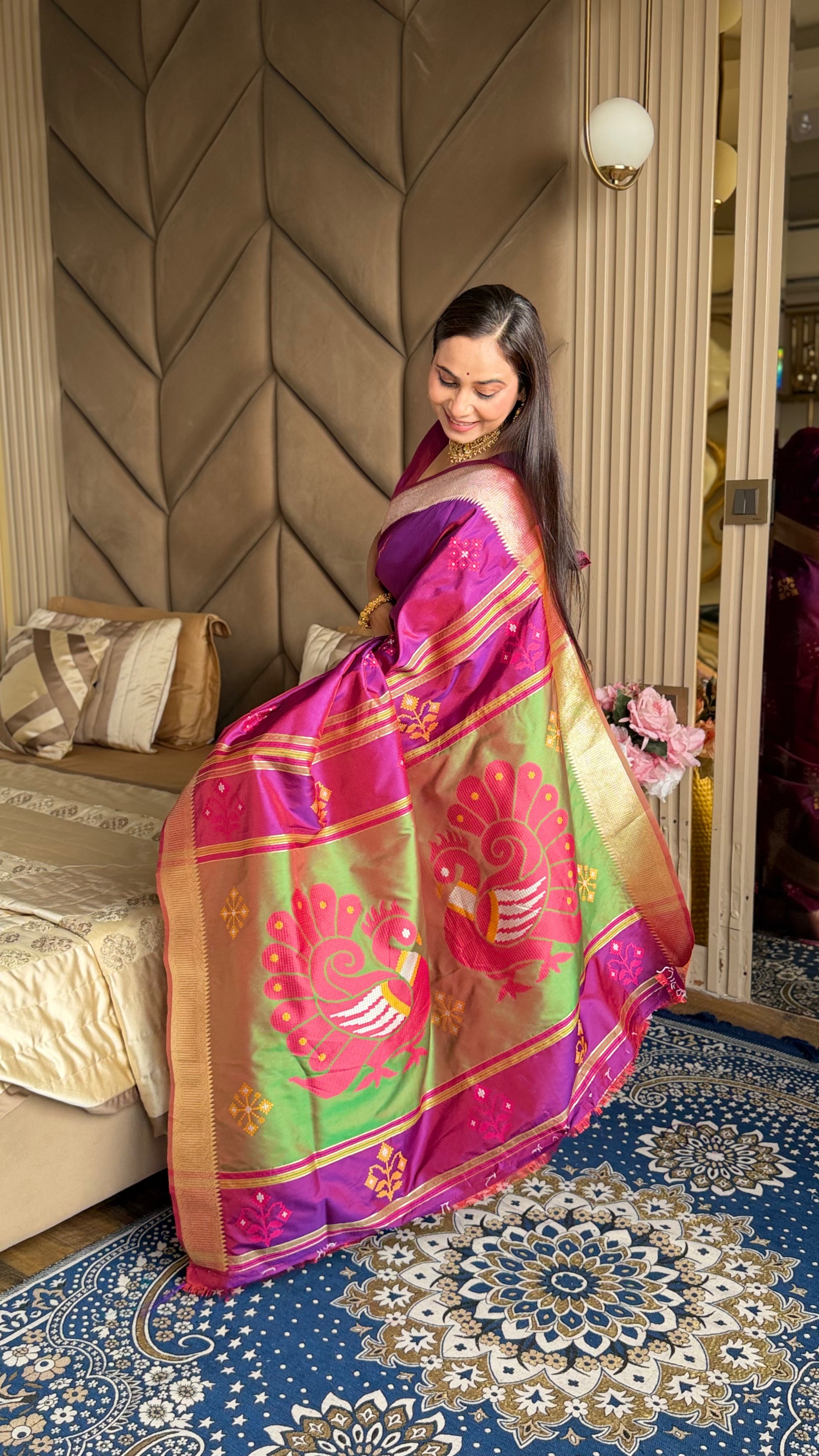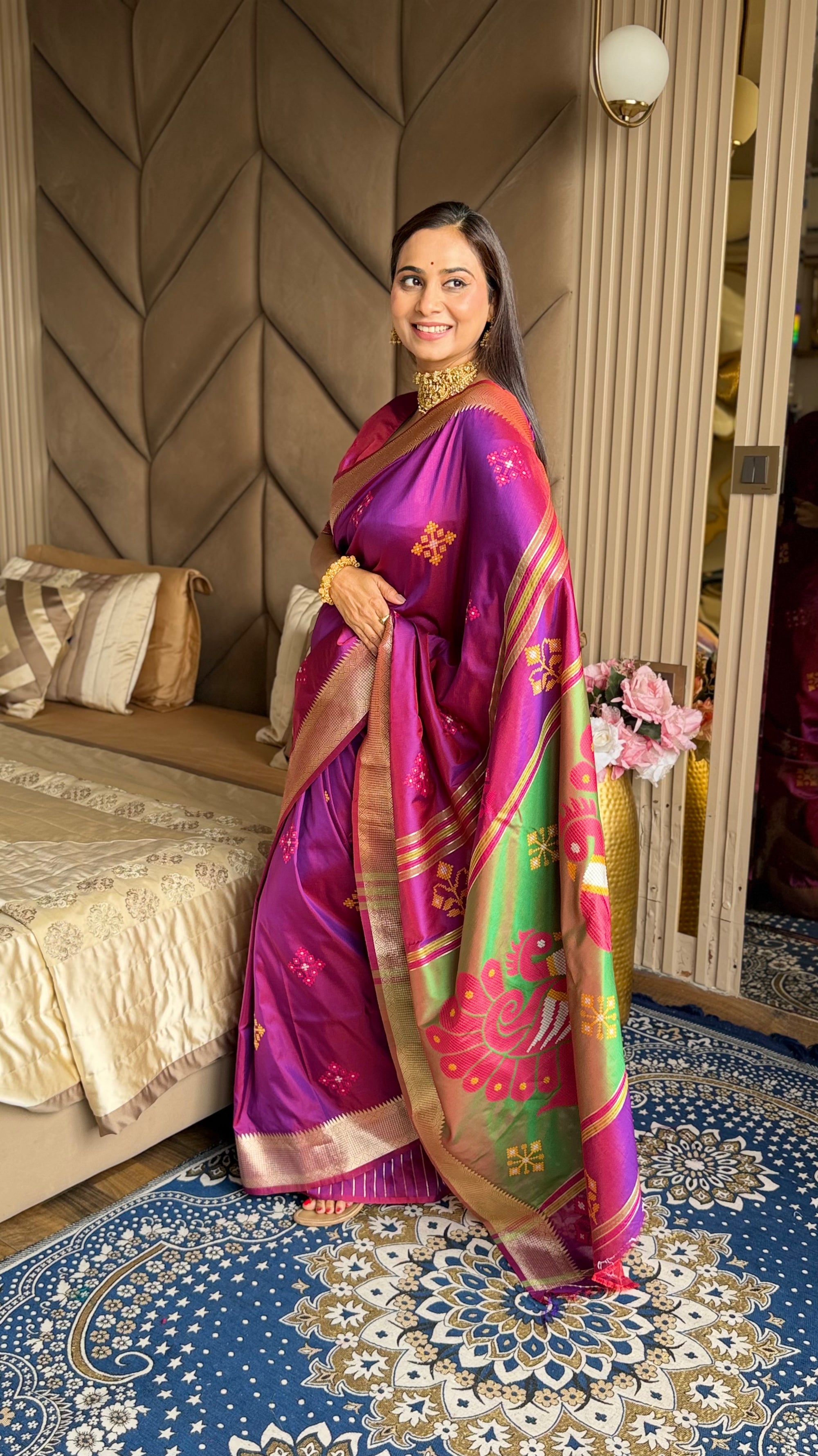 Magenta Soft Silk Ikkat Patola Saree with Meenakari Motifs Peacock Pallu and Gold Zari Border