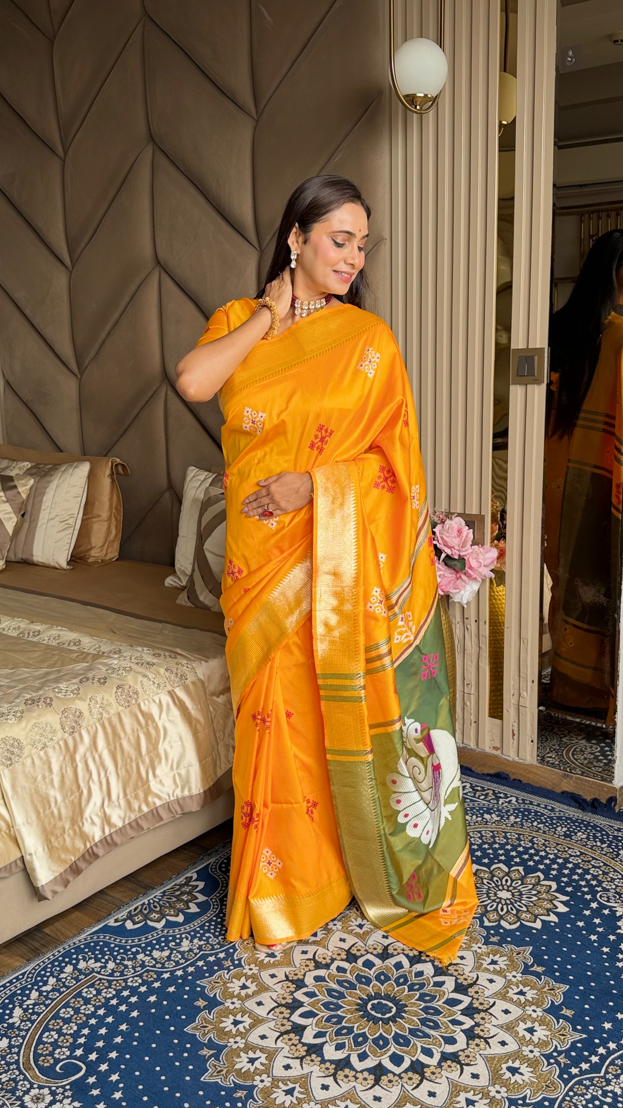 Orange Soft Silk Ikkat Patola Saree with Meenakari Motifs Peacock Pallu and Gold Zari Border