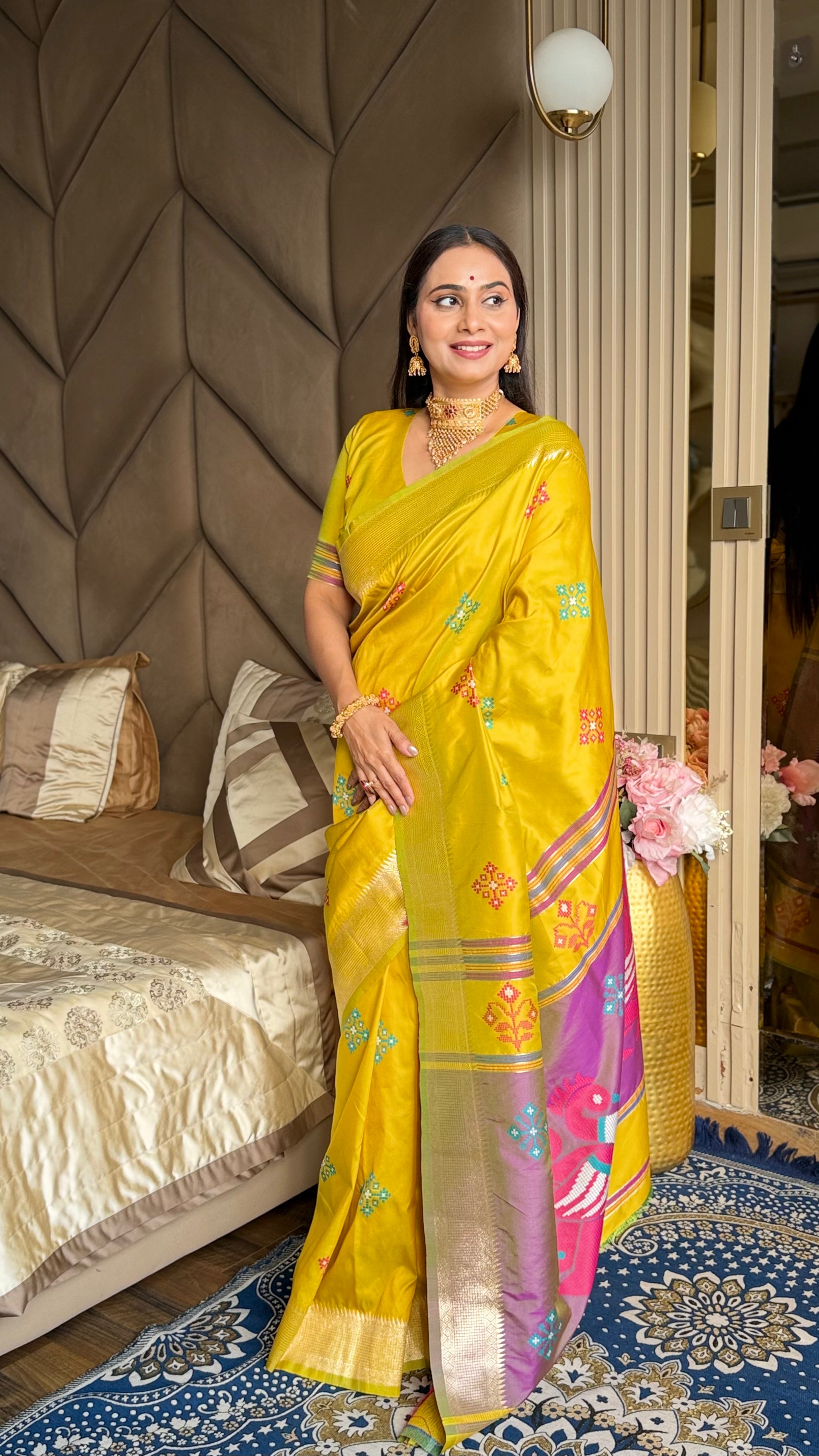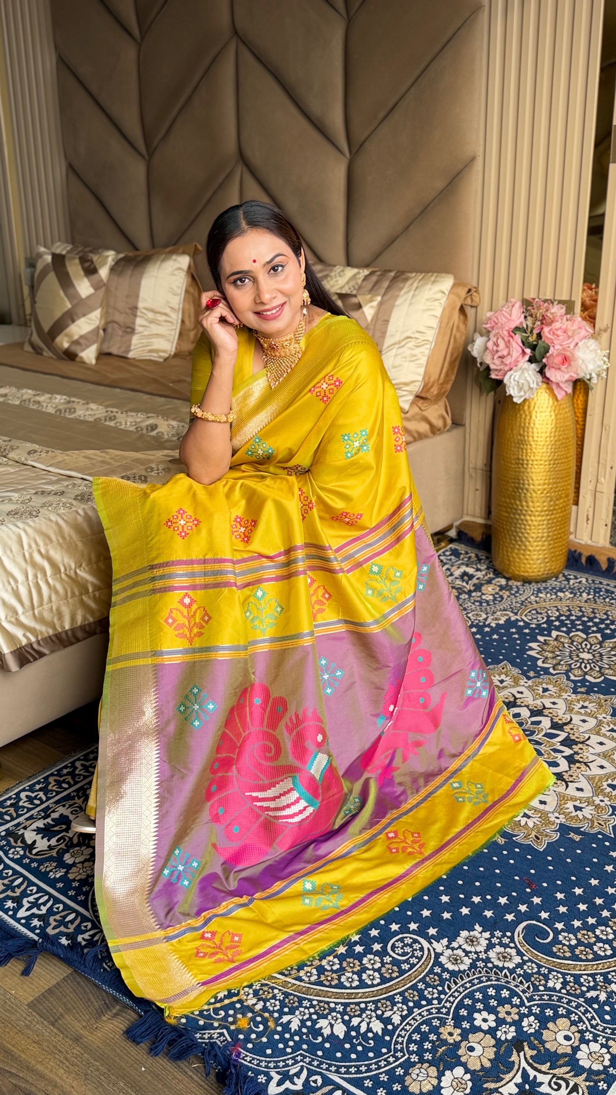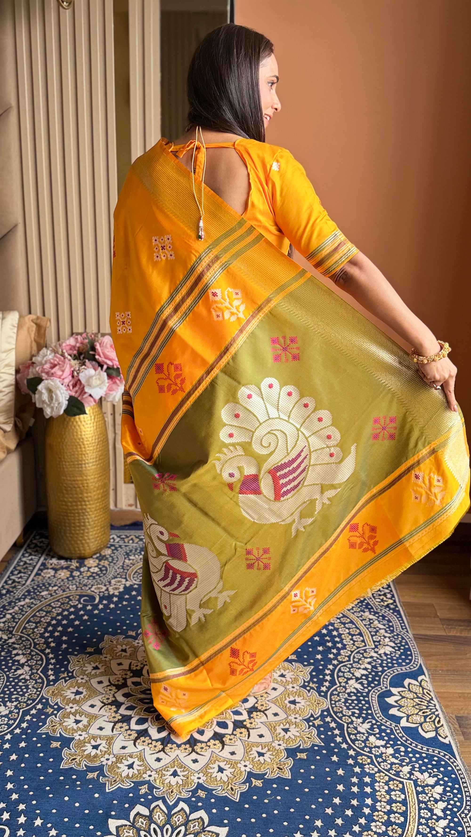 Yellow Soft Silk Ikkat Patola Saree with Meenakari Motifs Peacock Pallu and Gold Zari Border