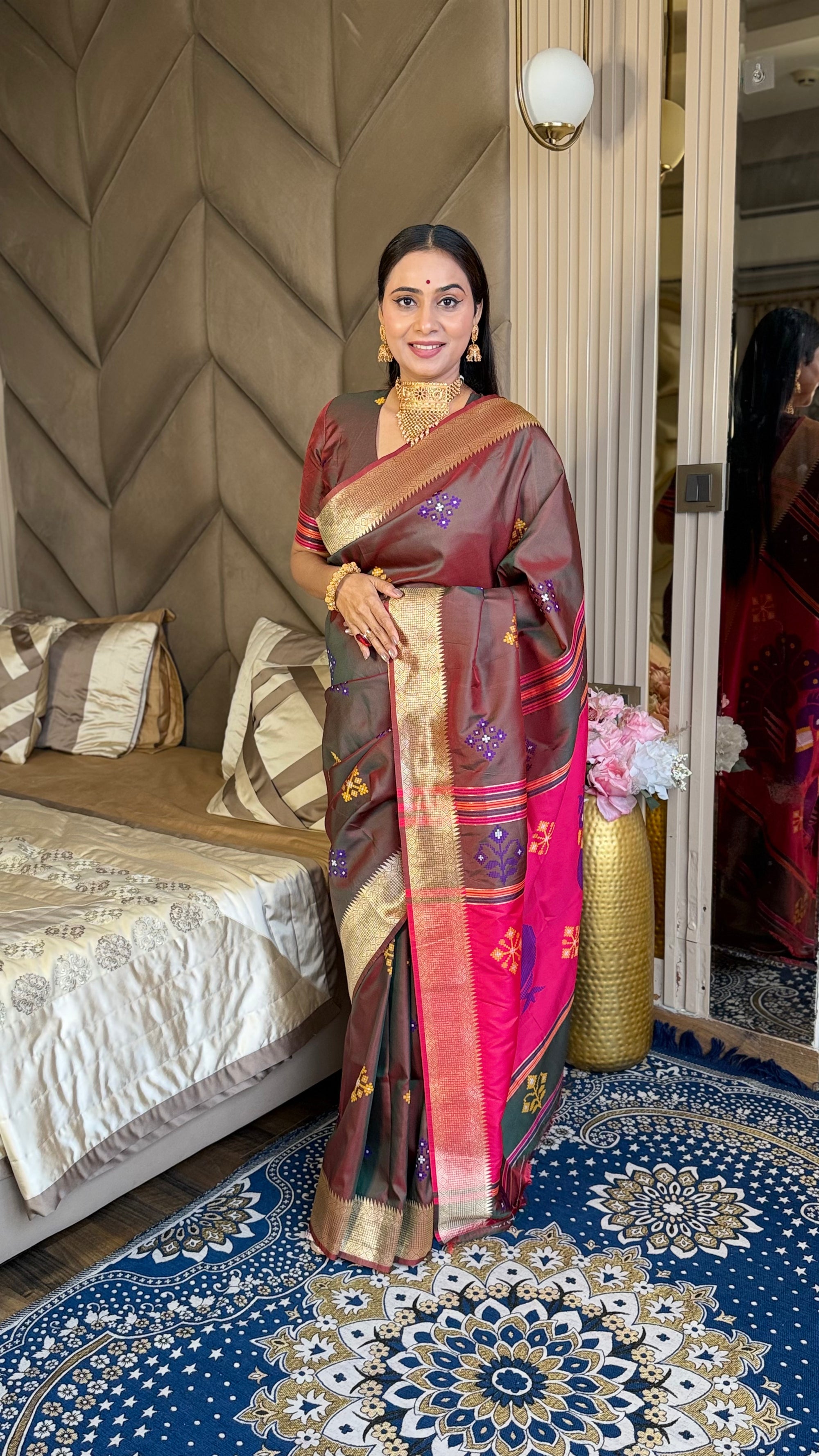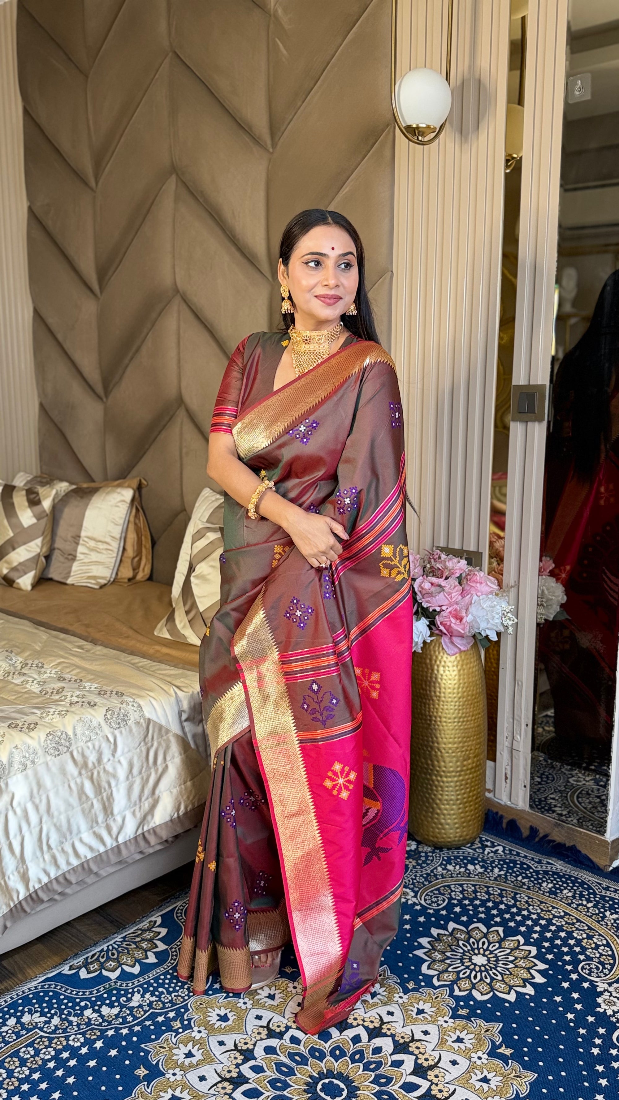 Coffee Soft Silk Ikkat Patola Saree with Meenakari Motifs Peacock Pallu and Gold Zari Border