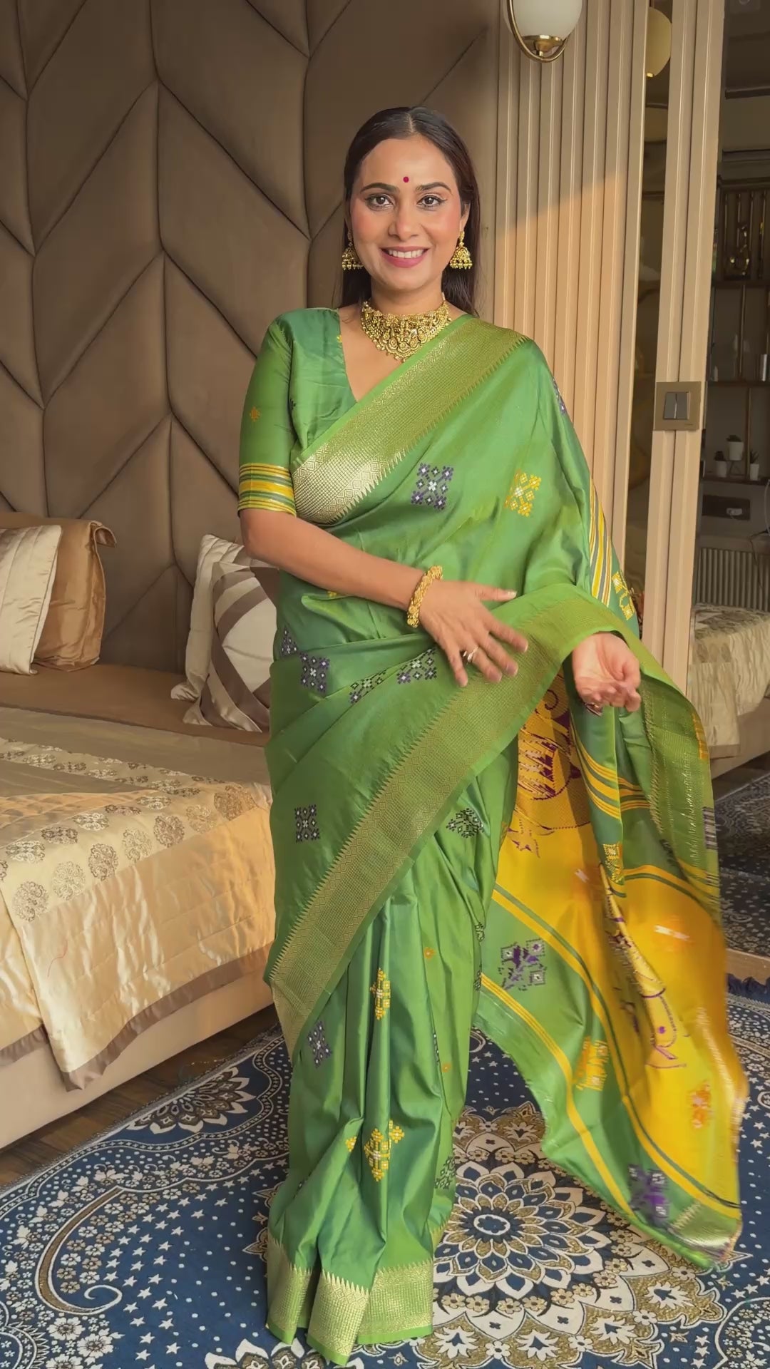 Mehendi Soft Silk Ikkat Patola Saree with Meenakari Motifs Peacock Pallu and Gold Zari Border