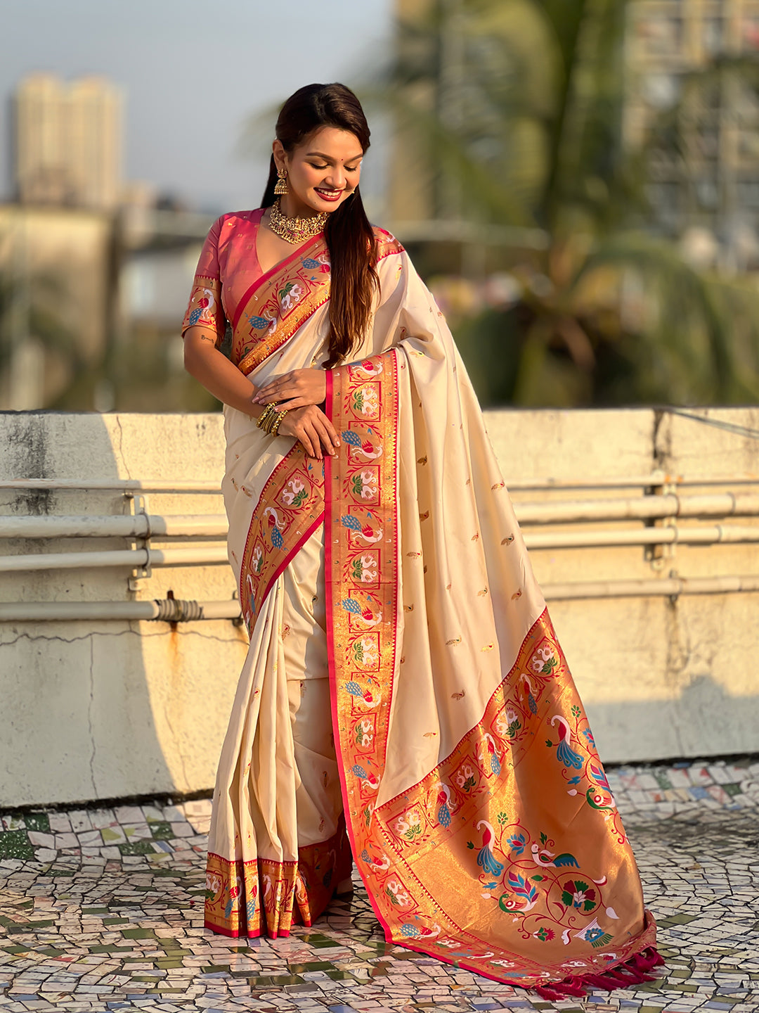 Cream Soft Silk Lotus Paithani Saree