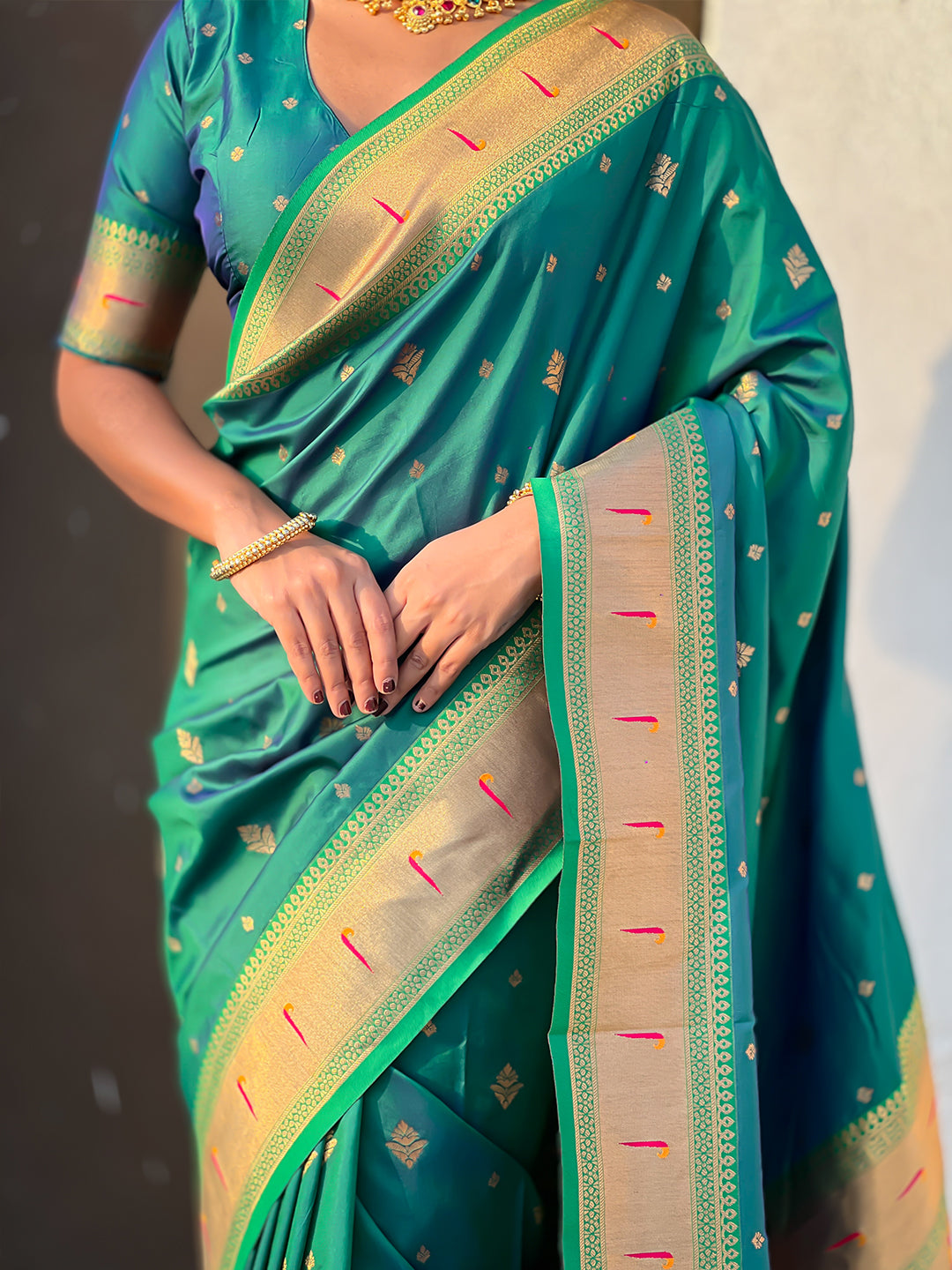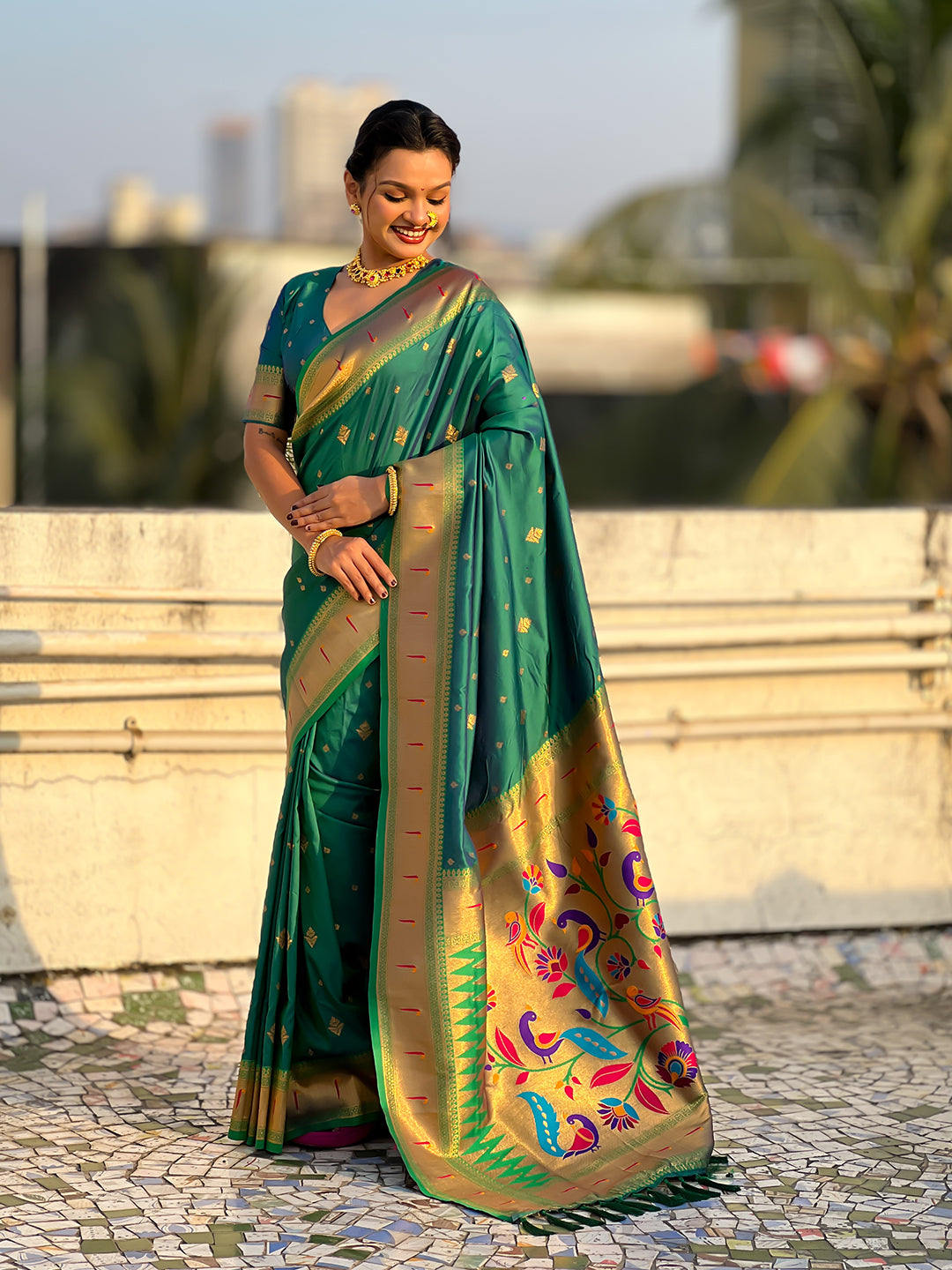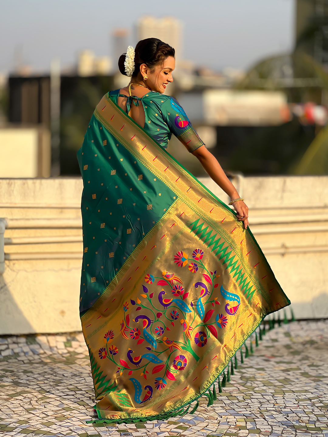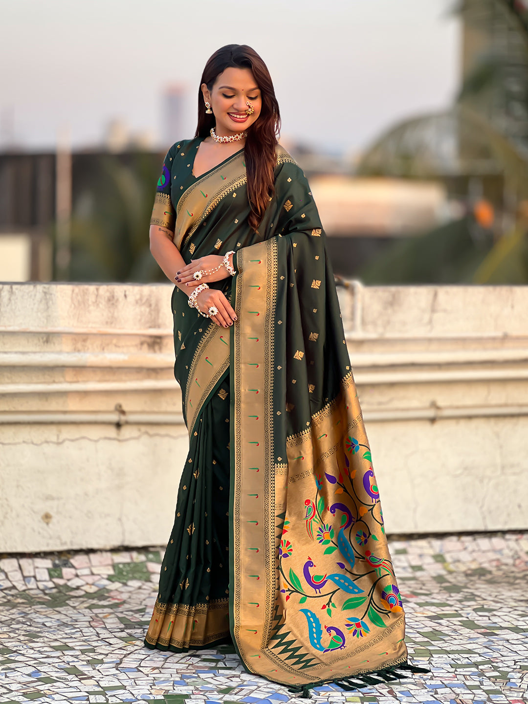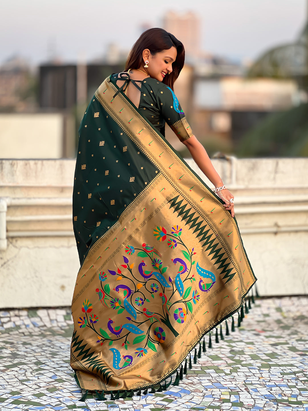 Bottle Green Peacock Paithani Zari Woven Saree