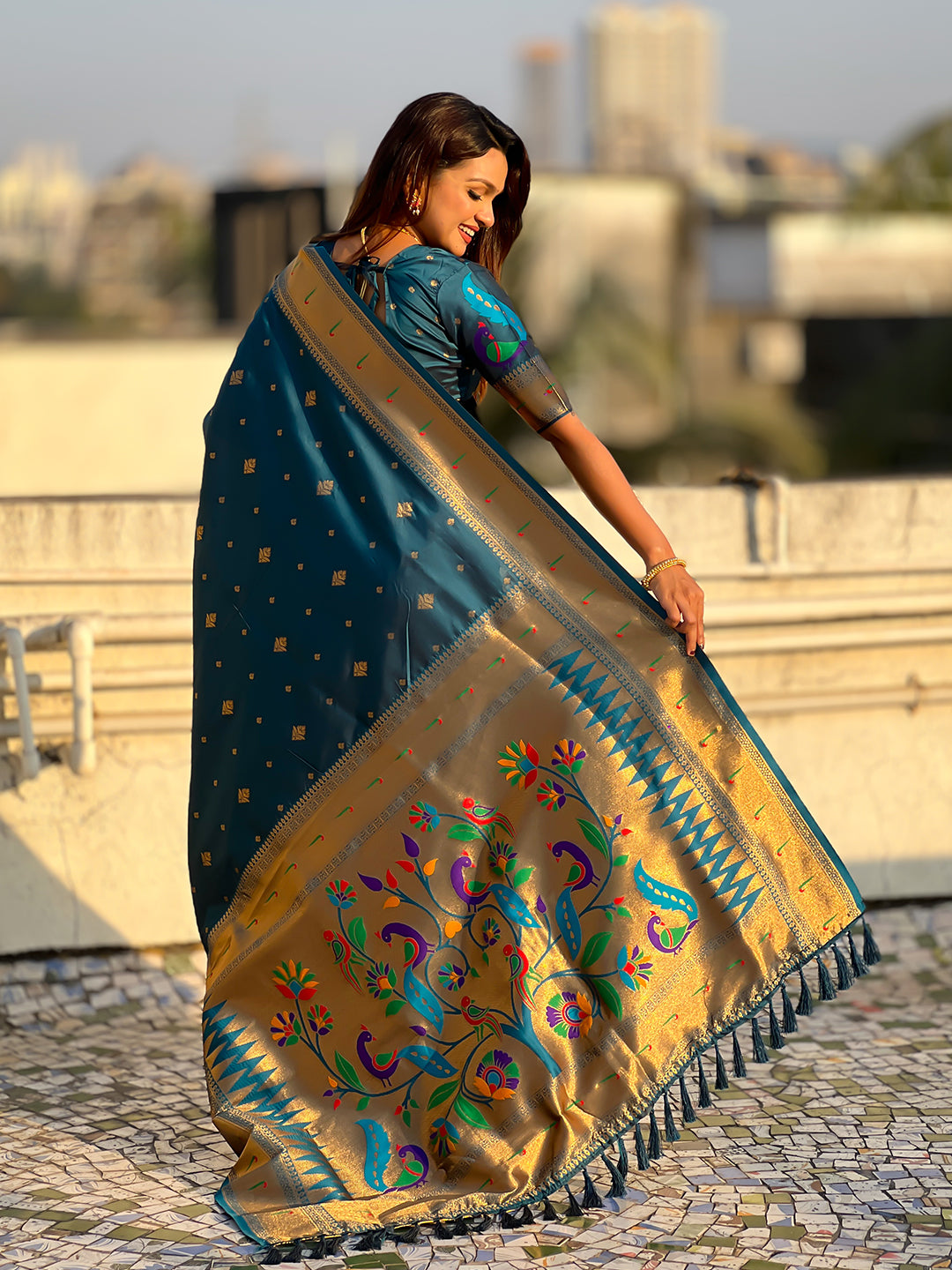 Denim Blue Peacock Paithani Zari Woven Saree