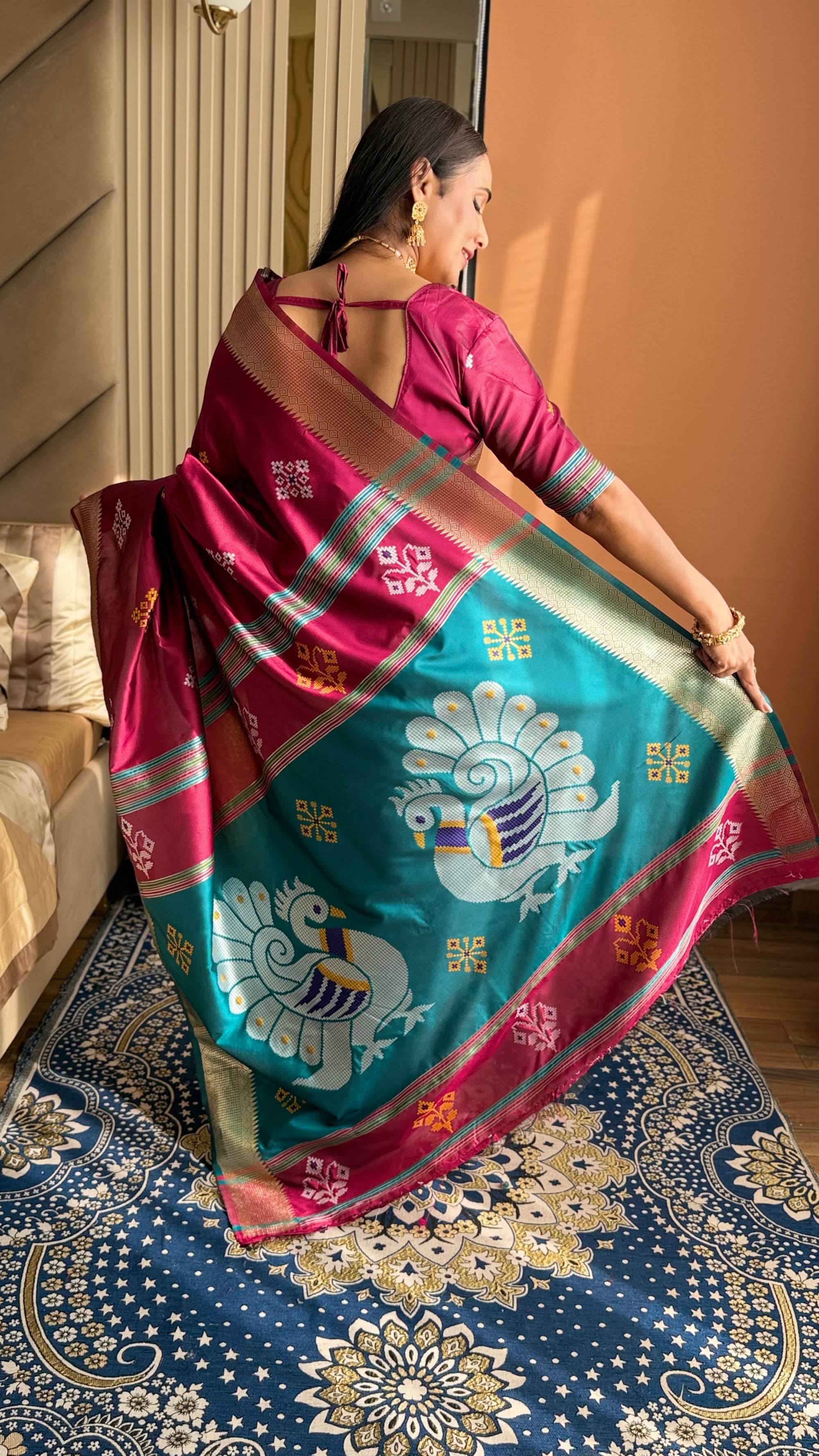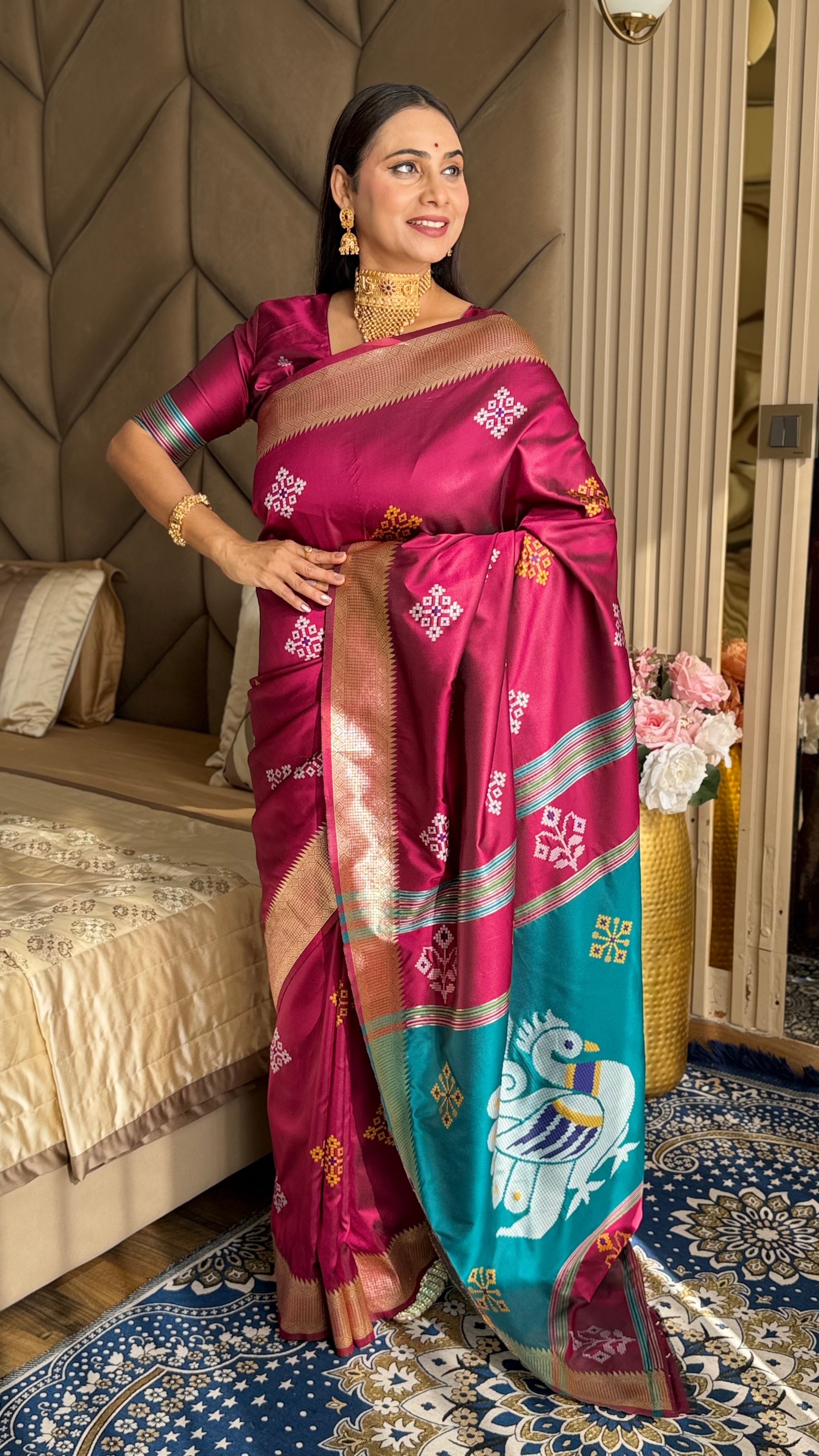 Magenta Soft Silk Ikkat Patola Saree with Meenakari Motifs Peacock Pallu and Gold Zari Border