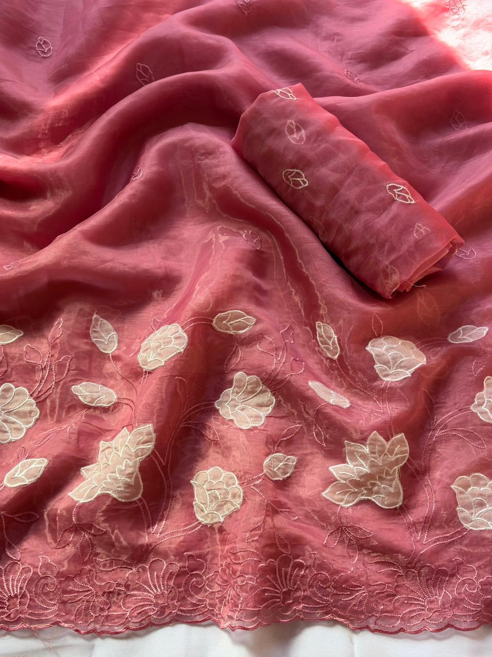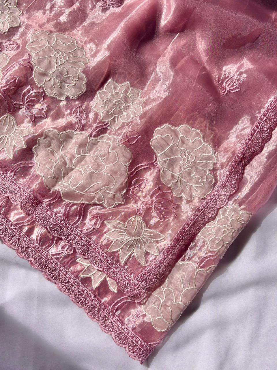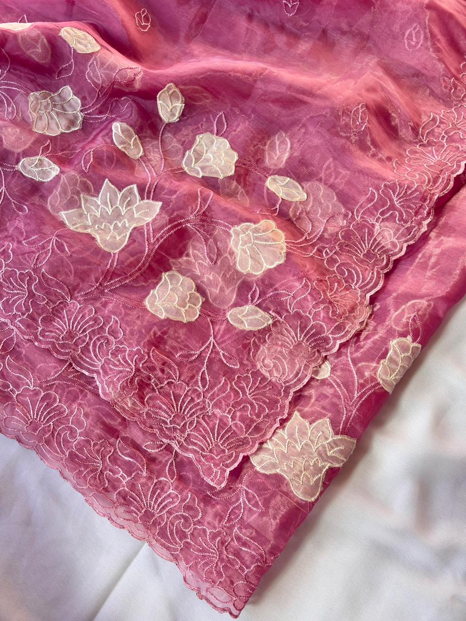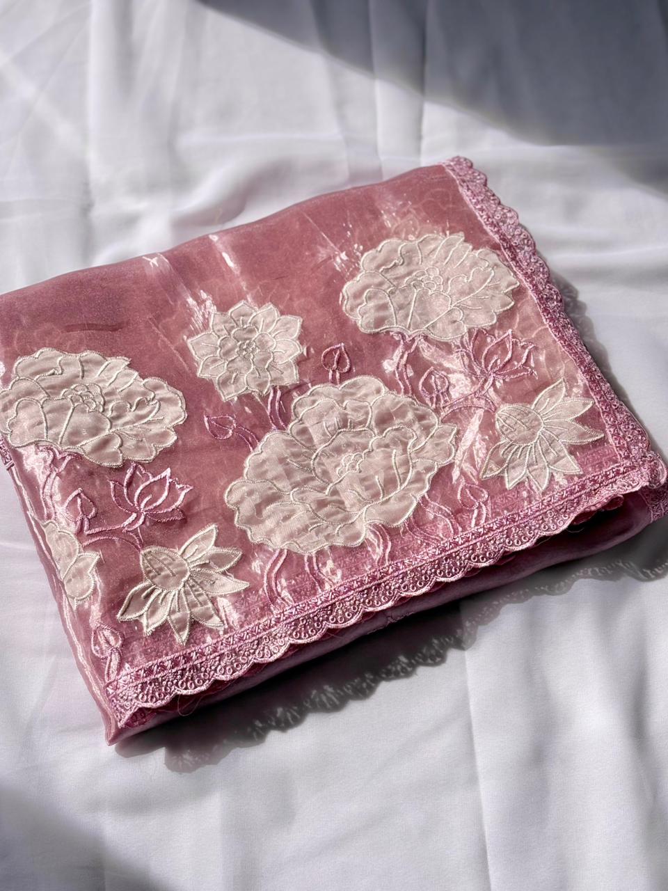 Pink Pure Oris Silk Applique Work Designer Saree
