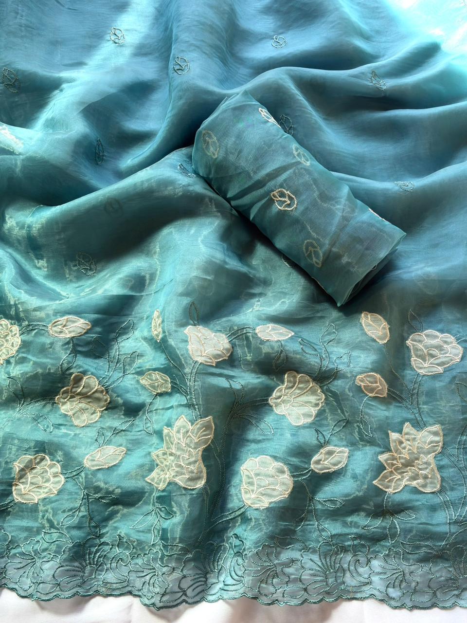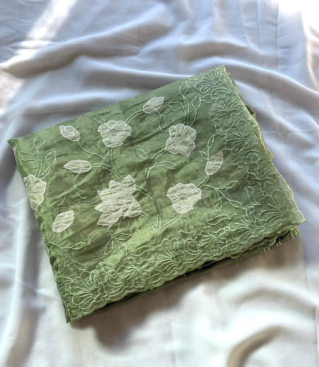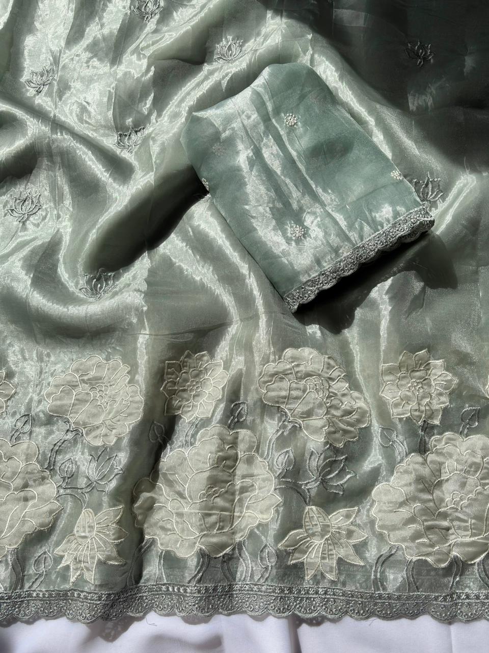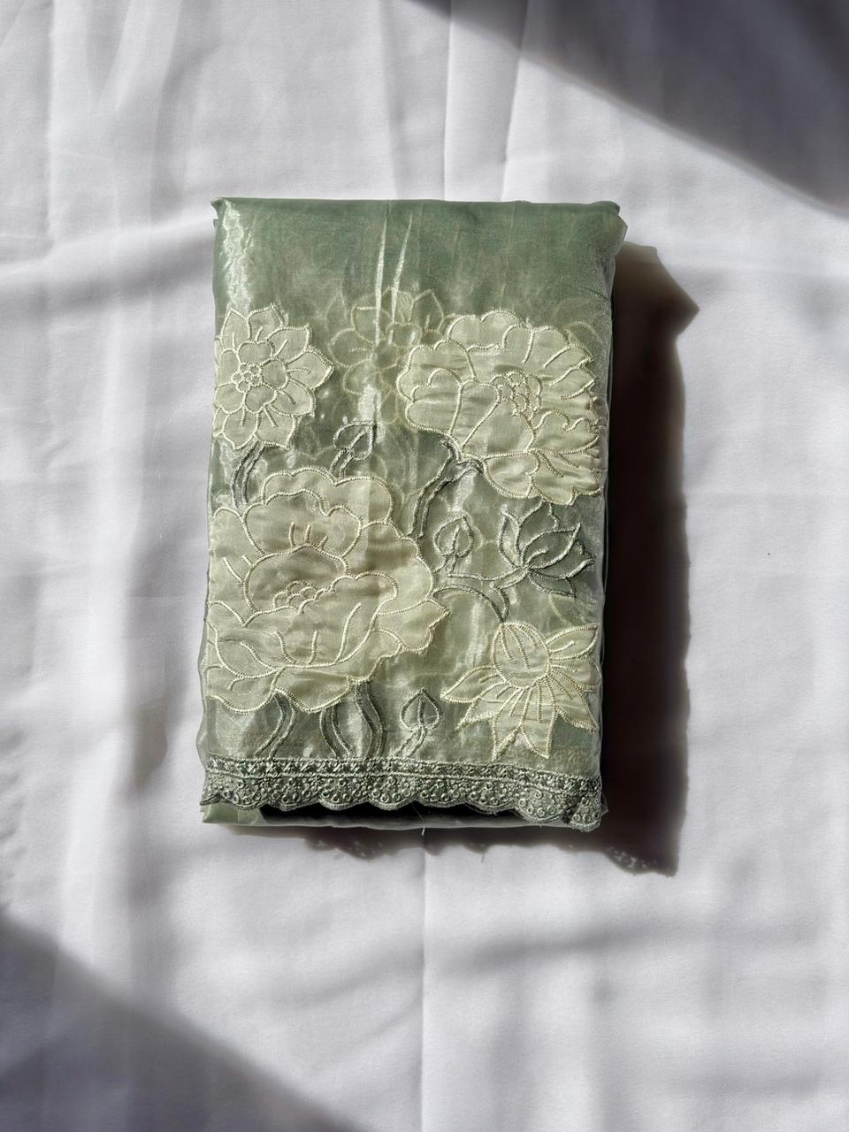 Pista Green Pure Oris Silk Applique Work Designer Saree