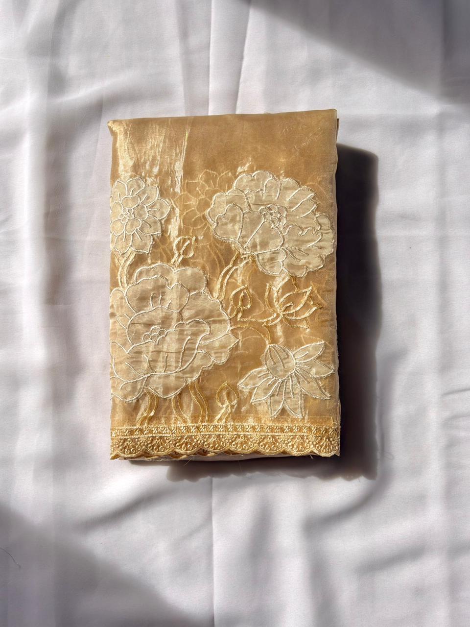 Yellow Pure Oris Silk Applique Work Designer Saree