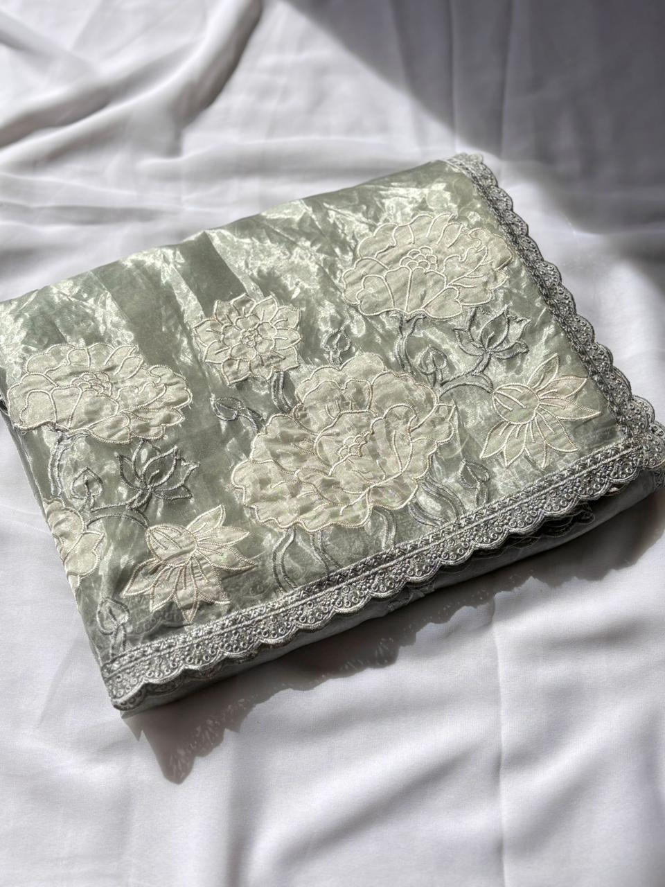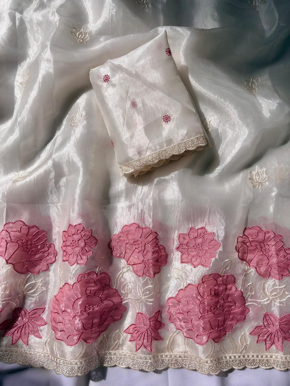 White Pure Oris Silk Applique Work Designer Saree