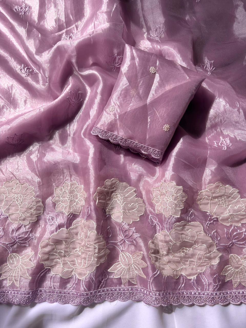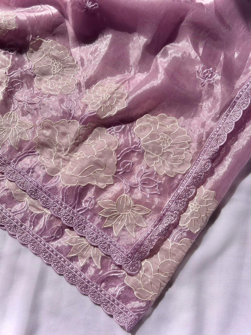 Lavender Pure Oris Silk Applique Work Designer Saree